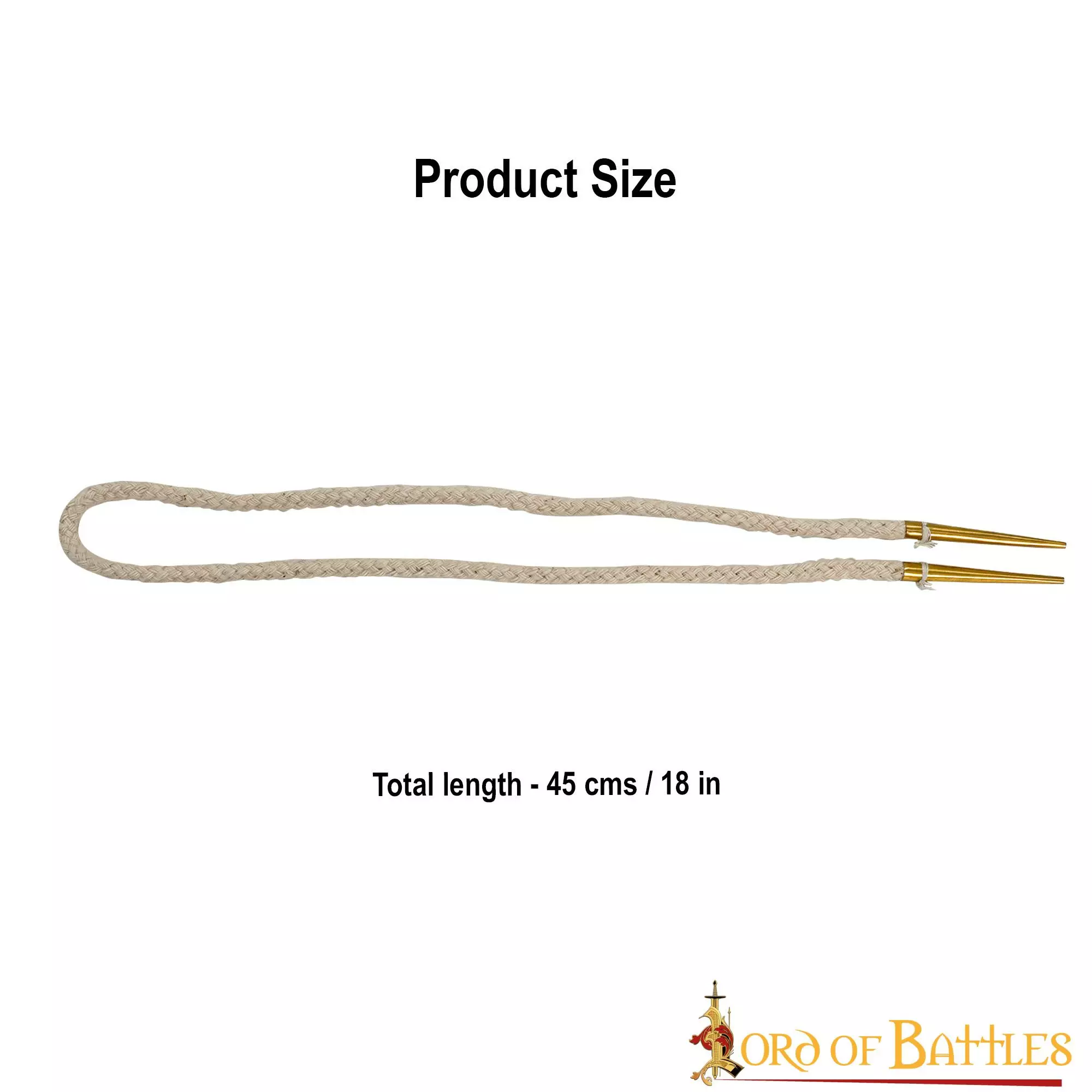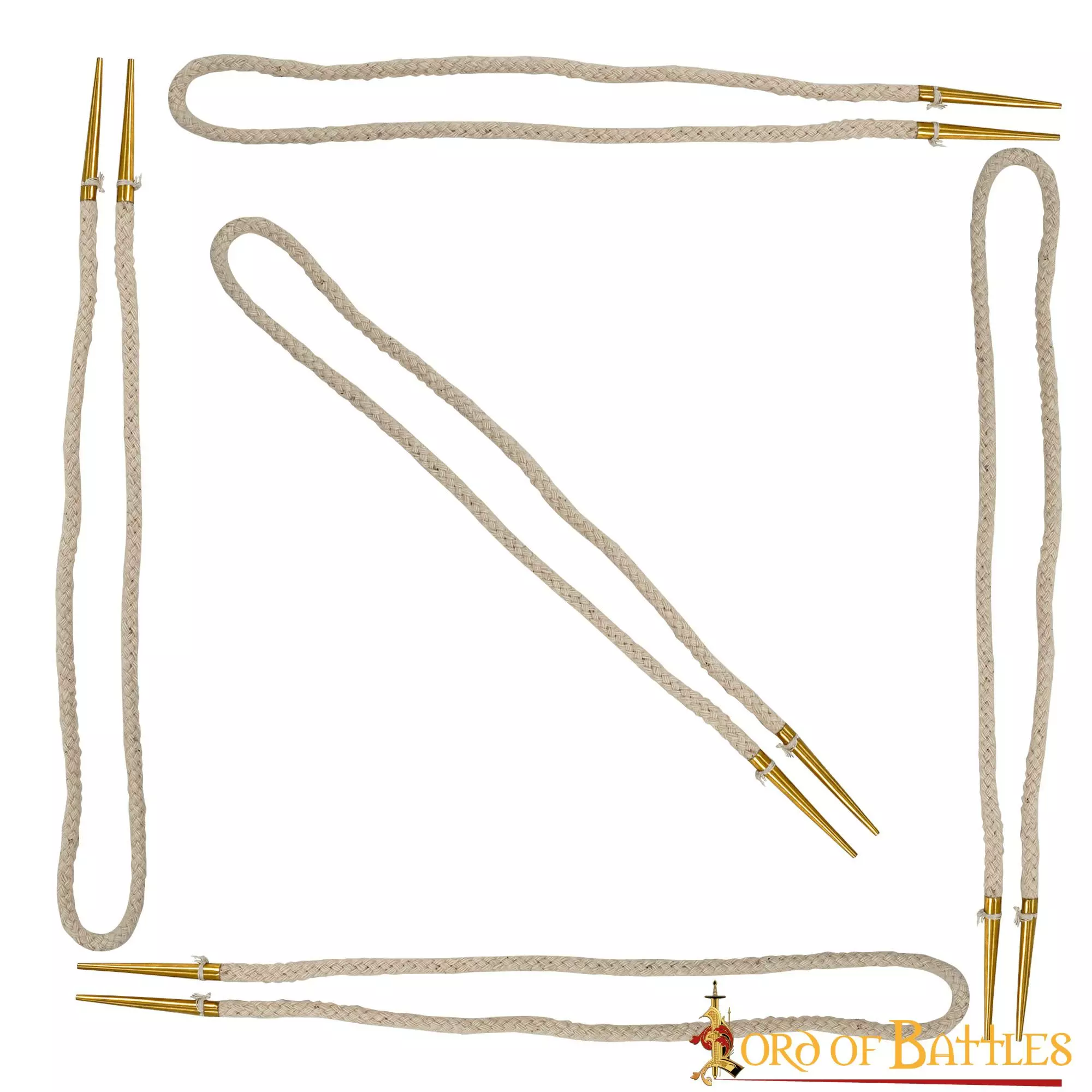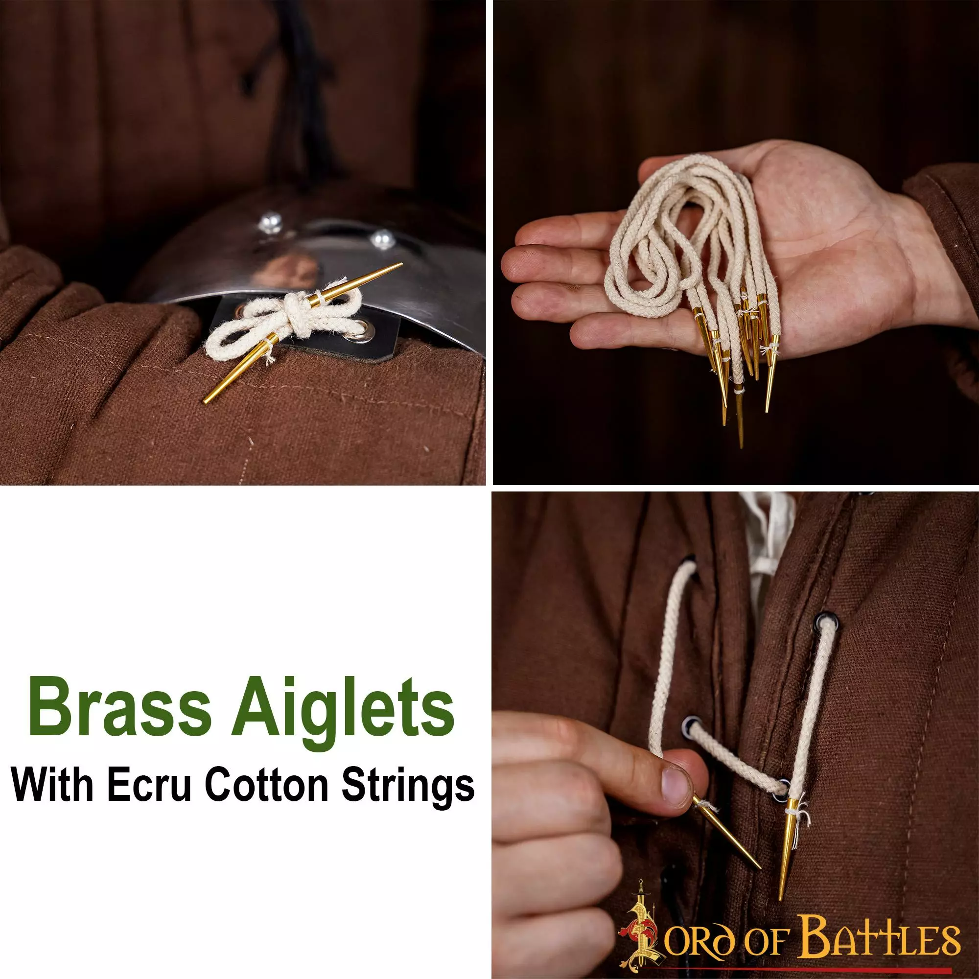 Ata firmemente tu armadura de placas a tu gambesón o simplemente adorna tu vestido medieval con nuestro juego de preciosos aiglets de latón. Las cuerdas de algodón cuidadosamente trenzadas están unidas a aiglets de latón macizo. La longitud total (incluidos los aiglets de latón) es de aproximadamente 45 cm.