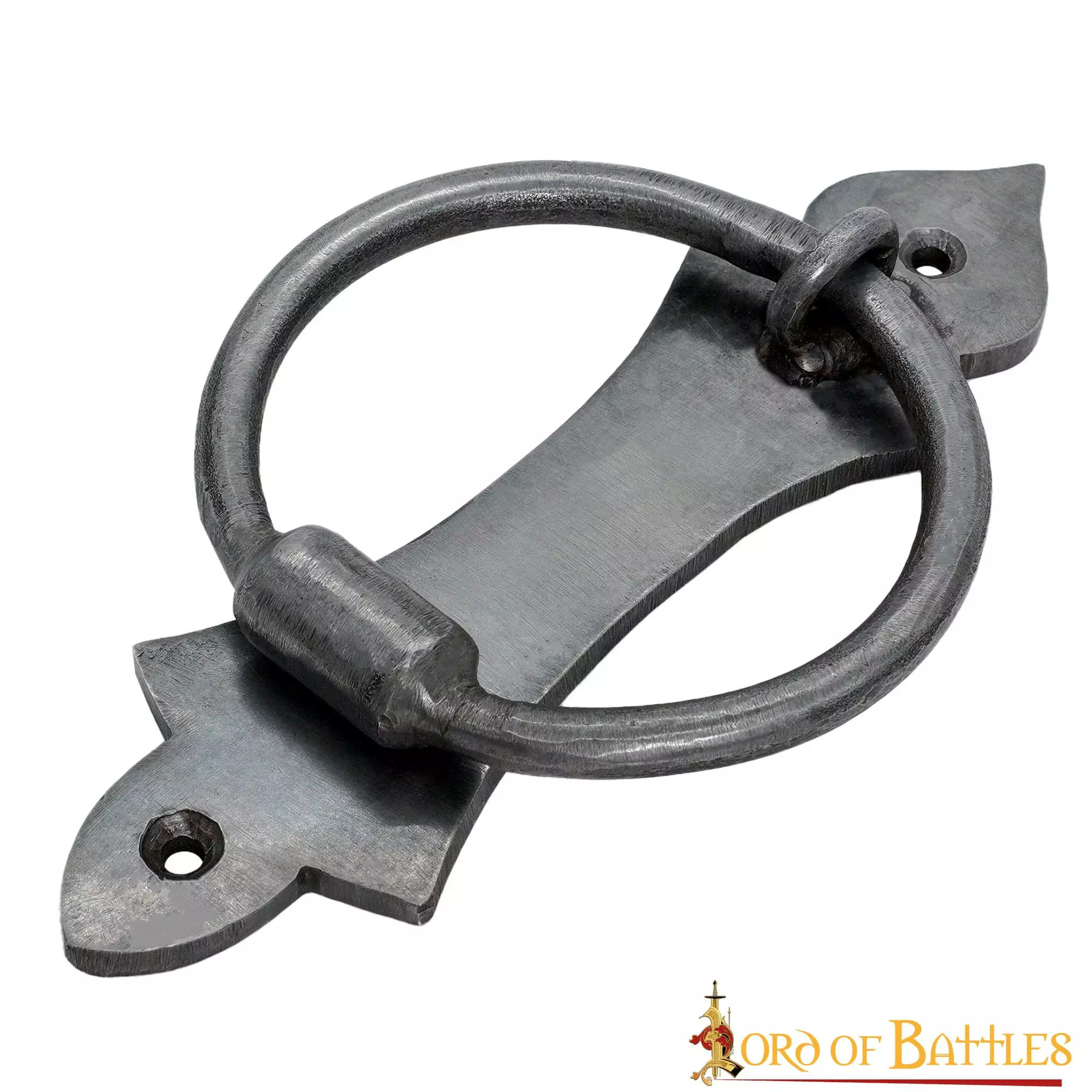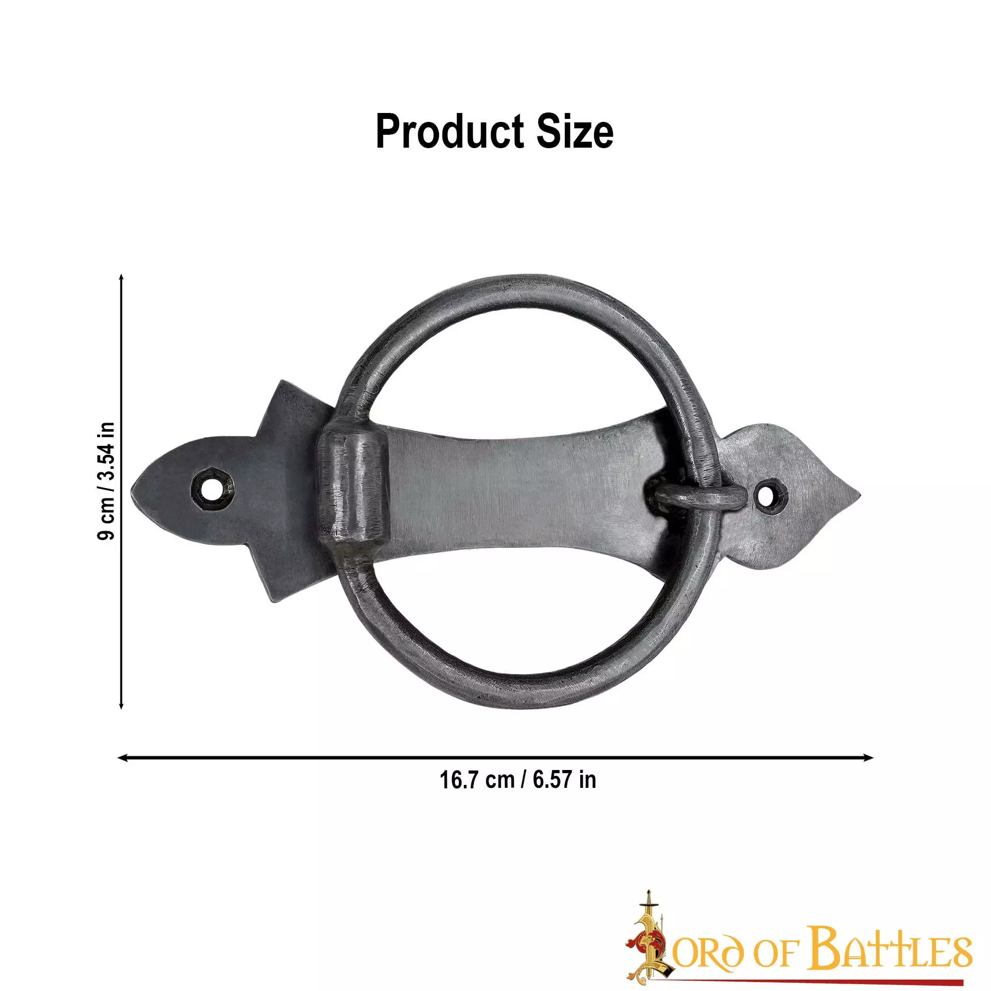 FORJADO A MANO en robusto HIERRO, está bien diseñado para mejorar su funcionalidad, convirtiéndolo en un elemento imprescindible para cualquier entorno, medieval o contemporáneo. Su longitud es de 16,7 cm y el diámetro del anillo es de aproximadamente 9 cm.