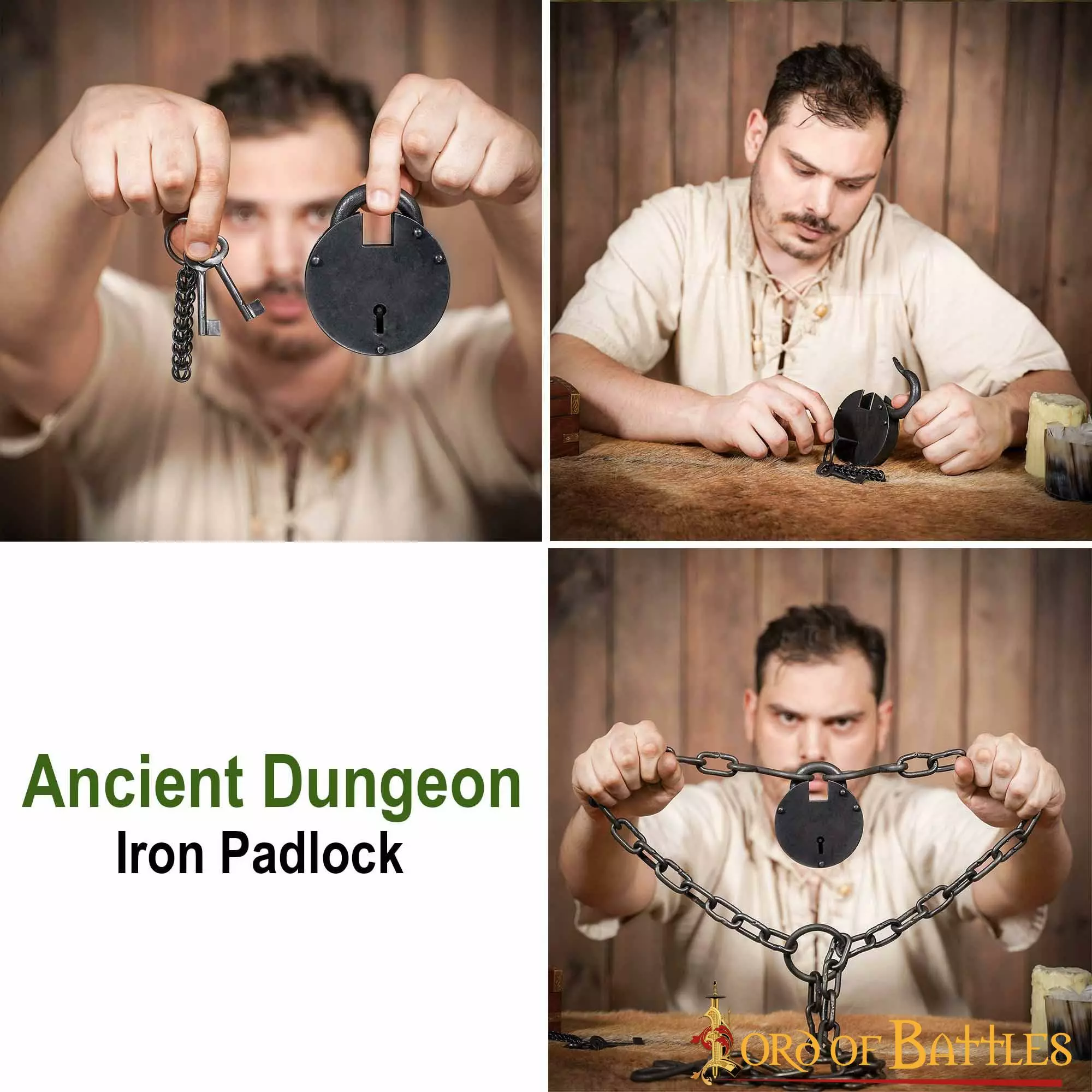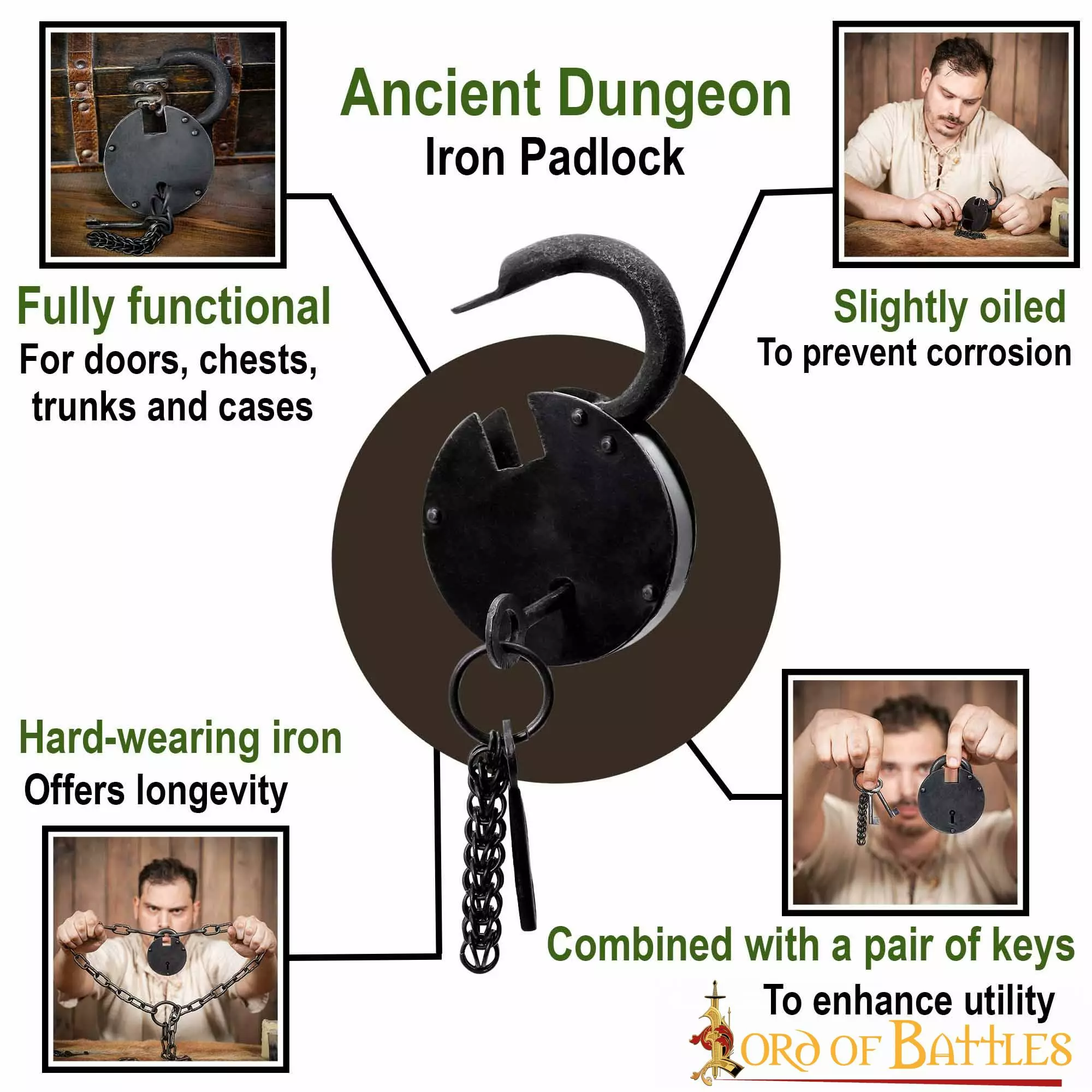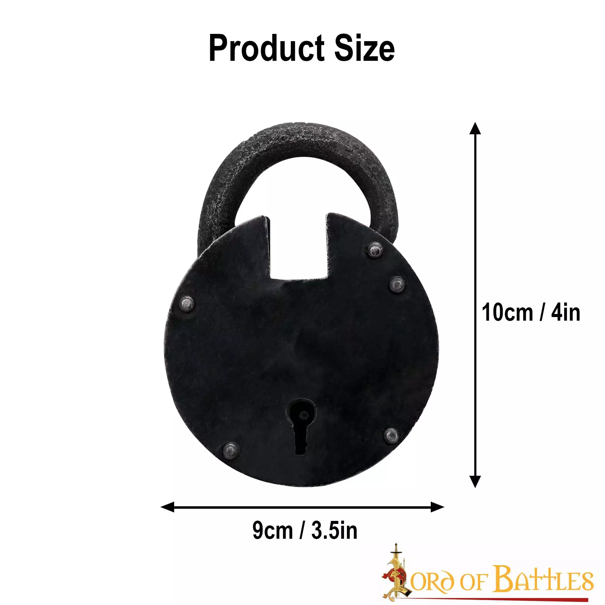 Está FORJADO A MANO en HIERRO para darle ese aspecto medieval. Con este candado se suministra un juego de dos llaves, sujetas a un llavero de cota de malla. Sus dimensiones totales son (10 X 9) cm. También puede usarse en ambientes contemporáneos.