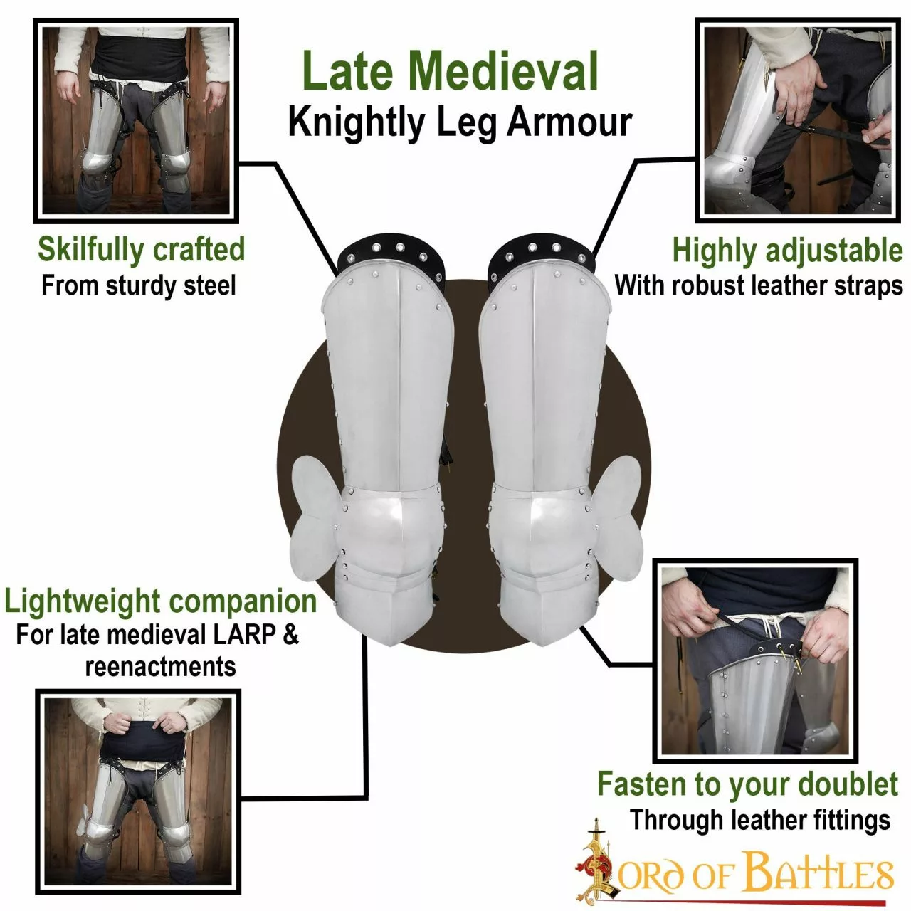 Varias CORREAS ROBUSTAS DE CUERO GENUINO ayudan a sujetar cómodamente la armadura de tus piernas intactas. No olvides atarlas también a tu pechera, gambesón o cinturón, ¡y estarás listo para cargar contra tus enemigos! Su longitud total es de 53 cm, con una anchura en la parte superior del muslo y en la parte inferior de la pantorrilla de 20 cm y 13 cm, respectivamente. Son totalmente funcionales e ideales para LARP y recreaciones.