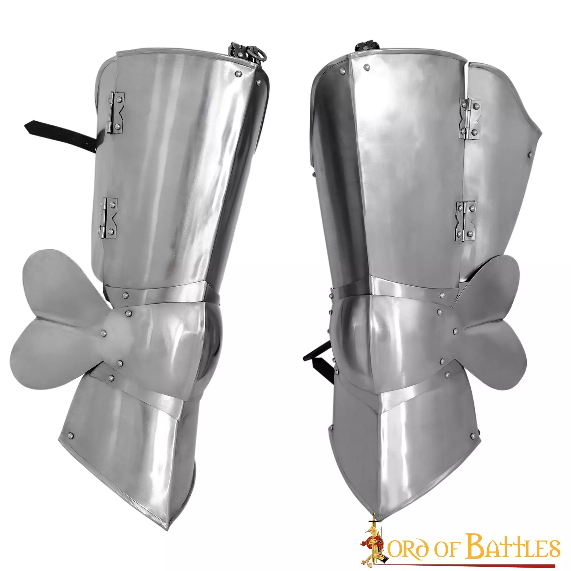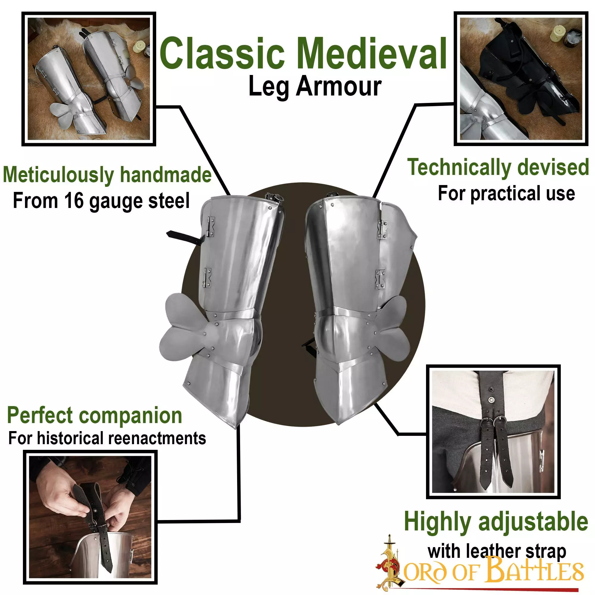 Varias CORREAS DE CUERO GENUINO ROBUSTO ayudan a sujetar cómodamente la armadura de tus piernas en su sitio. No olvides abrocharlas correctamente a tu cinturón y estarás listo para derrotar a tus enemigos.