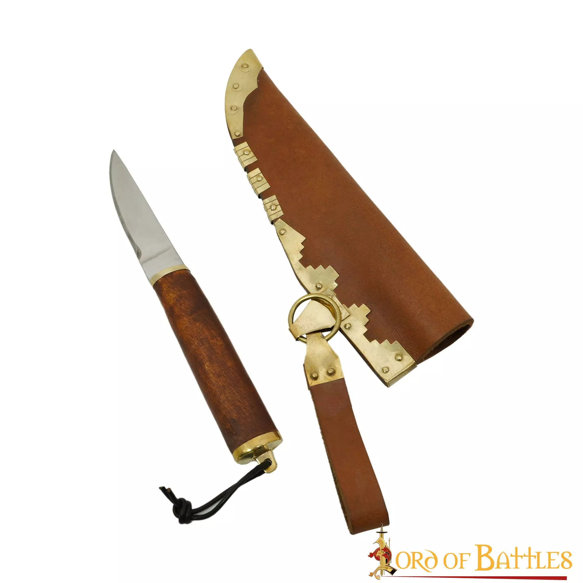 FORJADO A MANO de ACERO AL CARBONO, este cuchillo viene con un mango de madera. La FUNDA DE CUERO GENUINO está bien adornada con DETALLES DE LATÓN PURO SÓLIDO, ¡es una de las características visualmente más atractivas de este cuchillo! Su longitud junto con la funda es de aprox. 22,5 cm.