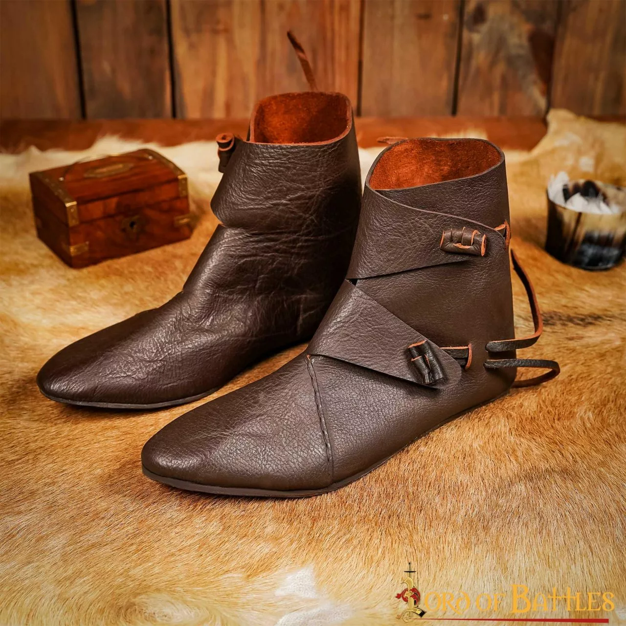 Puede que su conjunto vikingo no necesite más accesorios, ¡pero sin duda necesita un par de botas vikingas históricas! Inspiradas históricamente en los hallazgos arqueológicos de Jorvik, este par de botas presenta varios atributos típicos de finales del siglo IX y principios del X. Su diseño bien cortado y su cuidada fabricación permiten llevarlas cómodamente durante horas, una cualidad muy apreciada por muchos recreadores y LARPers.