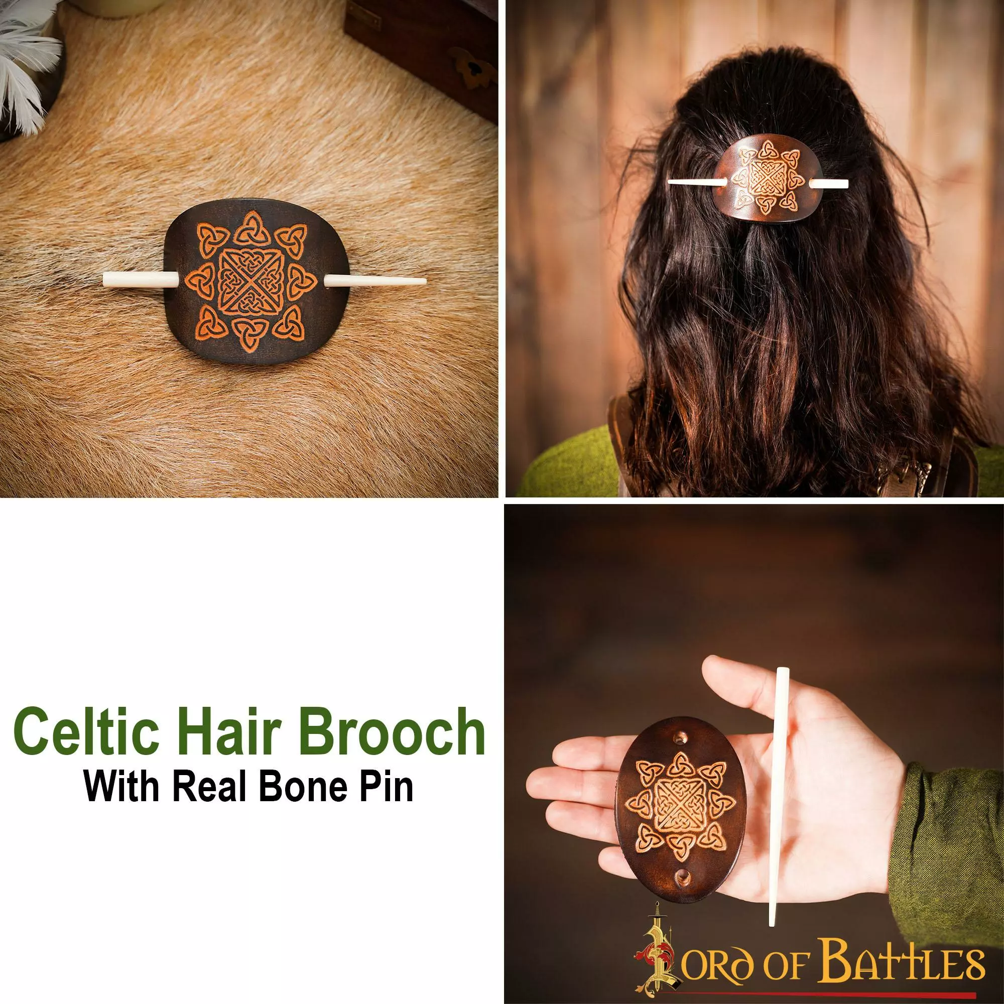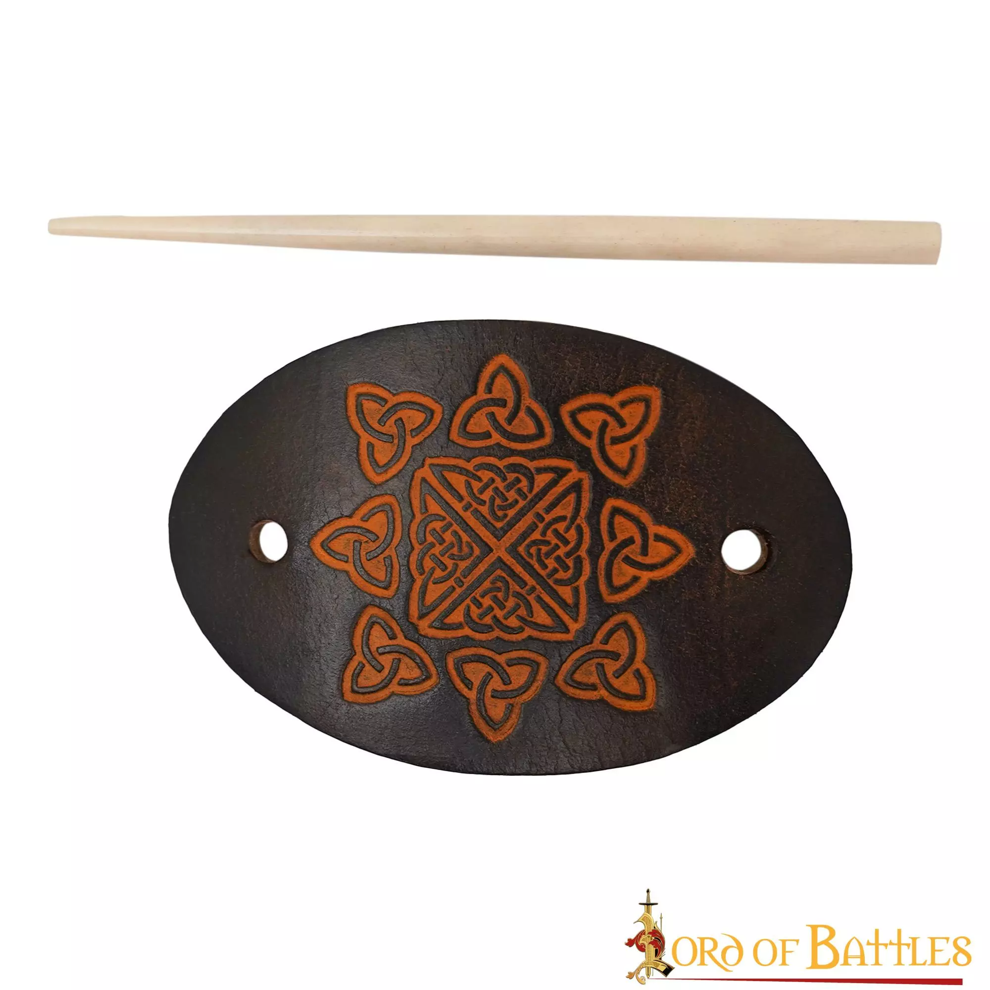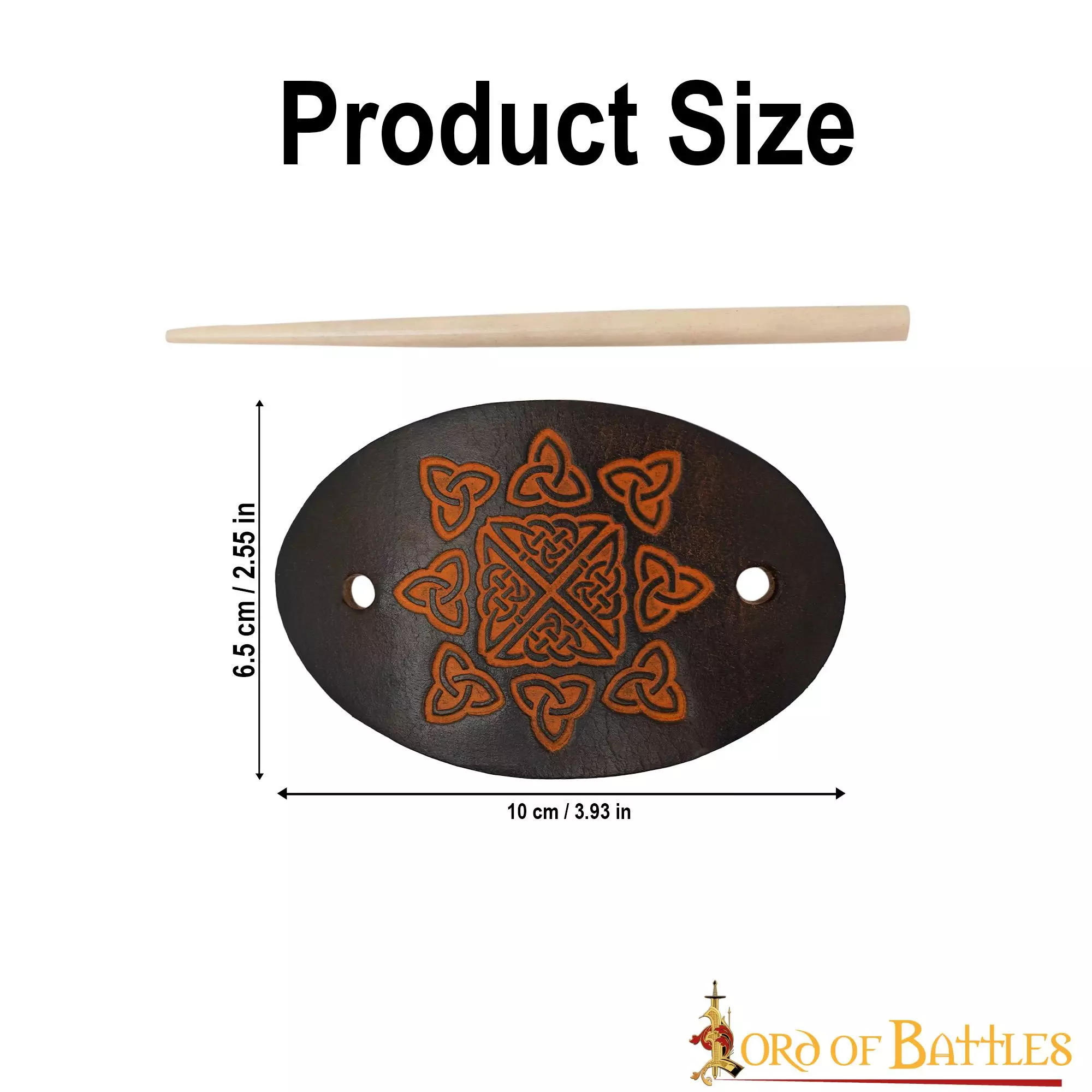 Este broche para el pelo está HECHO A MANO con CUERO GENUINO, ricamente repujado con ARTESANÍA CELTA, ofreciendo una gran durabilidad y longevidad. Para sujetar el broche se ha añadido un alfiler de hueso de origen ético que lo convierte en un accesorio auténtico y bien diseñado. El broche mide aprox. (10 X 6,5) cm y es ideal para LARP, cosplay, recreaciones e incluso puede usarse a diario.