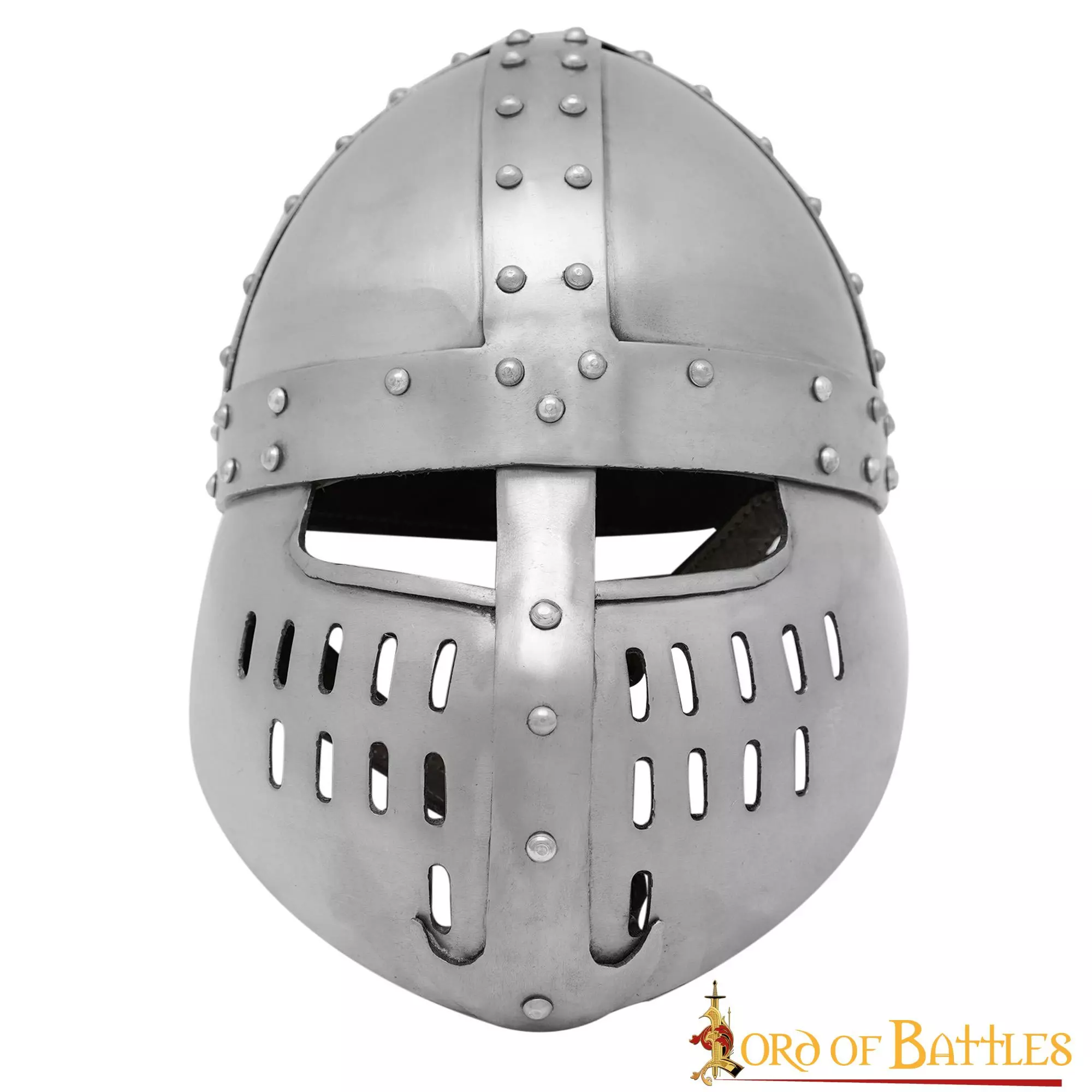 Bien diseñado y meticulosamente elaborado para un verdadero caballero normando o un intrépido cruzado, este Spangenhelm, con su robusta placa facial, completará a la perfección sus trajes de recreación de los siglos XII-XIII. La técnica de la lanza corva requería una mejor protección facial, ya que el antiguo casco nasal no evitaba los golpes mortales por encima del escudo. Se añadió una placa facial para mayor protección, que funcionaba bien contra los atacantes de frente, incluidos arqueros y jinetes.