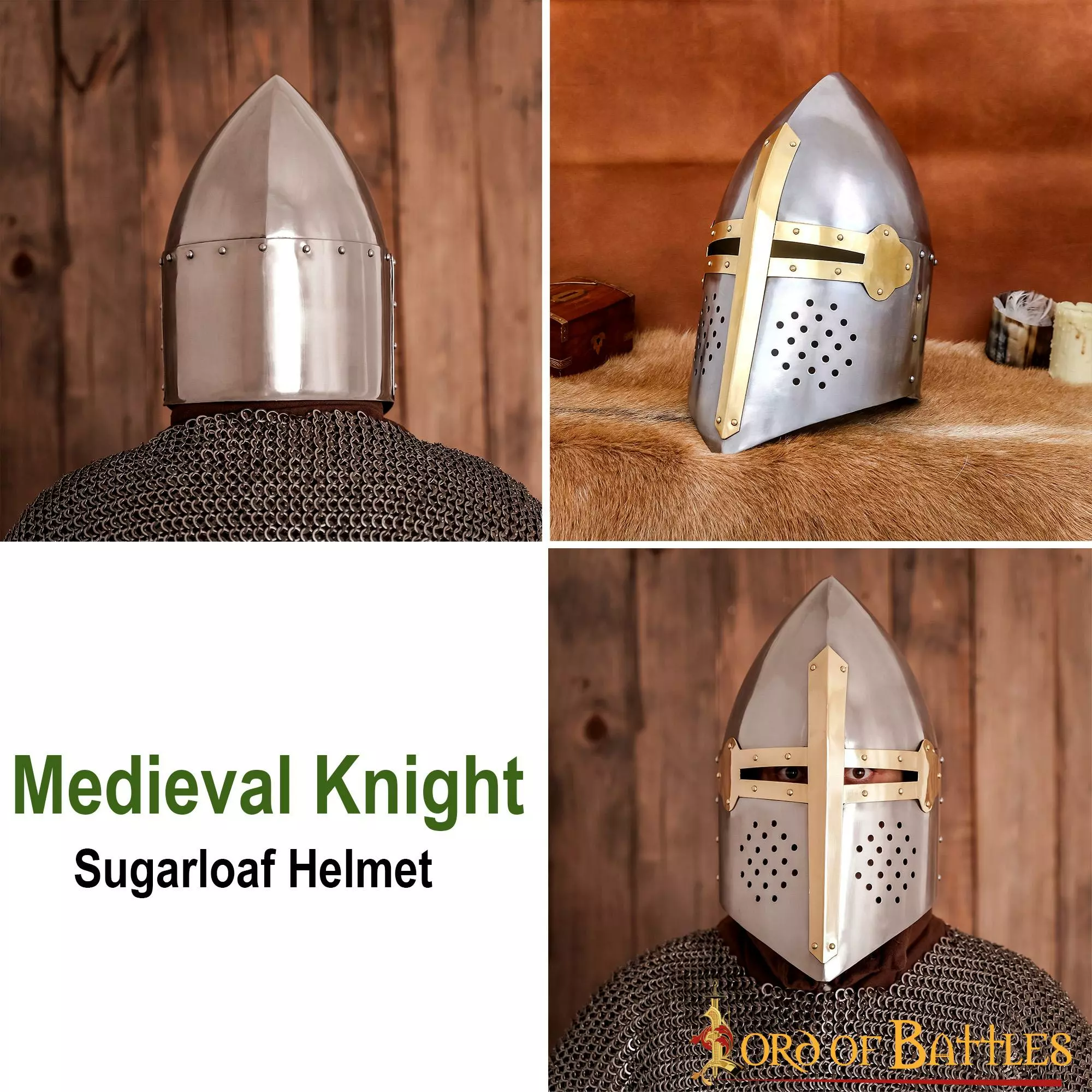 El pan de azúcar es la evolución natural del gran yelmo clásico del caballero. A medida que el siglo XIII se acercaba a su fin, el yelmo fue adoptando poco a poco una forma cada vez más puntiaguda para desviar mejor los golpes que venían de arriba durante la batalla. La introducción del nuevo casco supuso una mejora significativa con respecto a la versión anterior de punta plana, lo que llevó a su rápida adopción por parte de los caballeros de toda Europa. ¿Planeas tu próxima cruzada? Ponte esta armadura para sentirte como un legendario caballero cruzado.