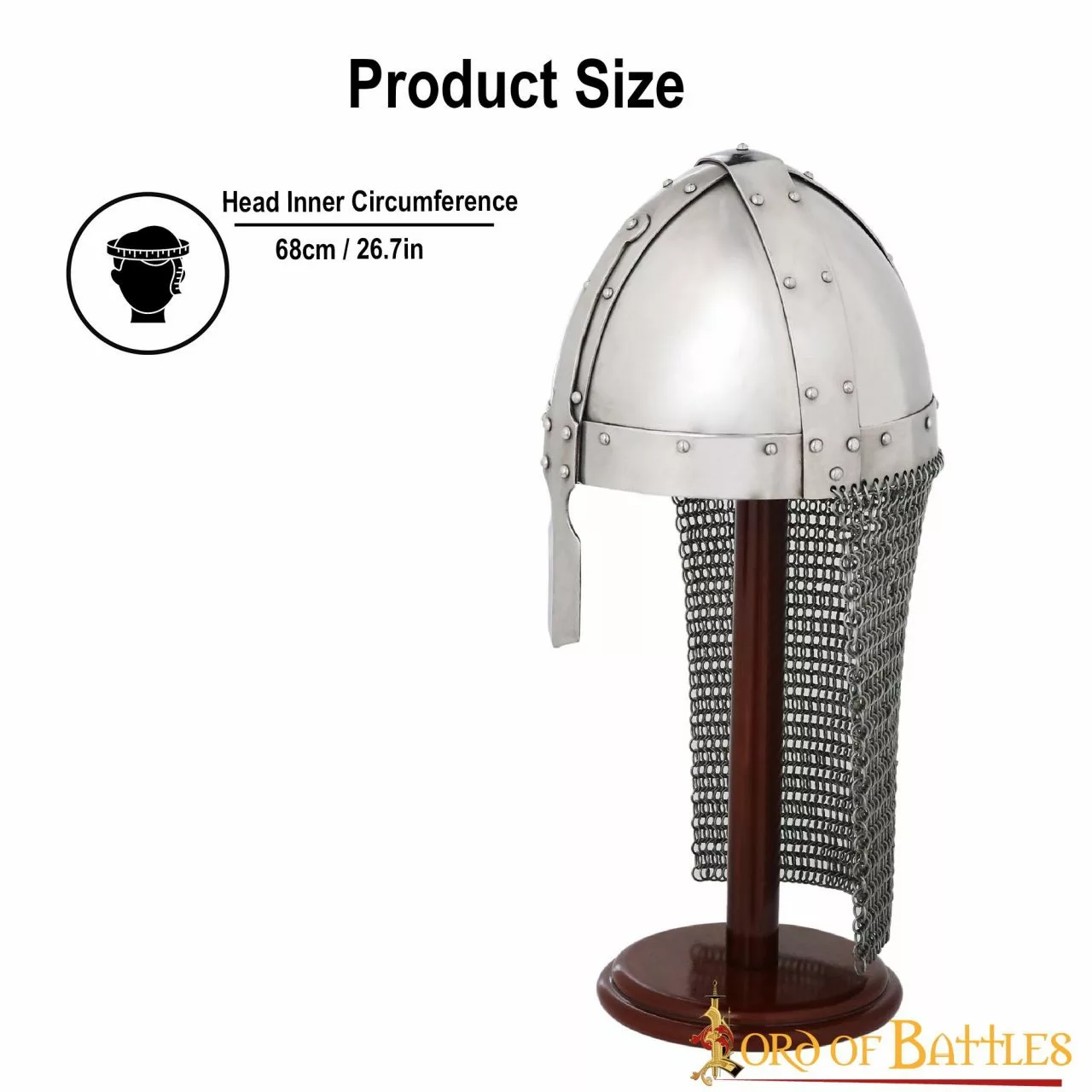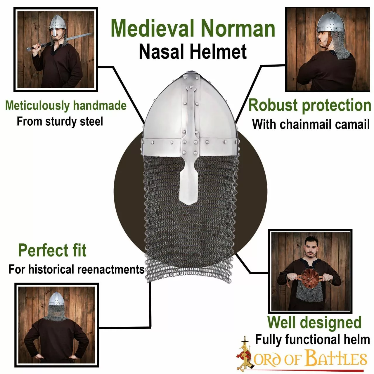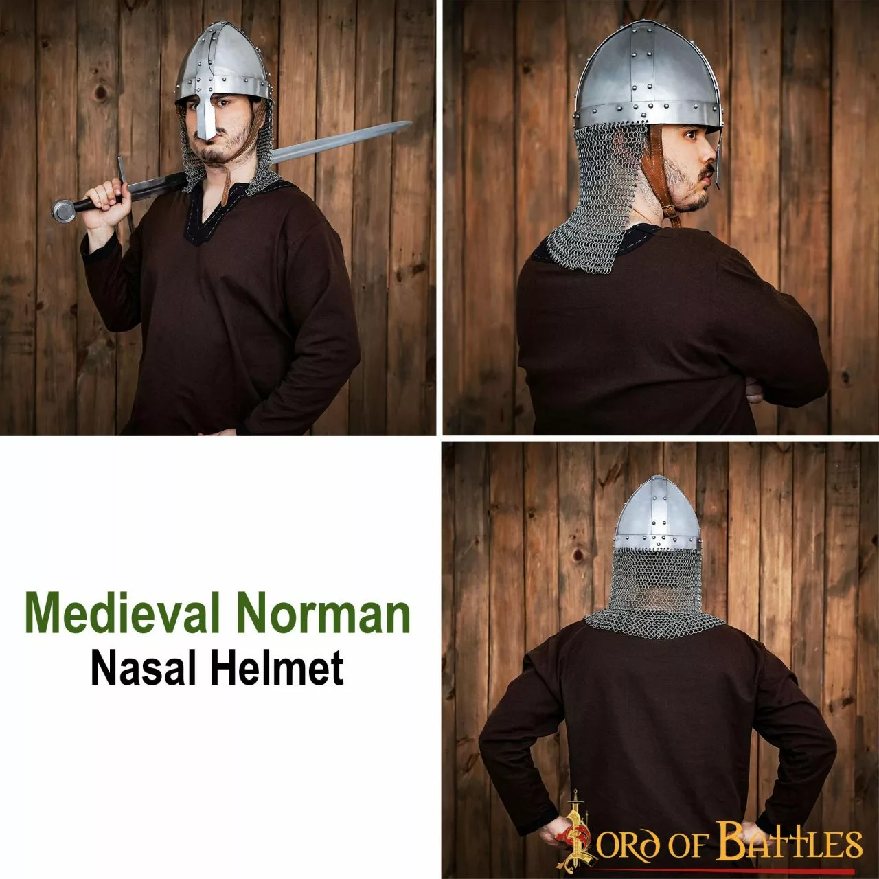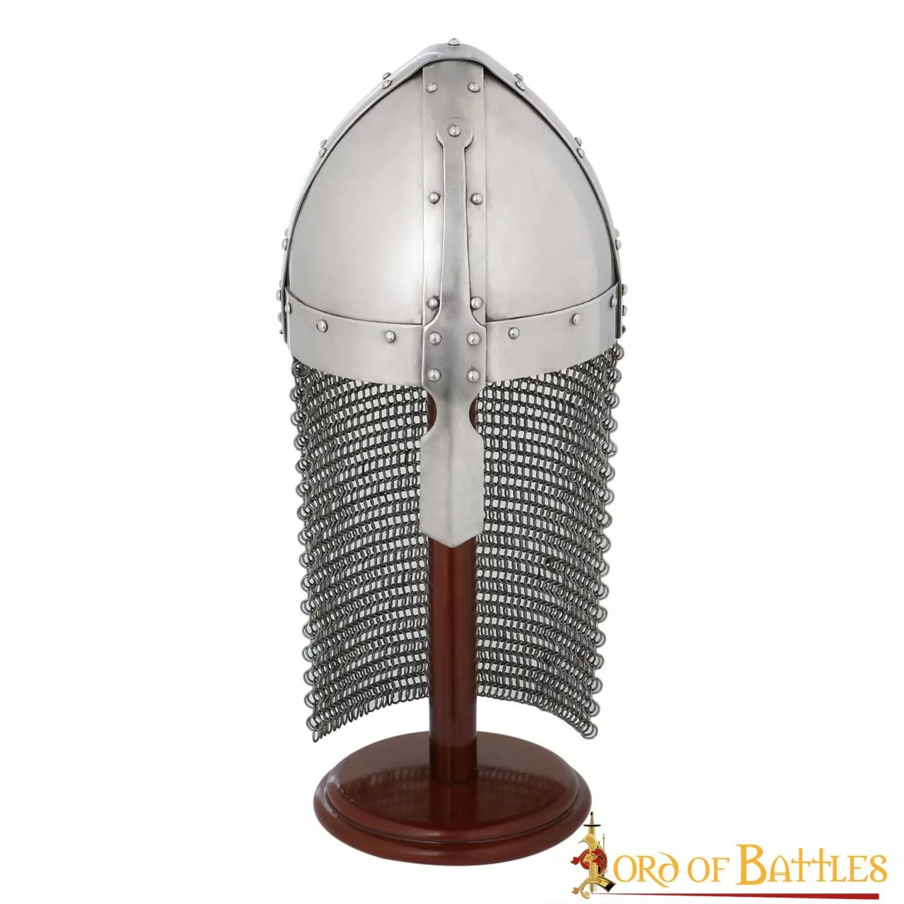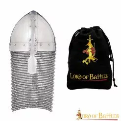 En el tapiz de Bayeux, que representa la invasión normanda de la Inglaterra sajona, aparece este casco nasal, muy popular en la época. Durante la batalla de Hastings, Guillermo el Conquistador tuvo que levantar este casco para demostrar que estaba vivo, después de que los rumores de su muerte se extendieran por todo su ejército. Viene con una cota de malla a tope que lo hace ideal para tu próximo evento LARP. Lo pueden llevar desde humildes arqueros hasta poderosos caballeros normandos.