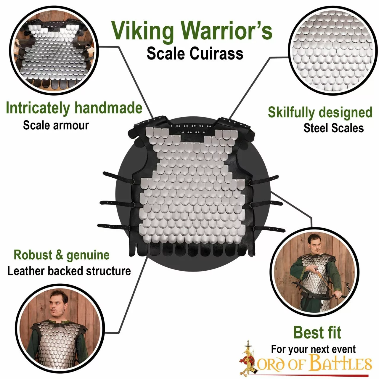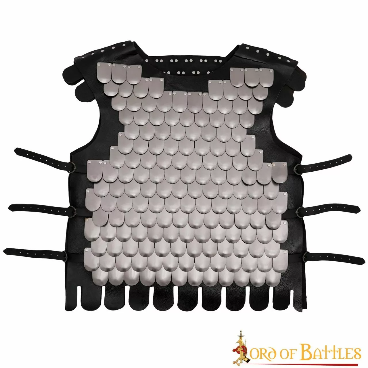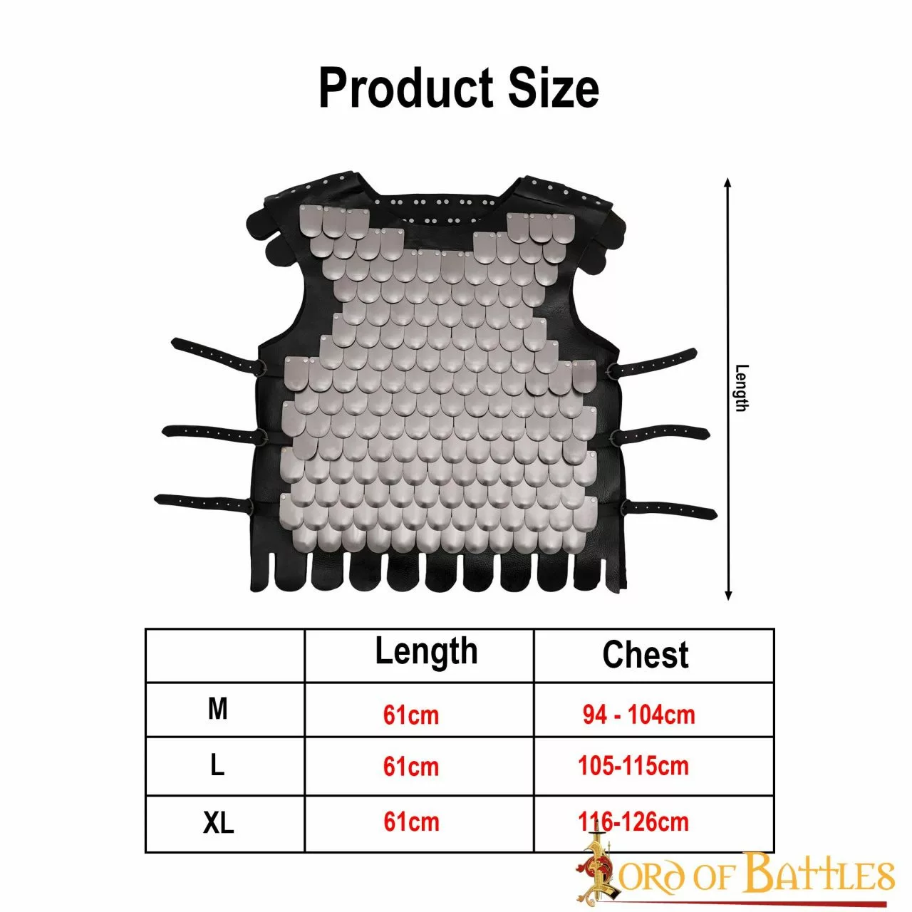 Nuestra reproducción está HECHA A MANO con resistentes escamas de ACERO MILIMITAR de calibre 20 remachadas a una robusta parte trasera de cuero, lo que la hace ideal para COSPLAY VIKINGO Y LARP. Cubre completamente el torso sin dejar de ser bastante ligero. Está disponible en tres tallas: mediana (pecho 94-104 cm), grande (pecho 105-115 cm) y extragrande (pecho 116-126 cm) (Mídase CON gambesón) y es muy ajustable gracias a sus múltiples correas de cuero auténtico.
