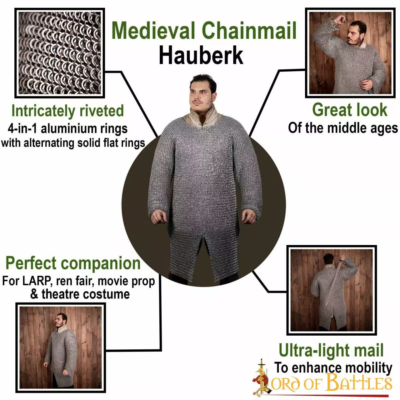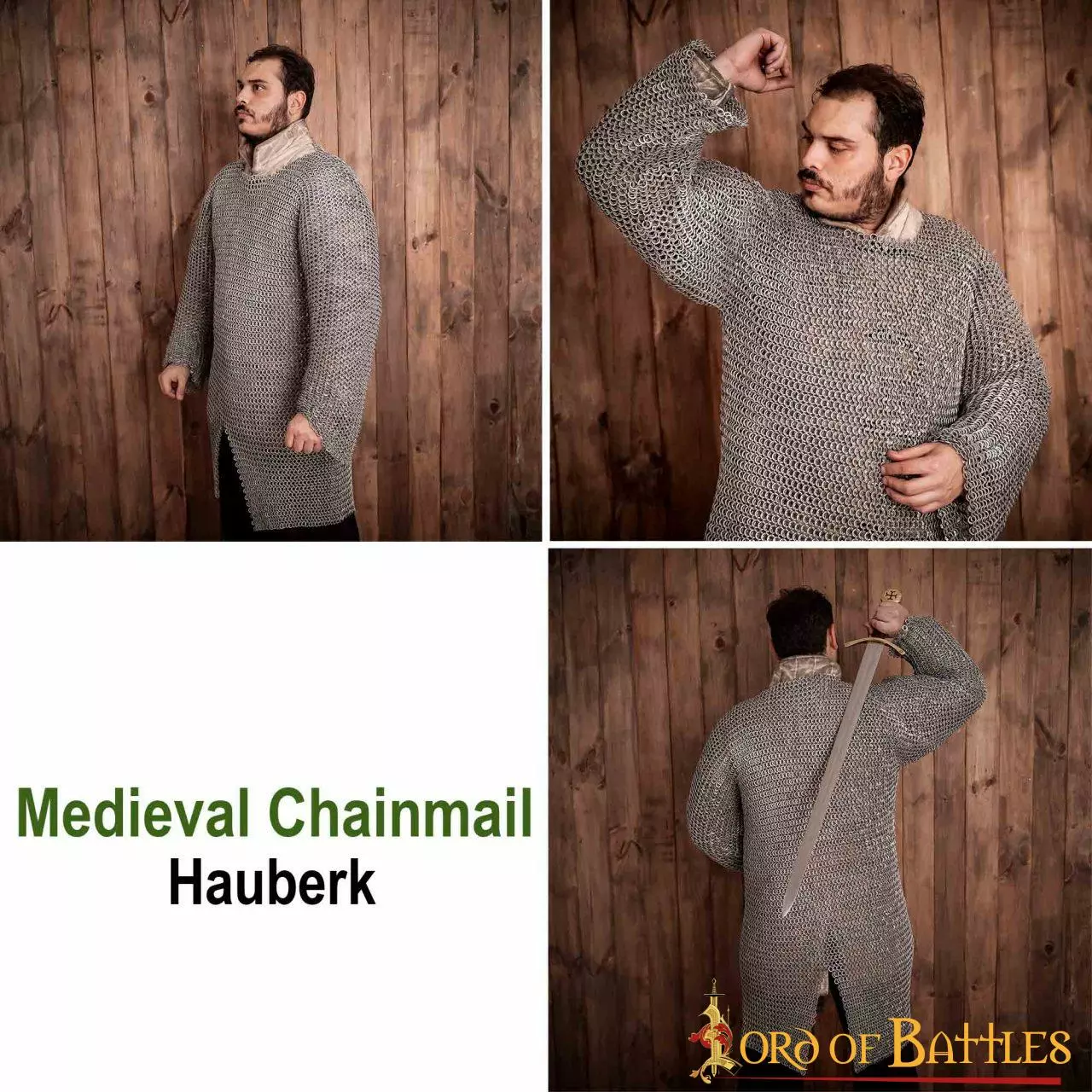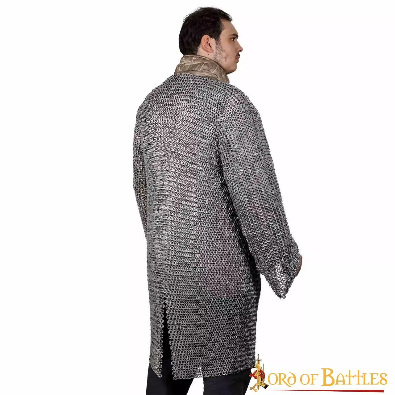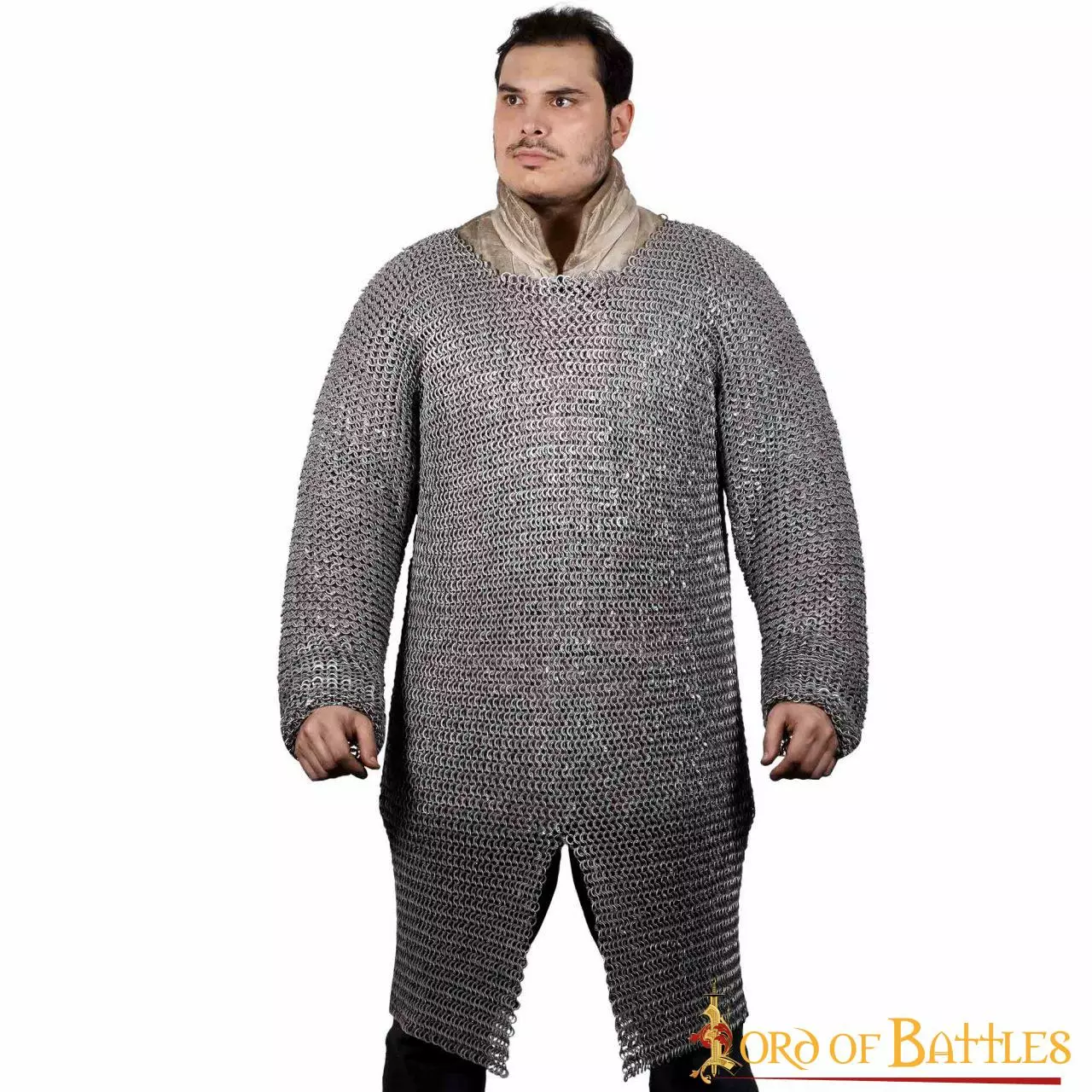 Hecha a mano a partir de anillos redondos de calibre 16 remachados en cúpula, cada uno con un diámetro aproximado de 10 mm, es una armadura de cota de malla ULTRA-ligera. La cota de malla ligera parece una armadura real, pero sin el peso de la cota de malla real. Por eso es especialmente popular en LARP, en ferias de renombre y en PELÍCULAS y TRAJES DE TEATRO.