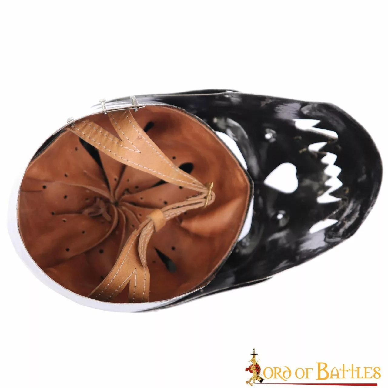 Para un ajuste cómodo, el casco viene con un forro de cuero REAL. El casco tiene una circunferencia de unos 68 cm, lo que permite que se adapte a casi todos los tamaños de cabeza. Las intrincadas y robustas fauces erizadas de dientes de latón, fabricadas en latón de calibre 20, añaden un aspecto feroz. Nota: Este producto se recubre cuidadosamente con una capa de aceite en el momento del embalaje que actúa como capa temporal (protectora) contra la corrosión (óxido), que puede limpiarse fácilmente con cualquier quitagrasas o incluso con un paño seco.