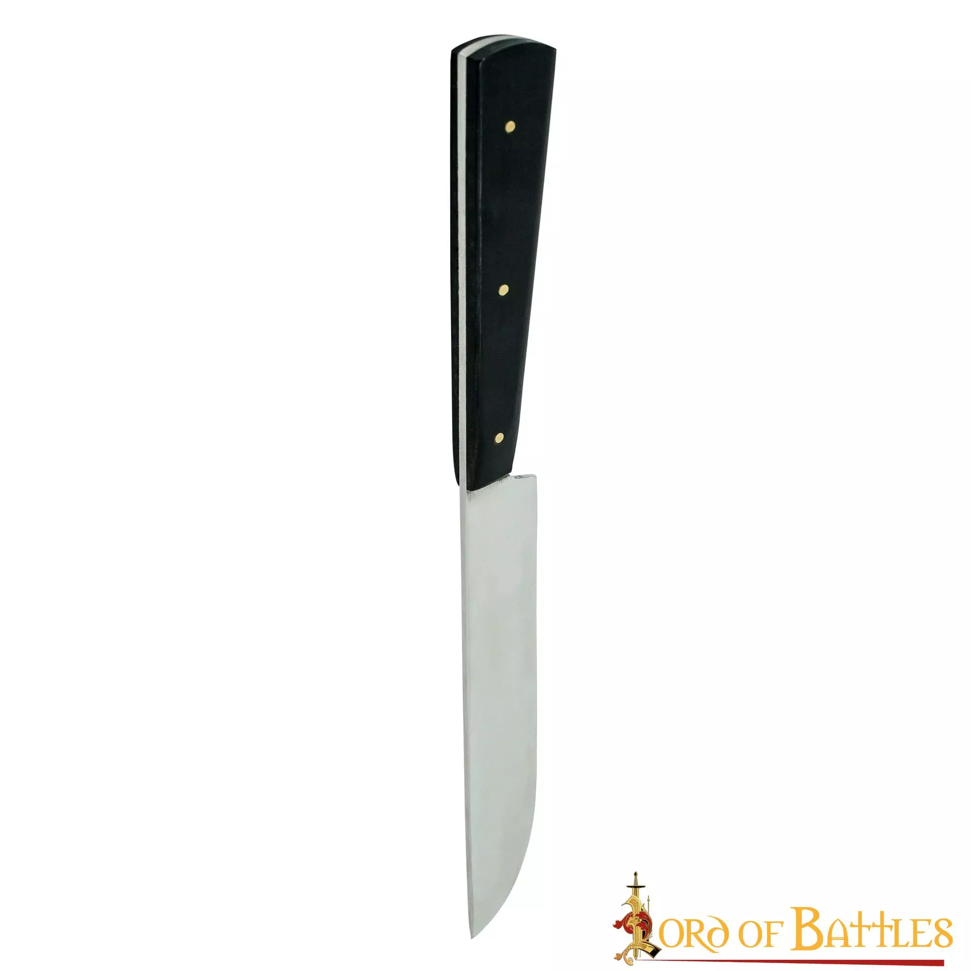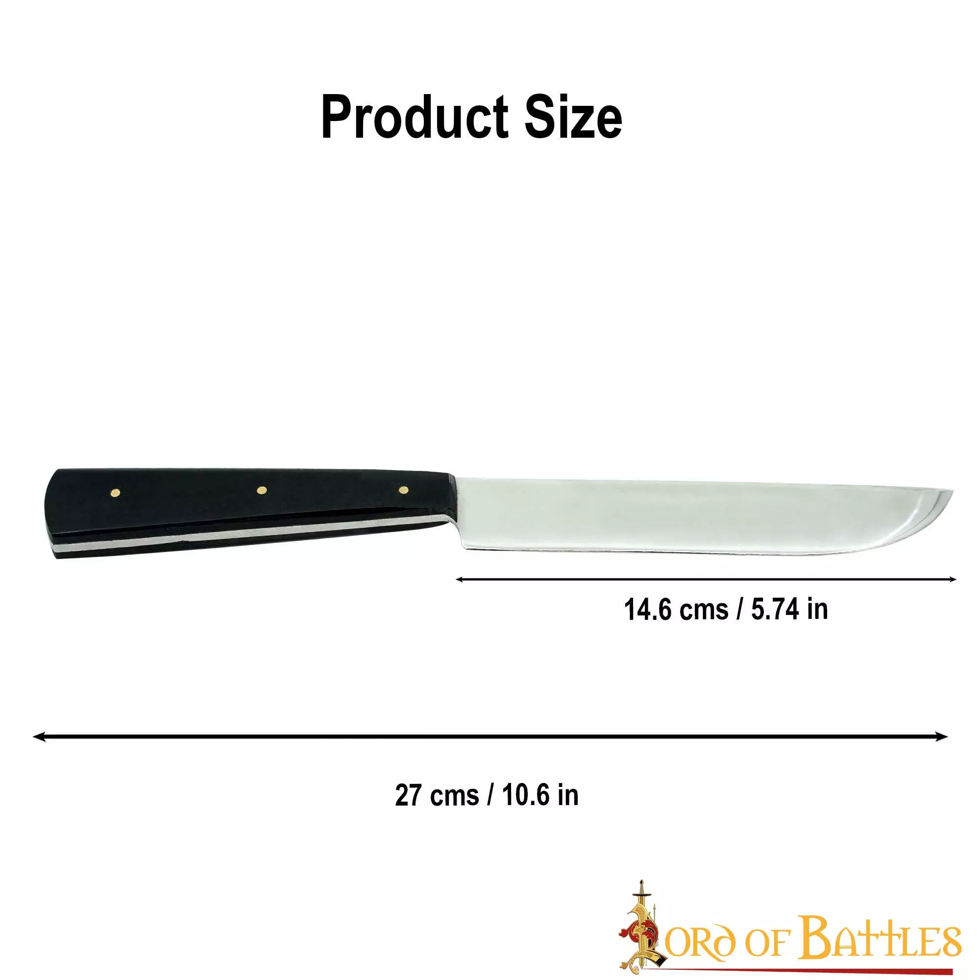 Lo que hace que este cuchillo de 27 cm (longitud aproximada) sea excepcionalmente mejor que los demás es su carácter genuino a la vez que robusto. El mango está fabricado con un cuerno de buey de procedencia ética, remachado al cuchillo con robustos remaches de latón. La hoja de 14,6 cm (longitud aproximada) viene desafilada por seguridad, pero puede afilarse según el uso que se le vaya a dar.
