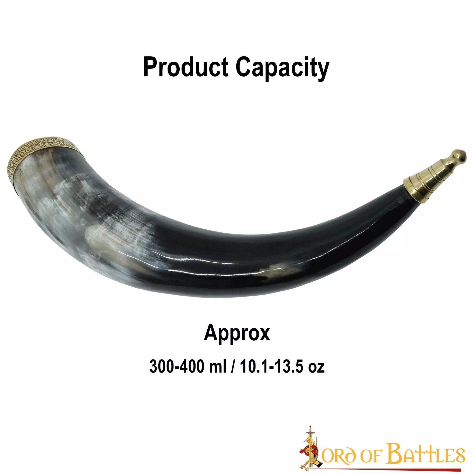 Este cuerno para beber está hecho a mano a partir de un auténtico cuerno de buey. La capacidad total del cuerno es de aprox. 300-400 ml (de un líquido con un contenido de alcohol de hasta 20%). Evite el lavavajillas y las bebidas calientes. Antes de usar, asegúrese de lavarlo con agua corriente. Para prolongar su vida útil, trátelo con cera de abeja después de cada uso. Tenga en cuenta que se trata de un producto natural que se descompone con el tiempo, por lo que pueden aparecer grietas.