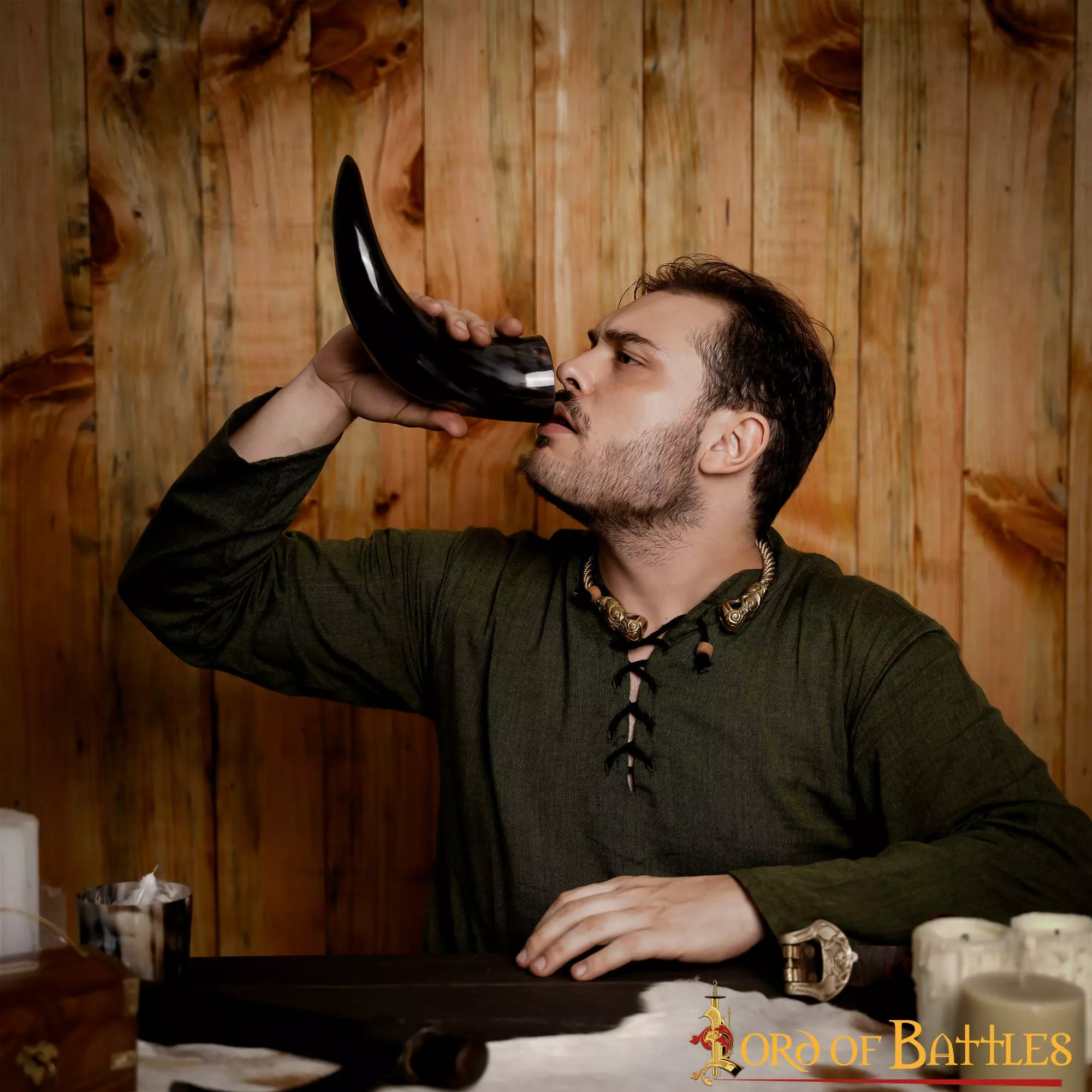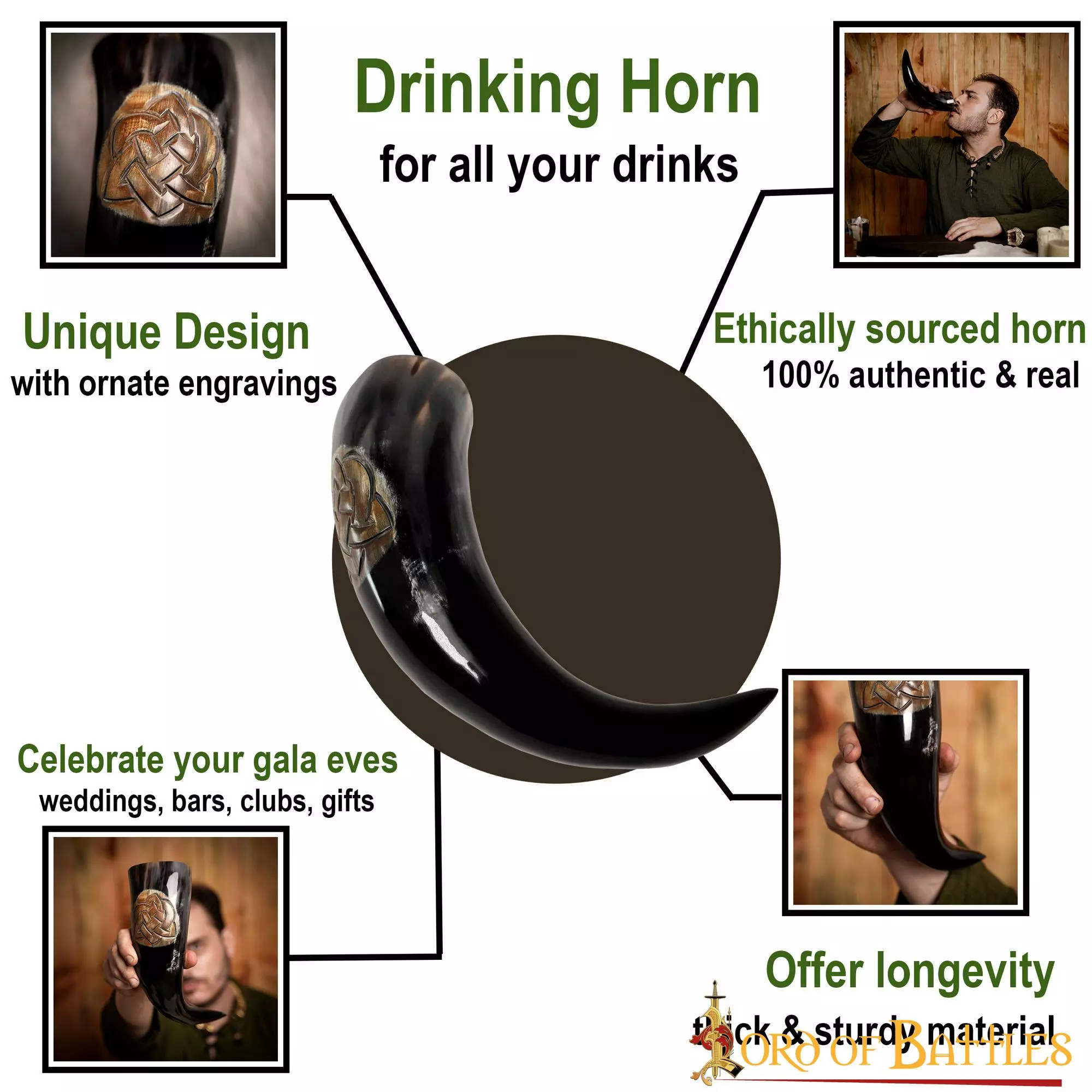 Nuestro cuerno medieval para beber, con una inscripción de nudos celtas sobre una hermosa mota carbonizada, está meticulosamente fabricado a mano con auténtico cuerno de buey, lo que lo convierte en un práctico cuerno para beber, además de una magnífica pieza de decoración. Y como viene con una robusta bolsa de lona, puede cuidarse sin esfuerzo durante años.