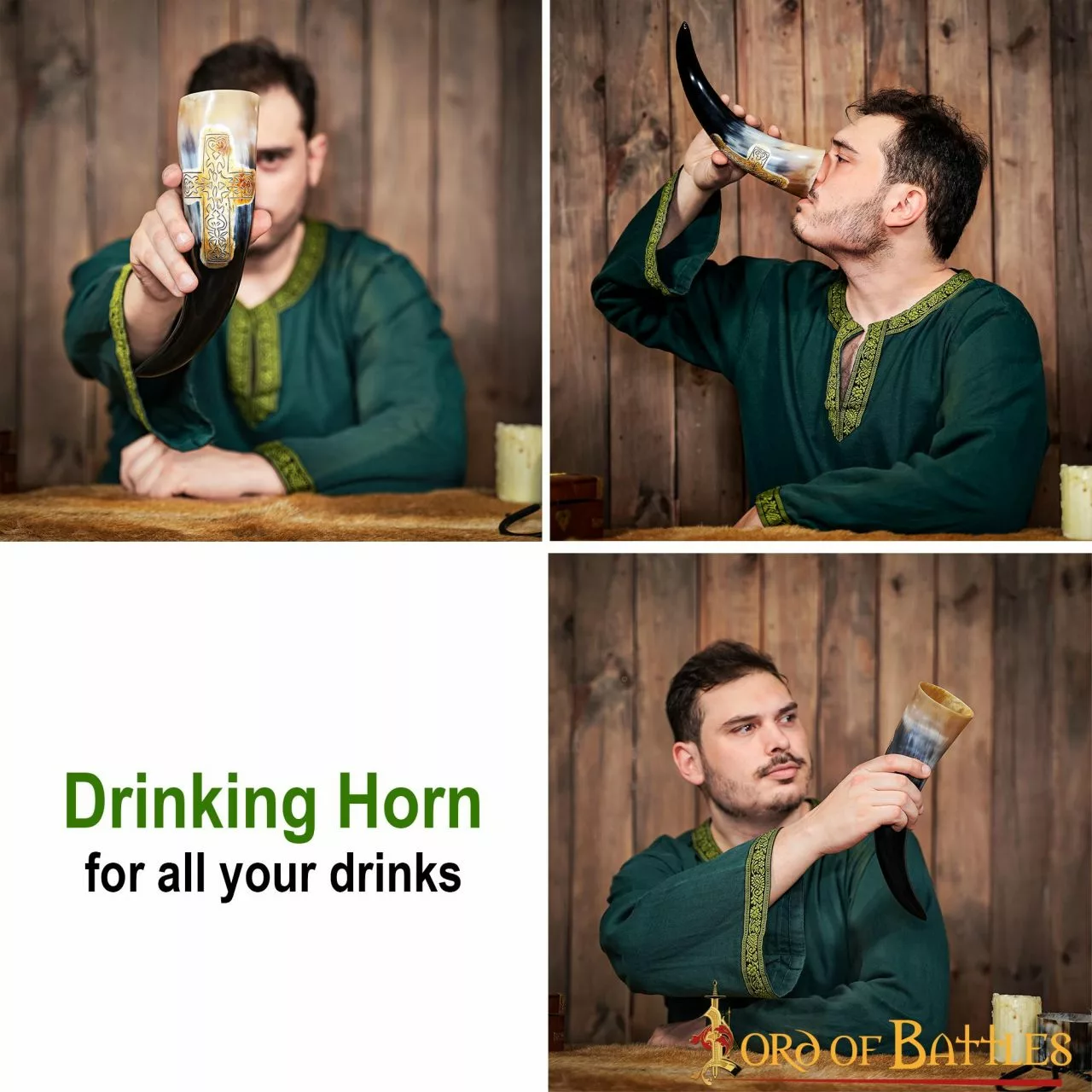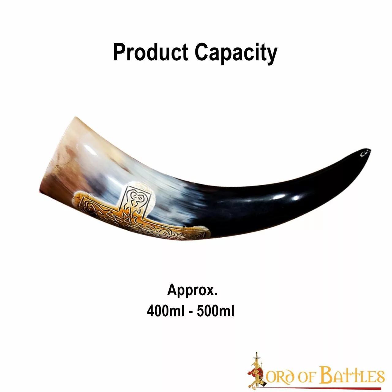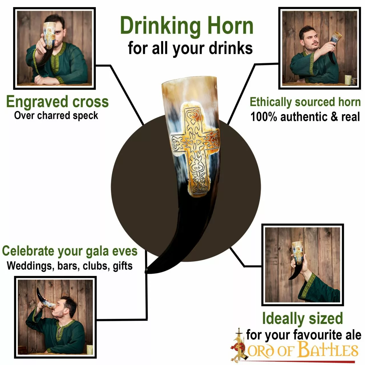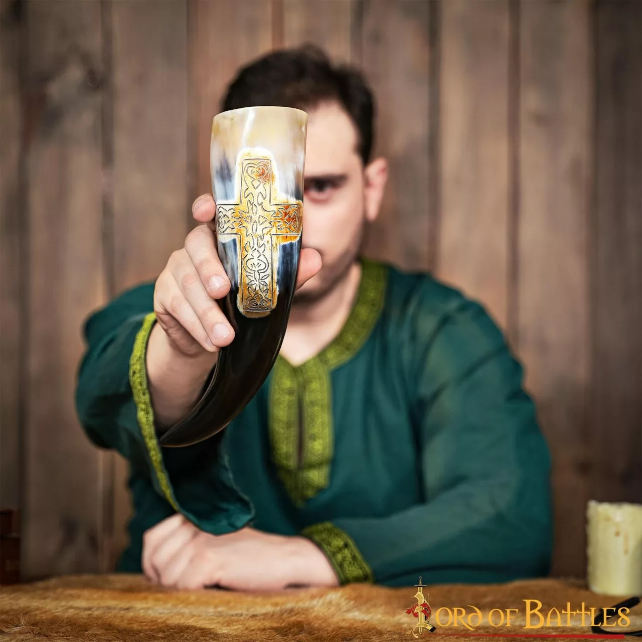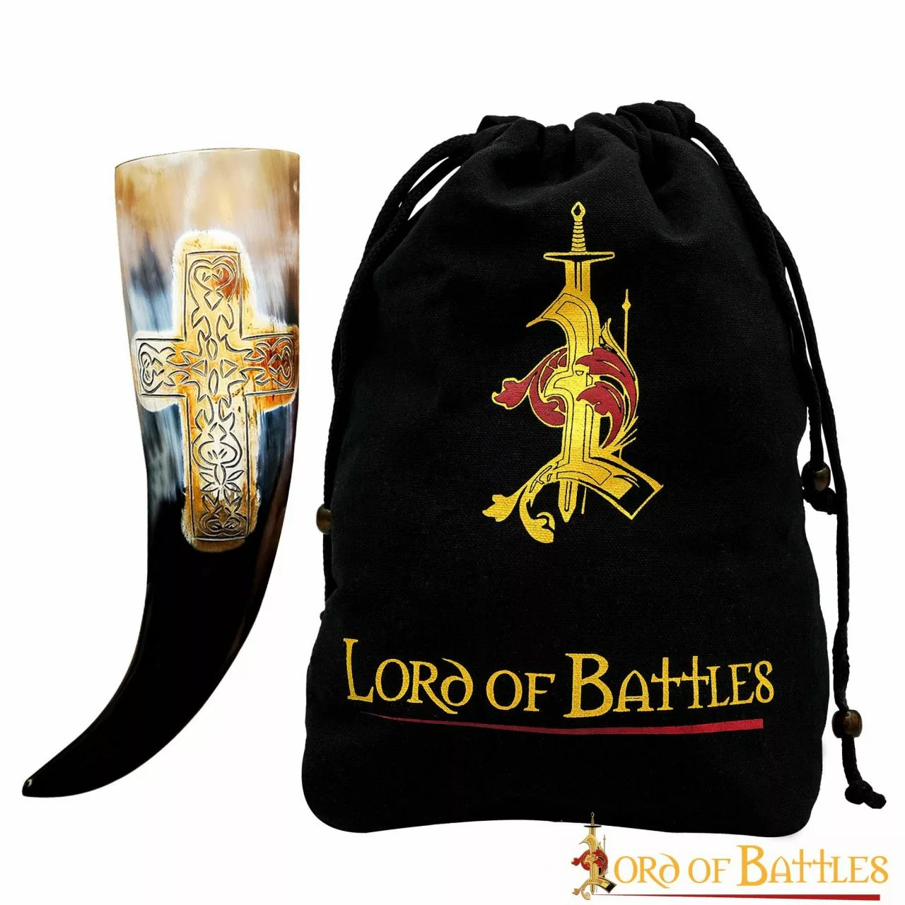 Sacie su sed o simplemente llévelo a todas partes, nuestro auténtico cuerno para beber con una cruz ornamentada grabada será la mejor opción para sus alegres reuniones piratas. Como nos encanta cuidar de nuestros productos naturales tanto como a ti, suministramos este cuerno con una bolsa de lona de algodón resistente y de alta calidad que lo mantendrá seguro y protegido durante años.