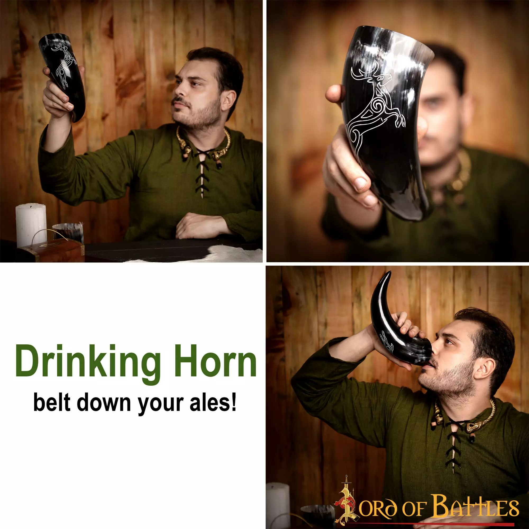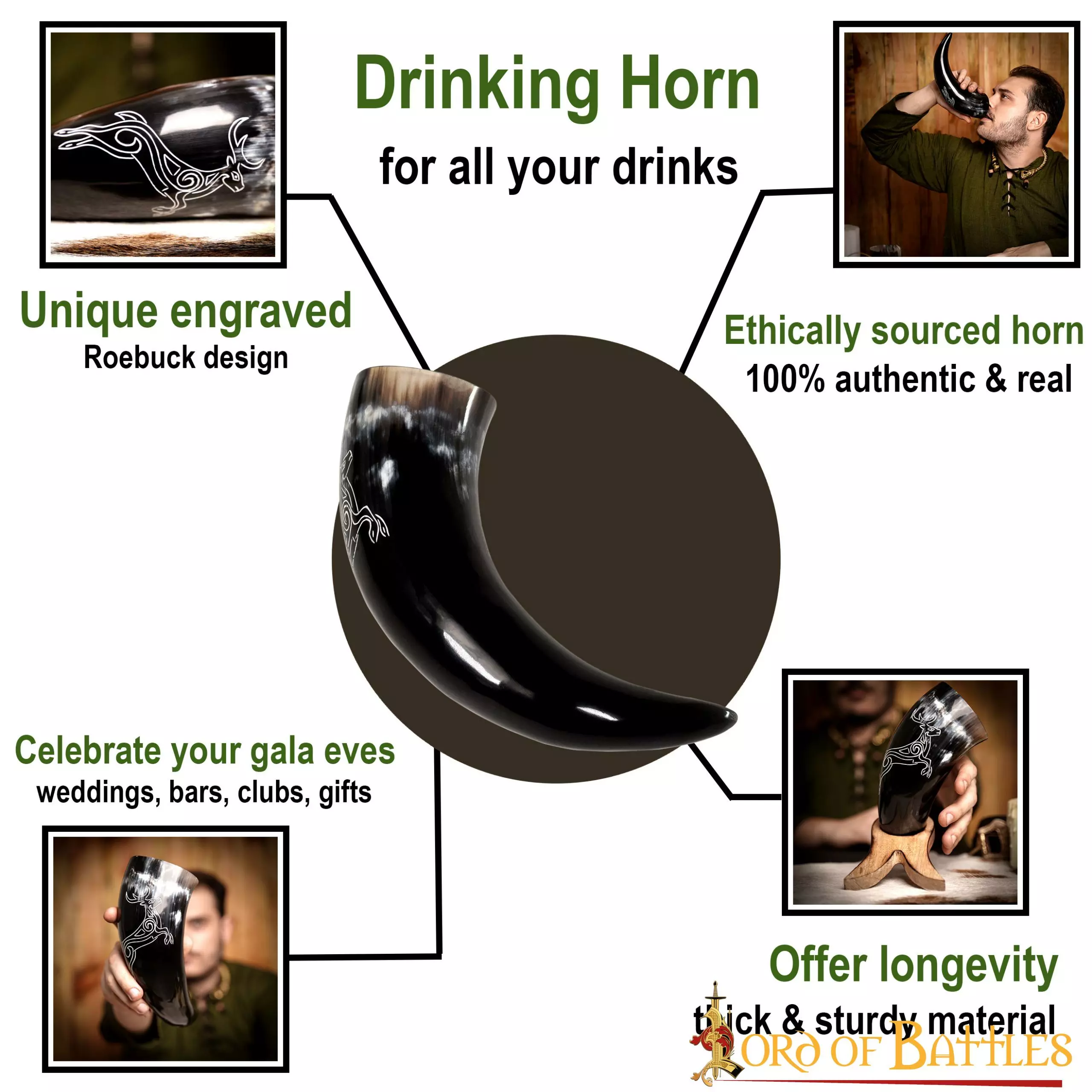 Ya sea para beber cerveza con tus amigos o simplemente para adornar tu decoración, ¡nuestro cuerno para beber con diseño de corzo grabado es justo lo que necesitas! Su diseño único y su atractivo frontal oscuro y brillante hacen que también sea ideal para regalar a sus seres queridos. Como viene con una bolsa, podrá cuidarlo sin esfuerzo durante años.