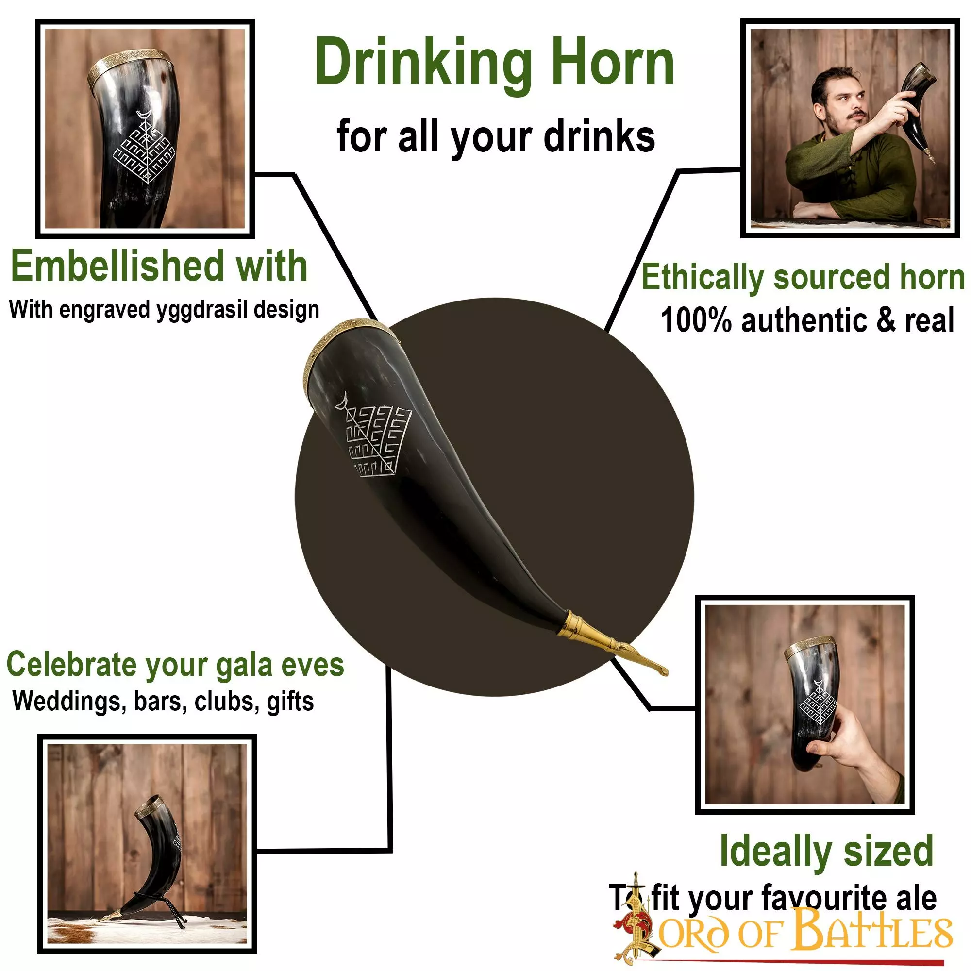 Sírvete un poco de hidromiel bien añejado en nuestro cuerno para beber con nudo de escudo vikingo; al fin y al cabo, ¿qué más necesitan los guerreros victoriosos después de aniquilar a sus enemigos? Además del Yggdrasil grabado, está decorado con un borde y una punta de latón puro, lo que lo hace visualmente atractivo y la mejor opción para regalar a sus seres queridos. Puesto que nos gusta cuidar de nuestros productos naturales tanto como a ti, suministramos este cuerno con una resistente bolsa de lona de algodón de alta calidad que lo mantendrá seguro y protegido durante años.