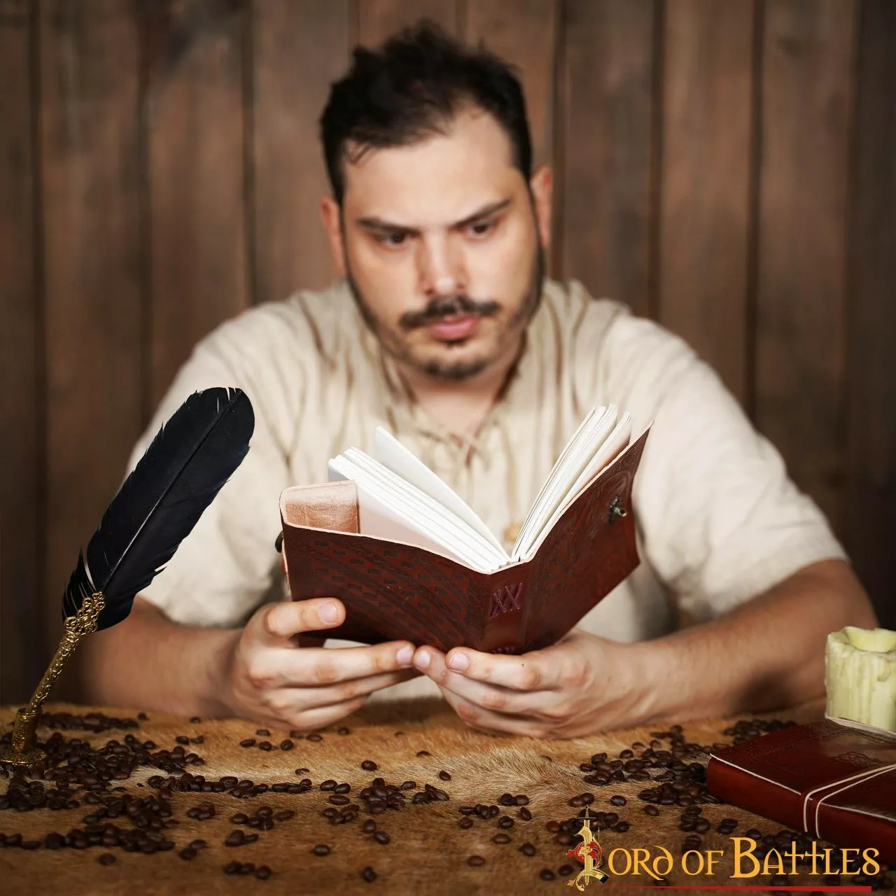Nuestro diario de cuero de (7 X 5) pulgadas está hecho minuciosamente a mano con cuero de ante auténtico y tiene 110 papeles naturales de la mejor calidad, hechos a mano, encuadernados con un resistente cordel de algodón. El diario se cierra con un robusto candado de latón antiguo.