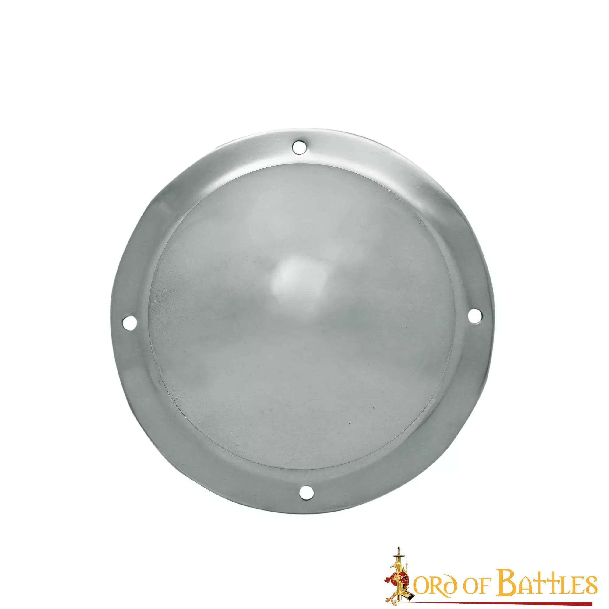Se ha fabricado a mano con esmero a partir de resistente ACERO MILIMITAR de calibre 16 y constituye un JEFE DE ESCUDO FUNCIONAL. Su lustrosa textura pulida realza su aspecto medieval. Su diámetro es de aproximadamente 16,5 cm.