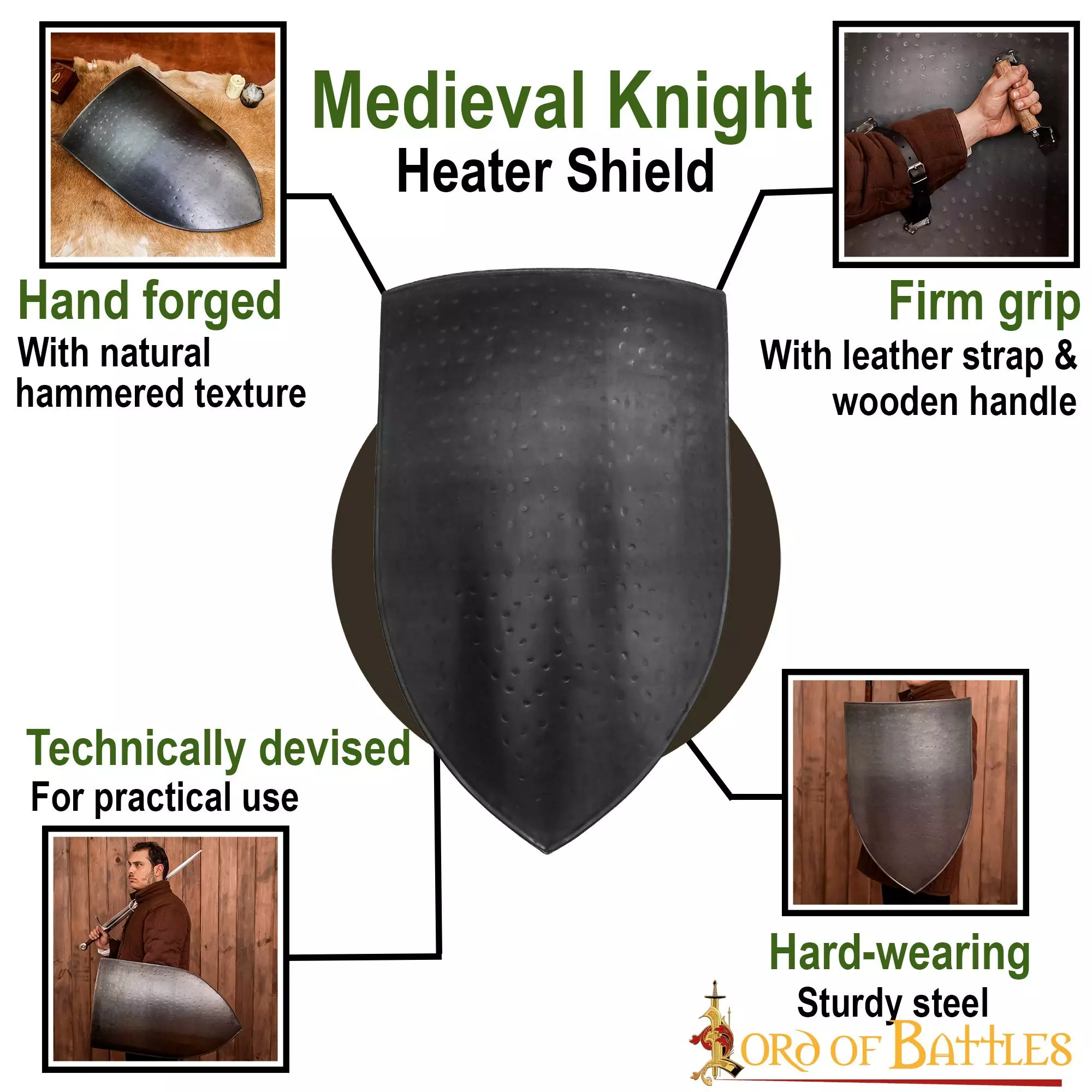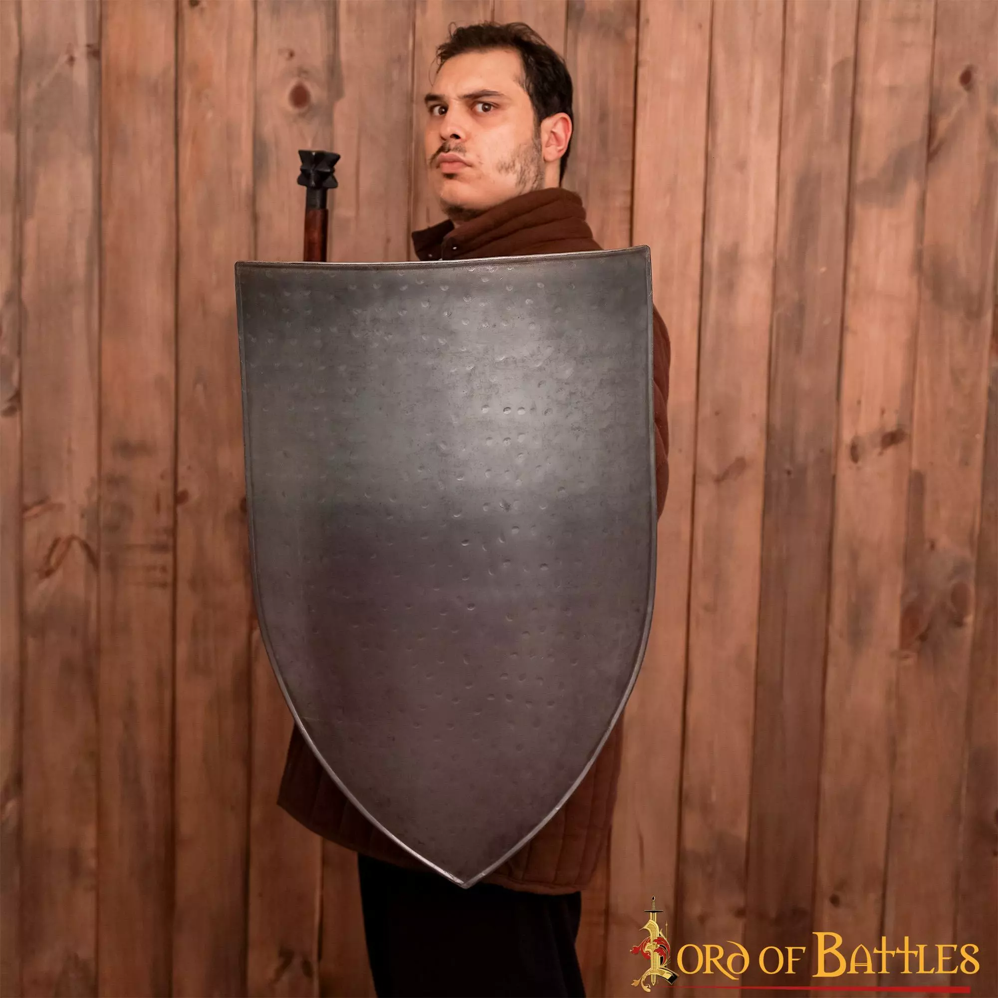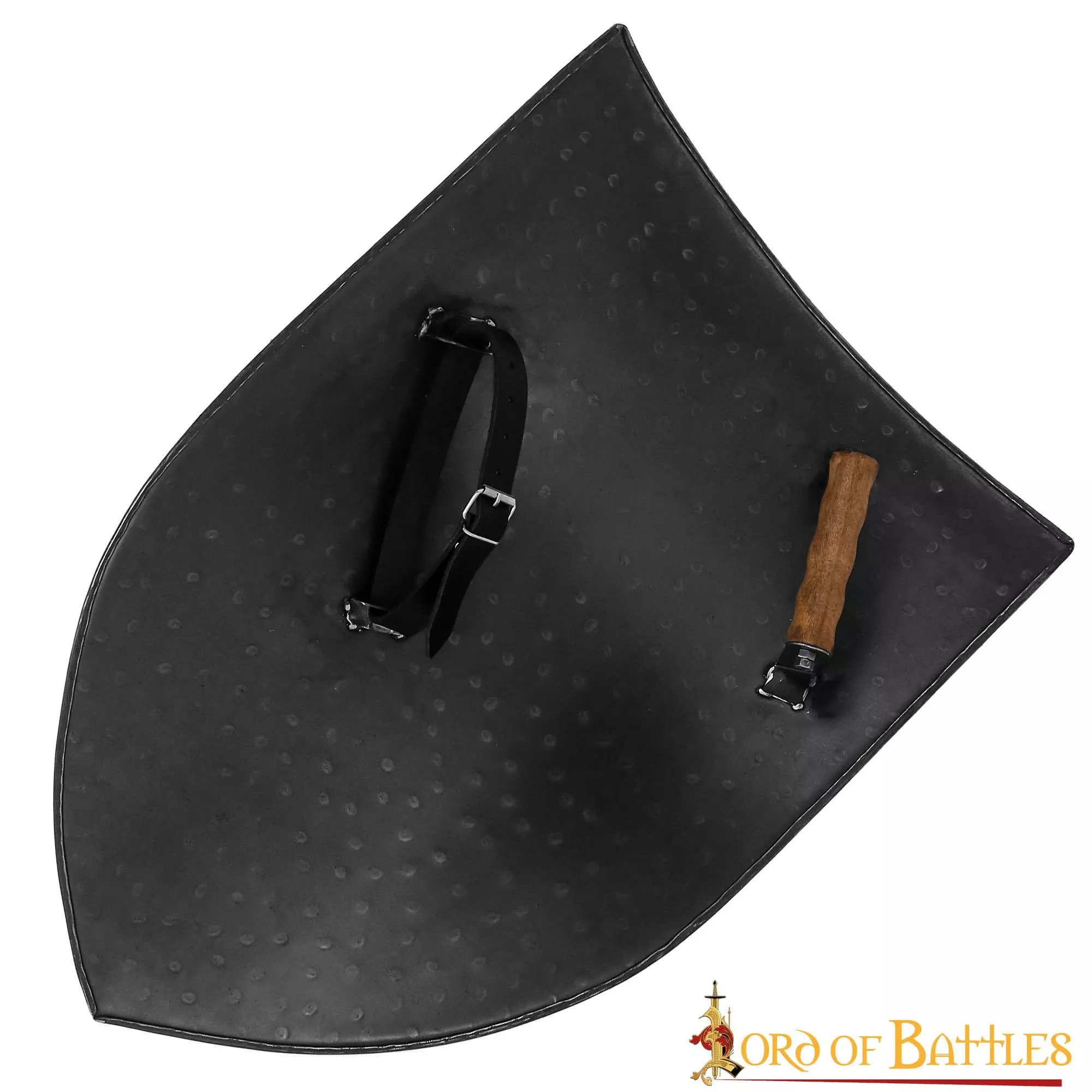 Cada variante de este escudo está hecha a mano con un robusto ACERO MILIMITAR, mide aproximadamente (28 X 20) pulgadas y se deja lisa para su creatividad. Para una mayor absorción de impactos, el mango tiene un ajuste de MADERA GENUINA. La CORREA DE CUERO REAL asegura un mejor agarre. Dependiendo del calibre (16 o 18), cada variación se puede utilizar para recreaciones históricas, combate real, decoración y LARP.