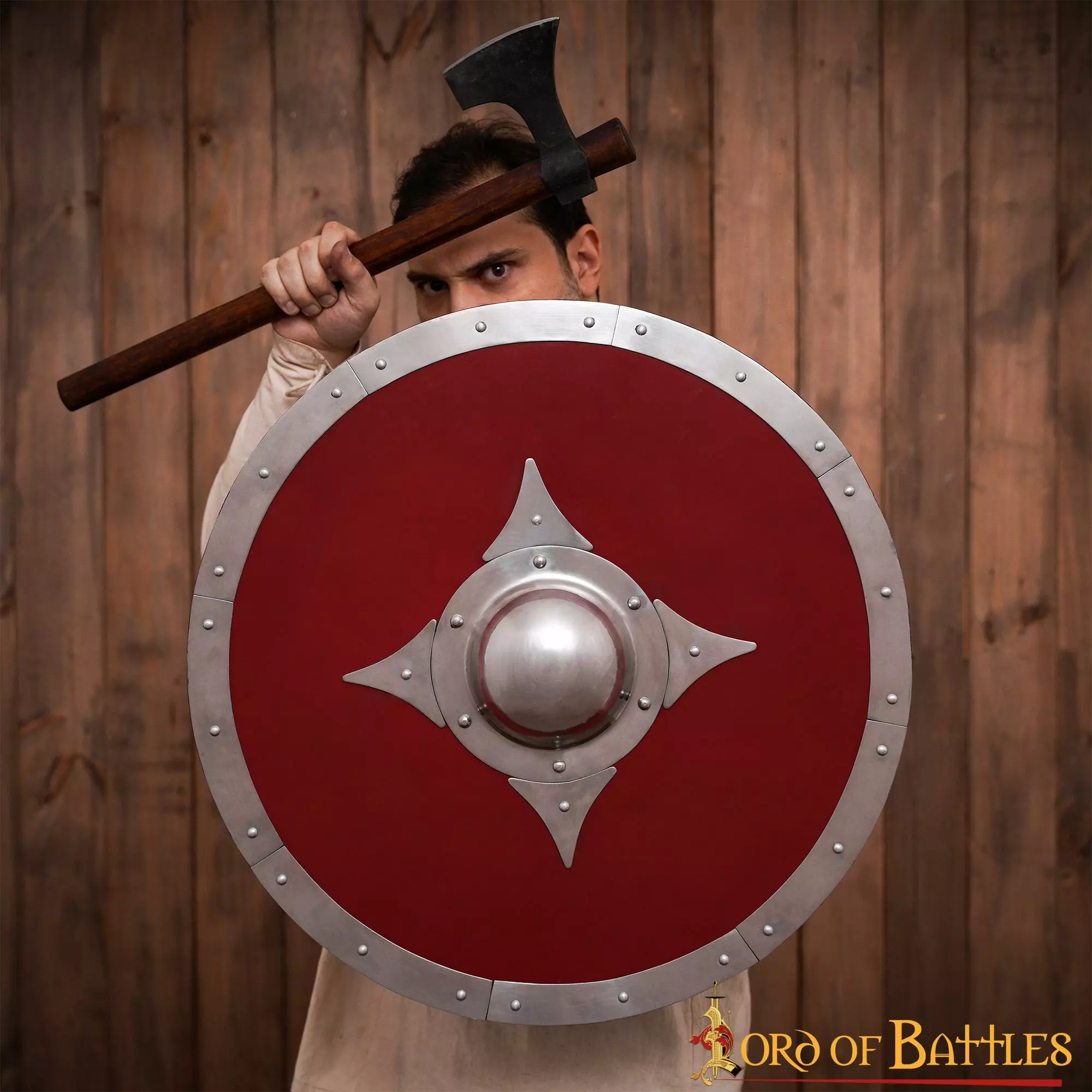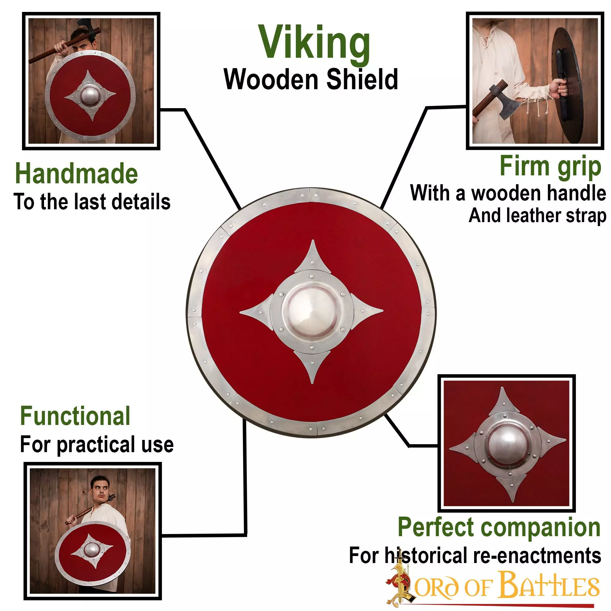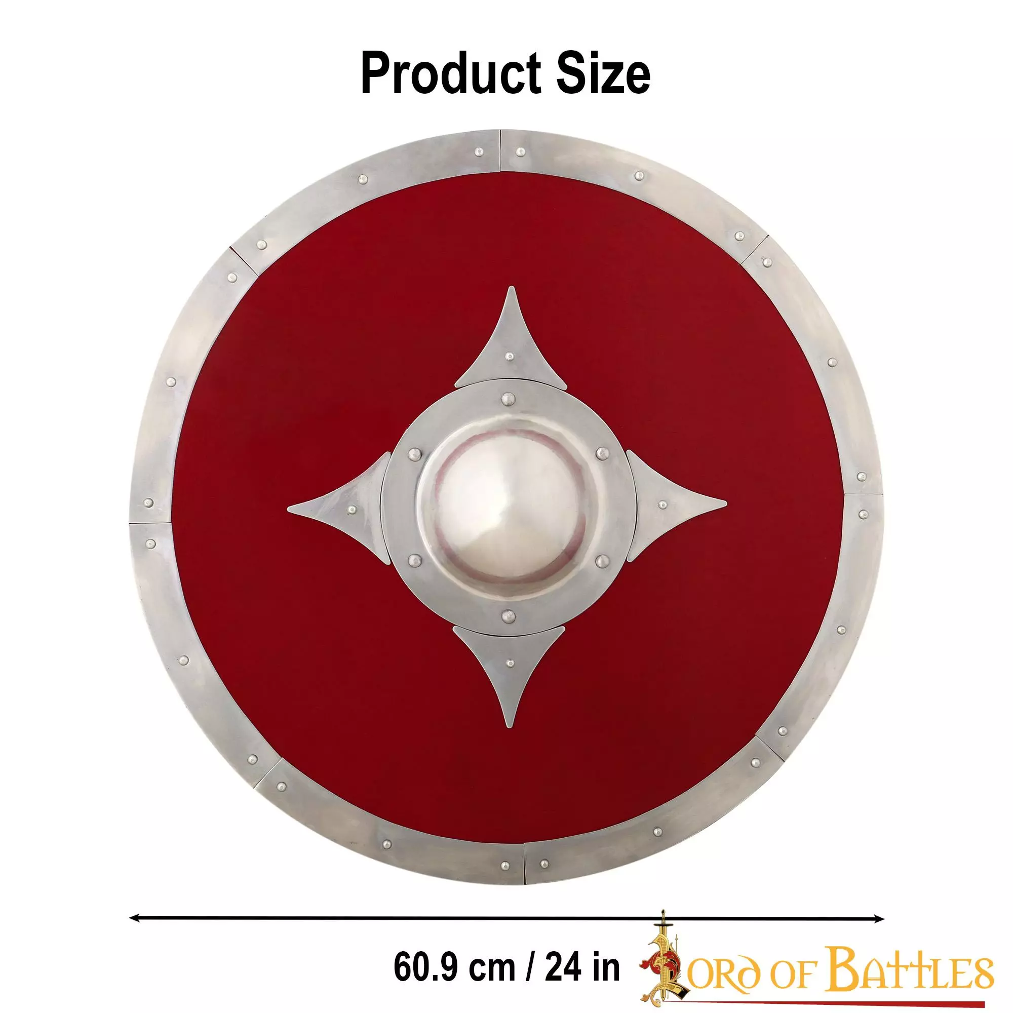 Este escudo, de aproximadamente 24 pulgadas de diámetro, está meticulosamente hecho a mano con MADERA GENUINA. Una robusta empuñadura metálica permite agarrar firmemente este escudo. El umbo y los herrajes son de ACERO SUAVE resistente. Este escudo es una armadura totalmente funcional y perfecta para recreaciones y decoración.