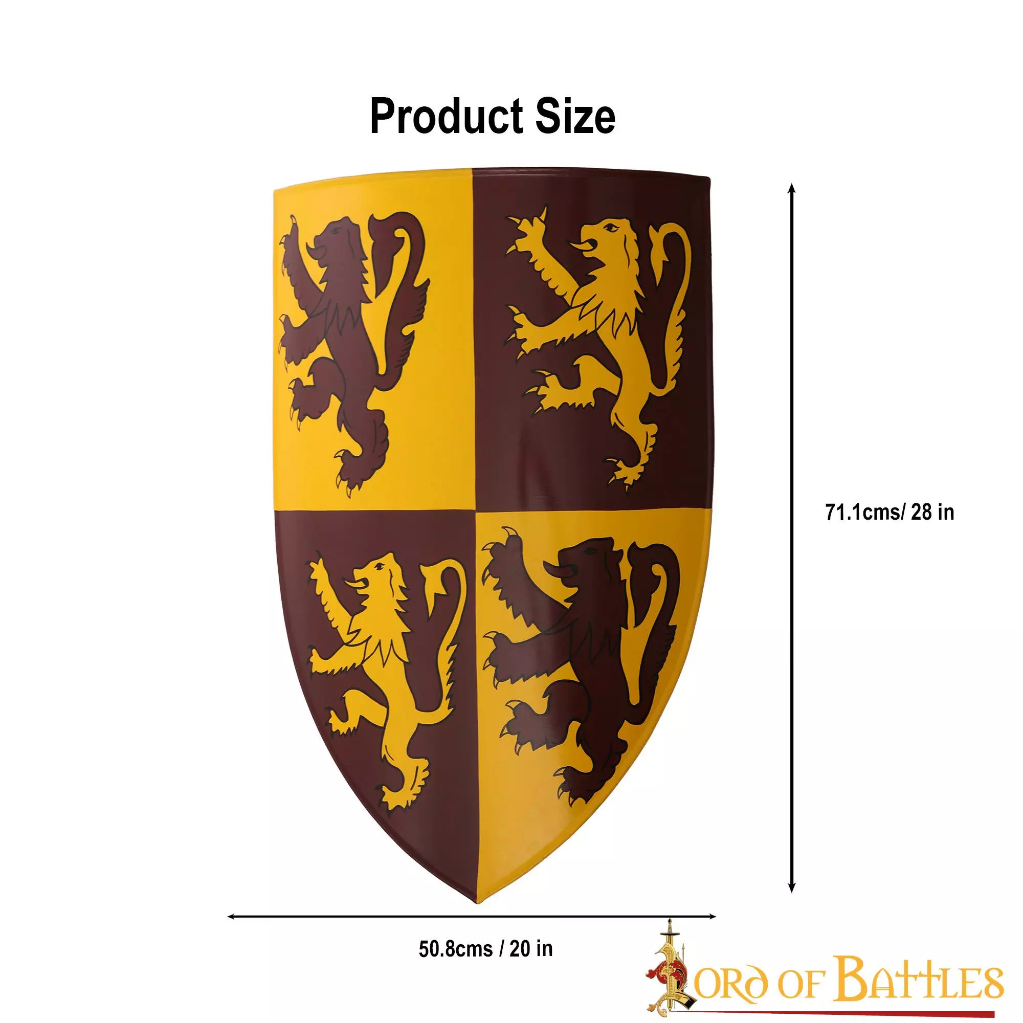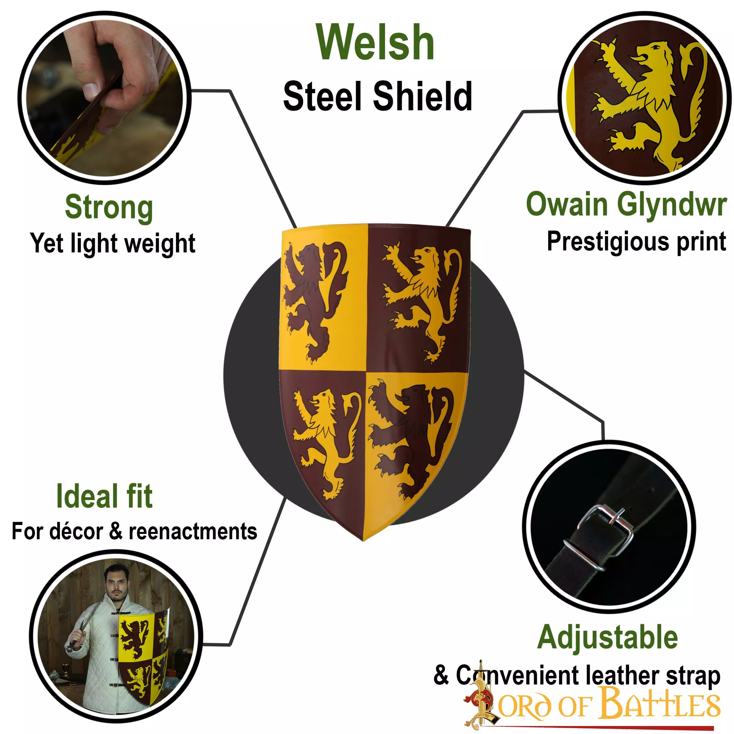 Con el prestigioso escudo que se asemeja nada menos que al escudo de Owain Glyndwr, ¡seguro que elevará el listón con su decoración! Perfectamente decorado con el diseño heráldico del león rampante, este escudo ofrece un aspecto regio asombroso y sin duda realzará su entorno medieval o contemporáneo.