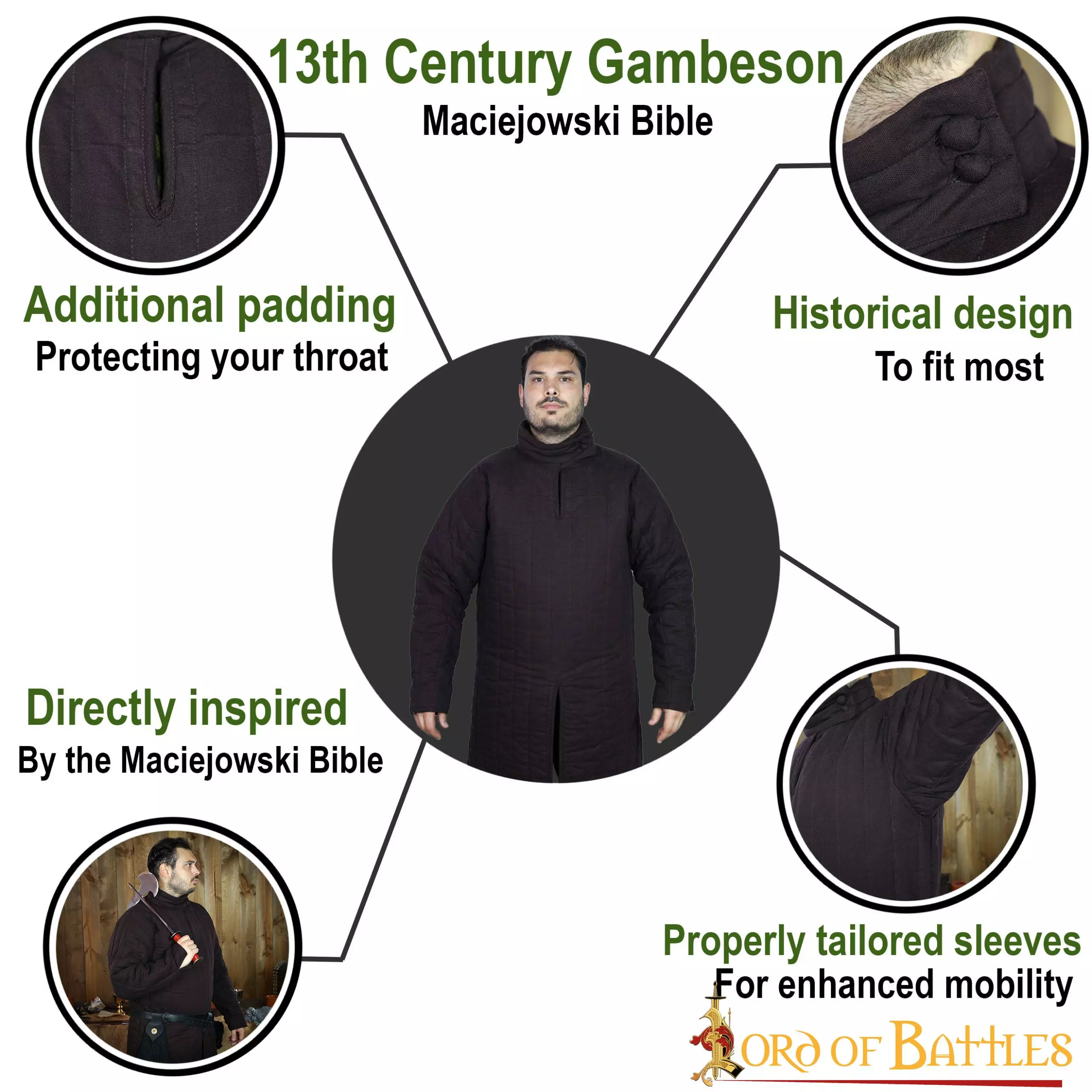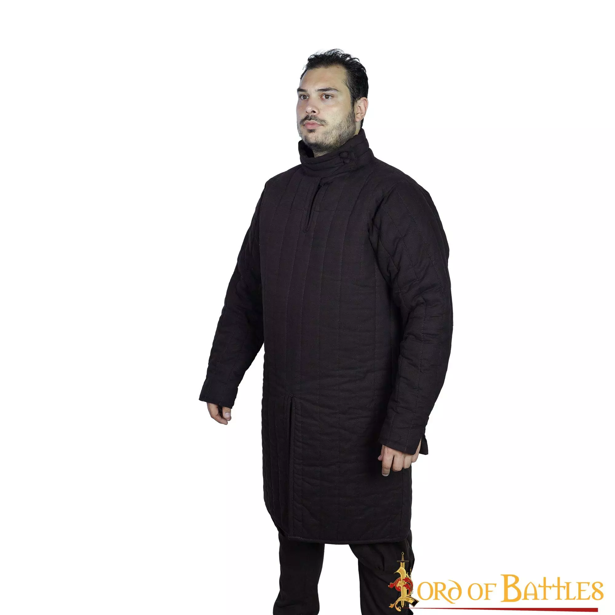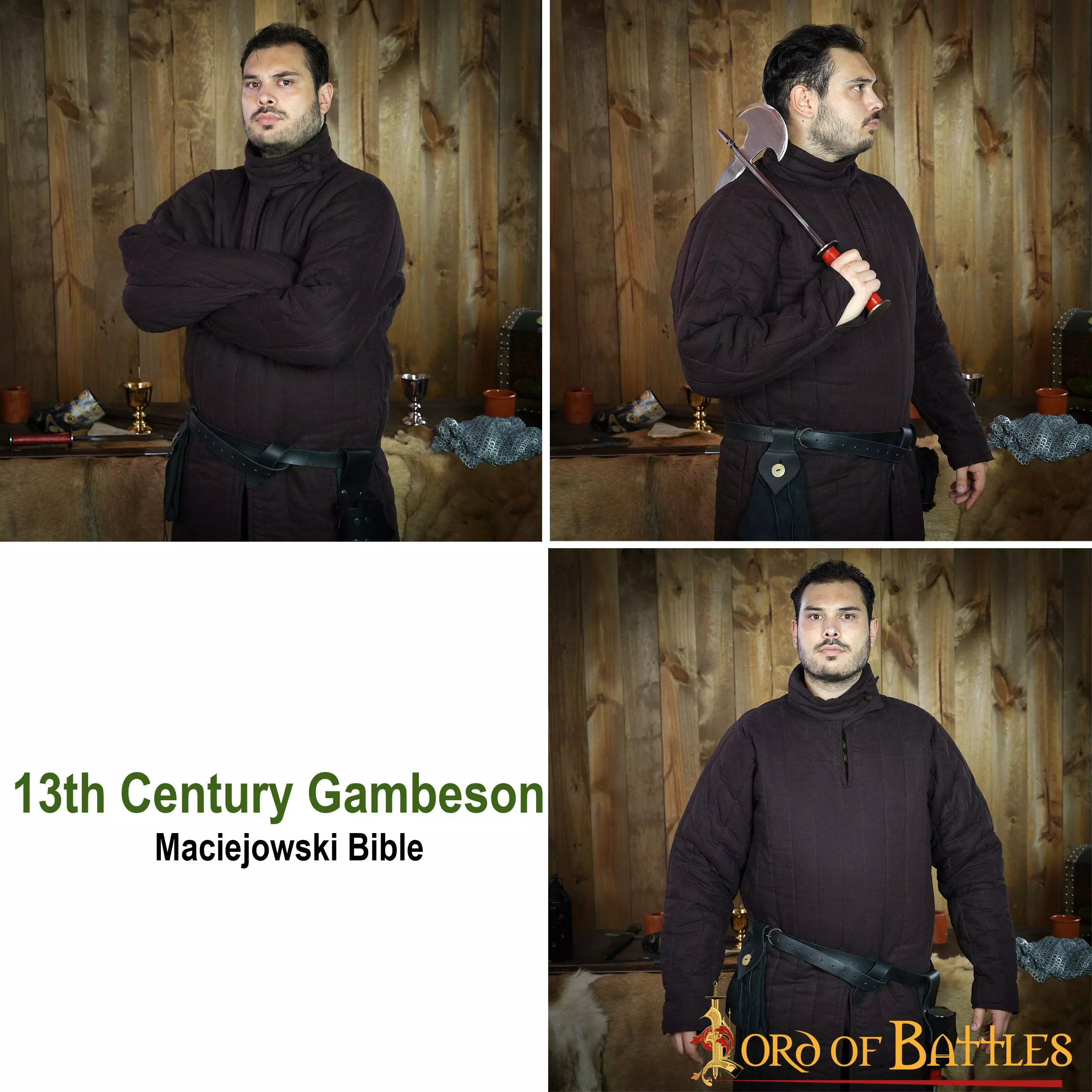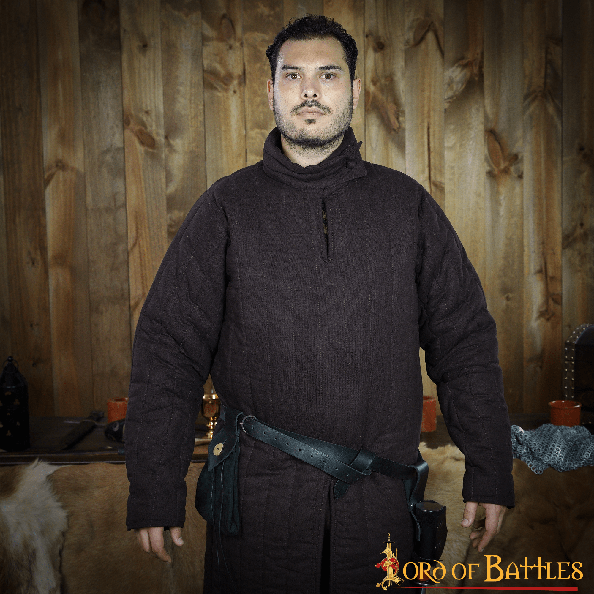 Nuestro gambesón acolchado medieval se inspira directamente en la Biblia de Maciejowski, fechada a mediados del siglo XIII. Era la forma de protección favorita de los lacayos, lanceros y ballesteros, que confiaban principalmente en el pesado gambesón como principal protección. Esta réplica tiene un grueso cuello abotonado que protege la garganta. Soporta la inmensa movilidad de los brazos, gracias a la cuidada confección de las axilas.