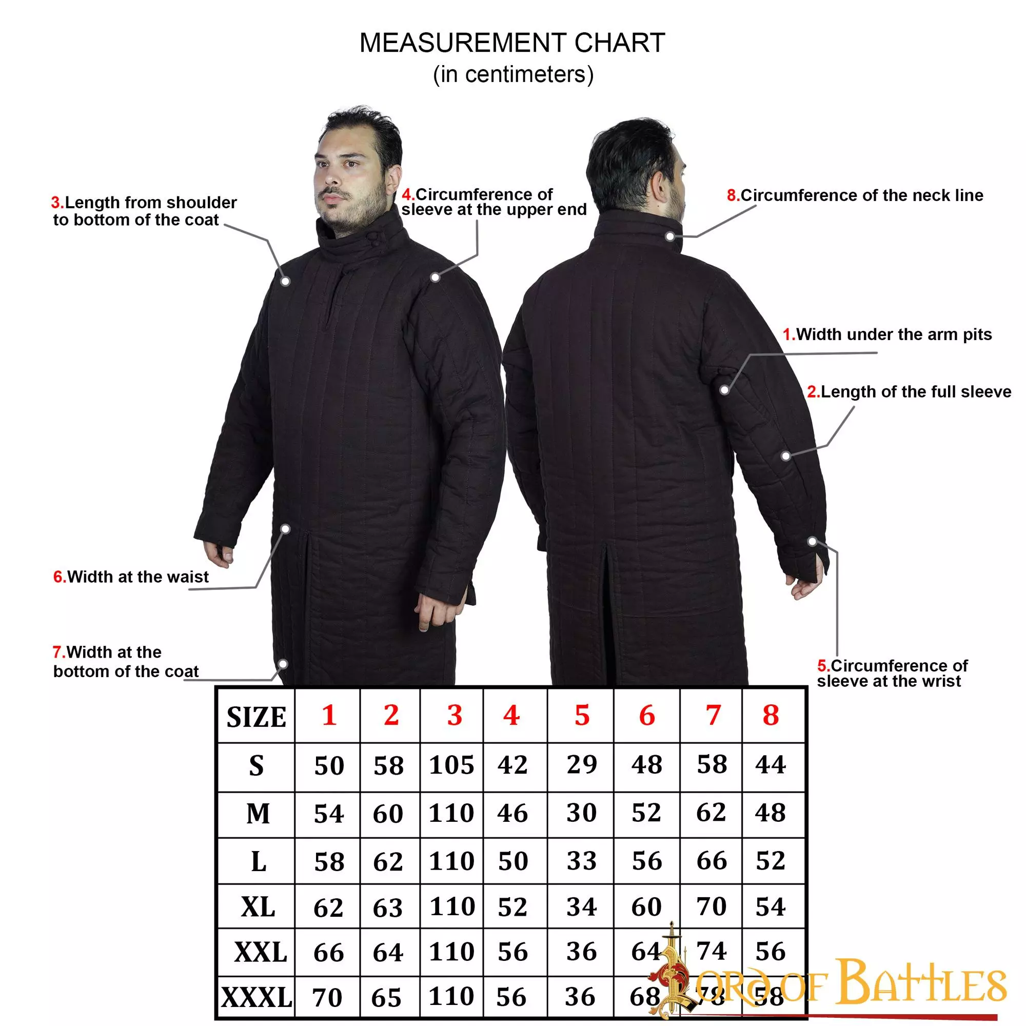 Tiene dos capas de lona resistente, intercaladas con una capa de acolchado adecuado. Esto lo convierte en un VERDADERO GAMBESÓN MEDIEVAL, al contrario que la mayoría de réplicas endebles fabricadas con capas exteriores e interiores sintéticas. Suministramos este gambesón en seis tallas distintas para un ajuste perfecto al ponérselo. Se adjunta una tabla de tallas detallada con las fotografías.