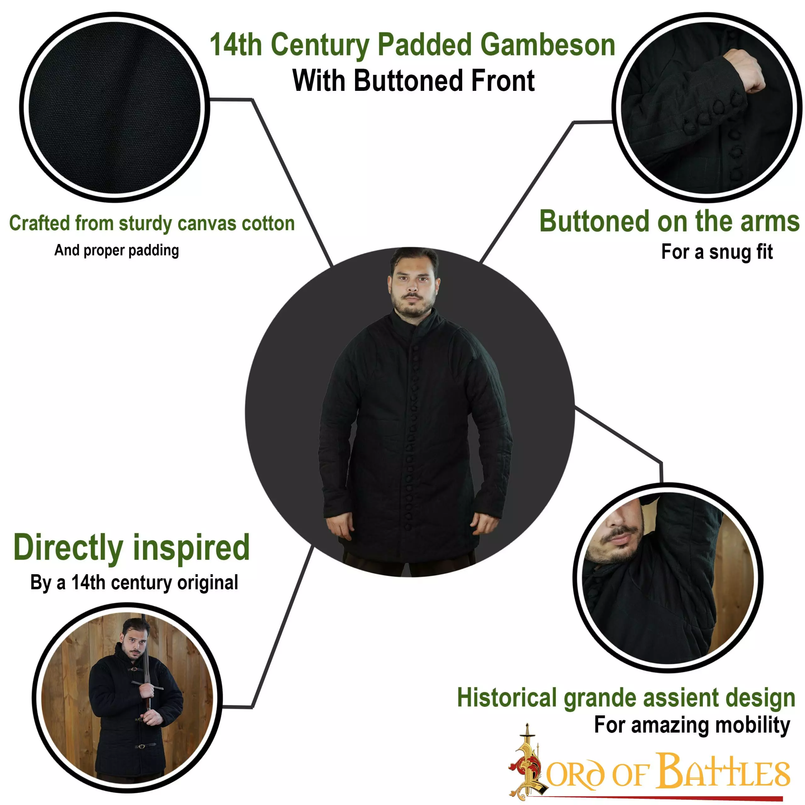 Nuestro gambesón acolchado y abotonado del siglo XIV está fabricado a mano con dos capas de ALGODÓN DE LONA RESISTENTE que intercalan una gruesa capa de acolchado, lo que lo convierte en una armadura perfecta por sí sola para cualquier infante ligero, arquero, artillero o cualquier soldado que dependa de la movilidad para evitar una batalla en la que no quiera luchar. También podría llevarse bajo una armadura de placas o una cota de malla, haciéndolas más cómodas de llevar. Este gambesón en concreto está inspirado directamente en un GAMBESÓN EXISTENTE que perteneció a Charles de Blois durante el siglo XIV.