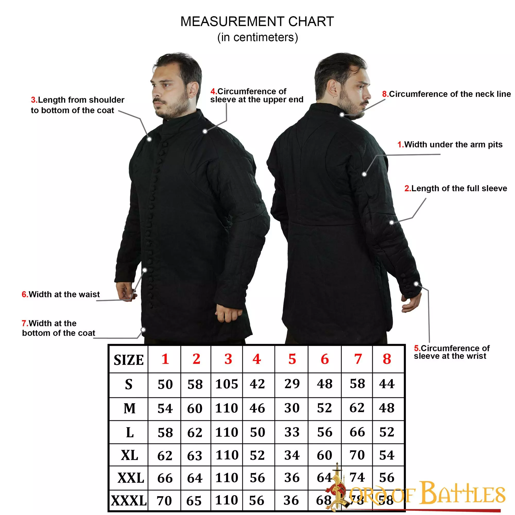 No estamos hablando de gambesones acolchados sintéticos o ultradelgados disponibles en el mercado. Hablamos de LONA ROBUSTA y acolchado REAL, ¡lo que marca la diferencia cuando se busca un gambesón auténtico! Para un ajuste cómodo y regulable, este gambesón viene con mangas abotonadas. Está disponible en seis tallas distintas. Se adjunta un cuadro más detallado con sus fotografías.