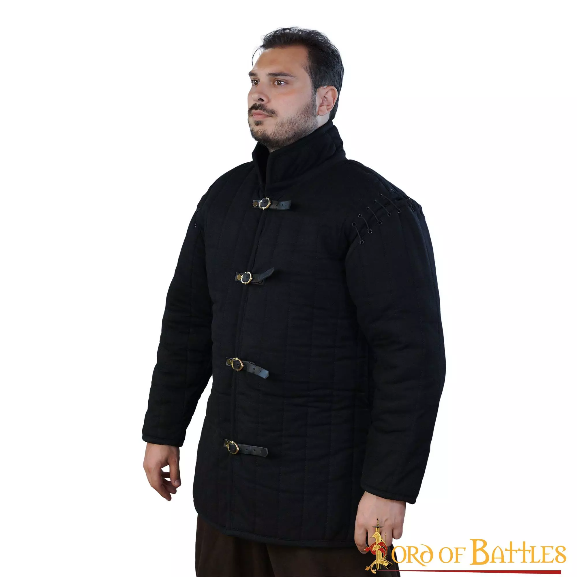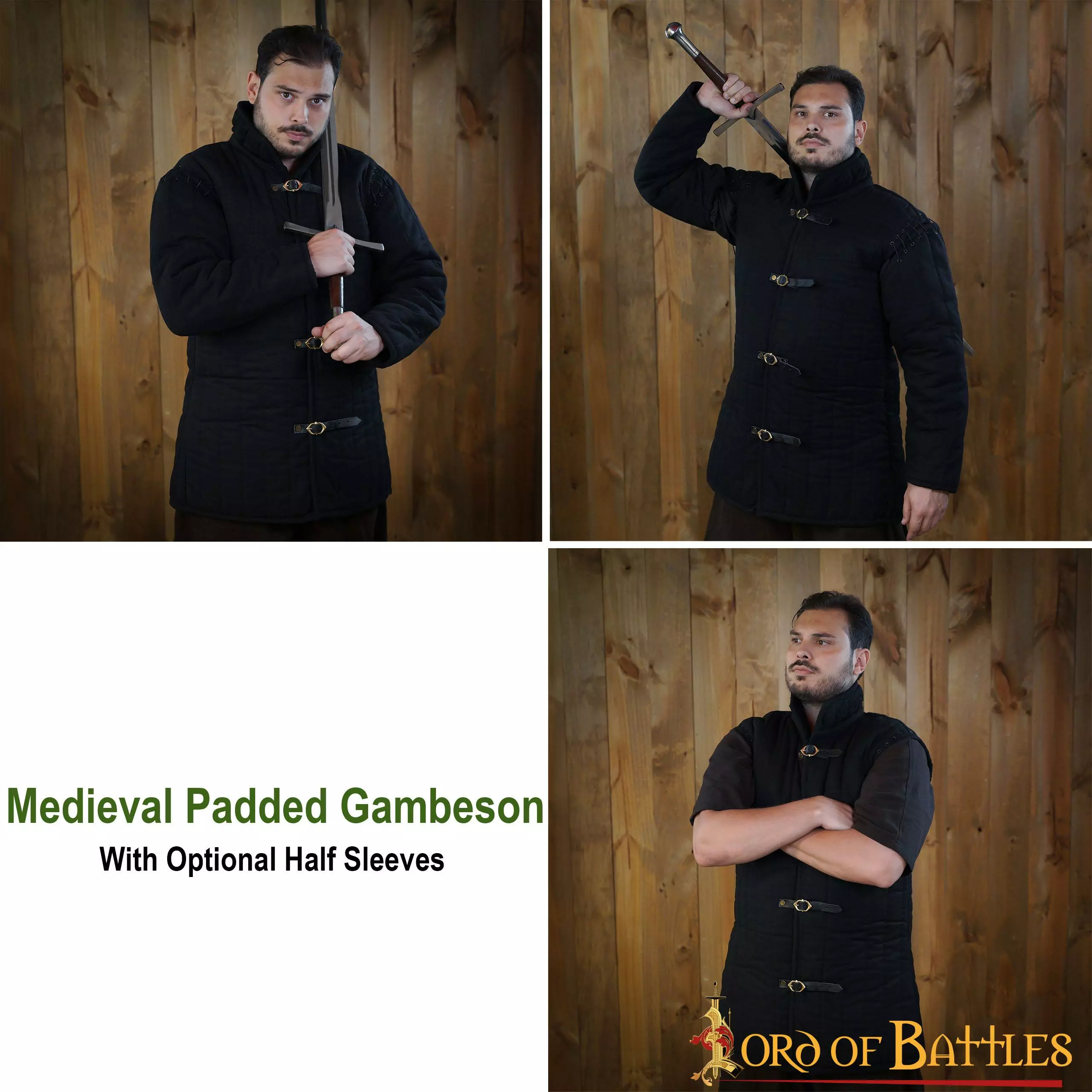 Confeccionado a mano a partir de un robusto lienzo de algodón, nuestro gambesón medieval constituye un cómodo acolchado bajo la armadura de placas y la cota de malla. Además de actuar como un eficaz amortiguador, este gambesón acolchado tiene medias mangas opcionales y un cómodo cierre con cinco hebillas de latón y correas de cuero.