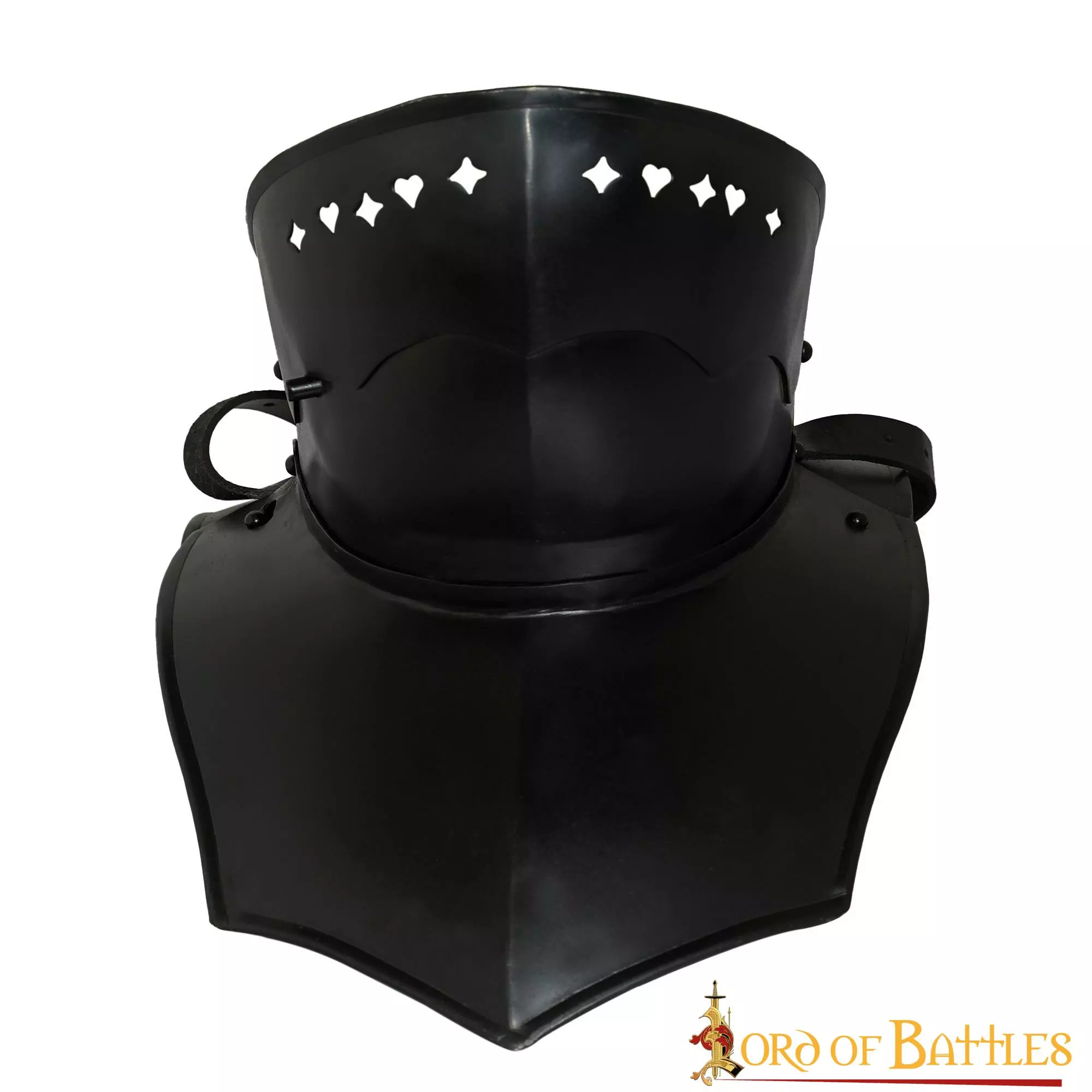 Un casco completamente cerrado no resultaría tan eficaz como esta gorguera de caballero combinada con su salva de confianza. Este estilo fue el preferido por la mayoría de los caballeros fuertemente acorazados desde el segundo cuarto del siglo XV hasta el Renacimiento, cuando se introdujo el casco cerrado. Permitía al portador quitarse fácilmente el casco cuando no lo necesitaba y proporcionaba una protección significativa en el campo de batalla.