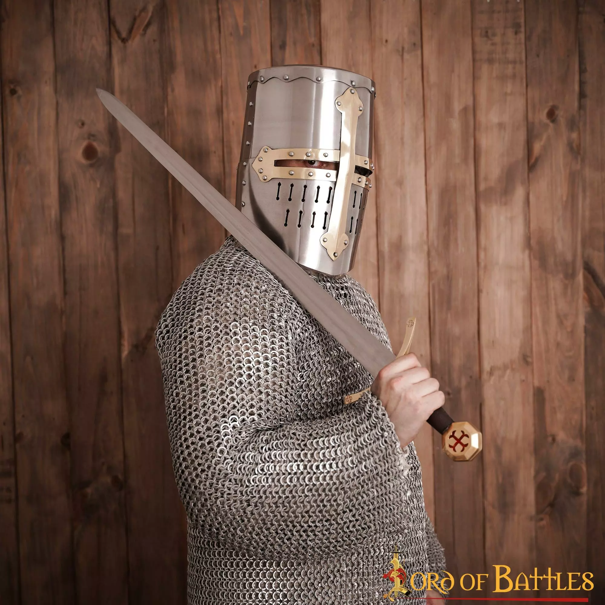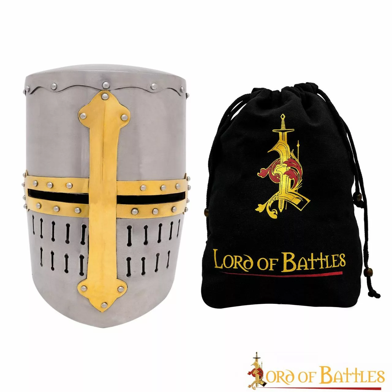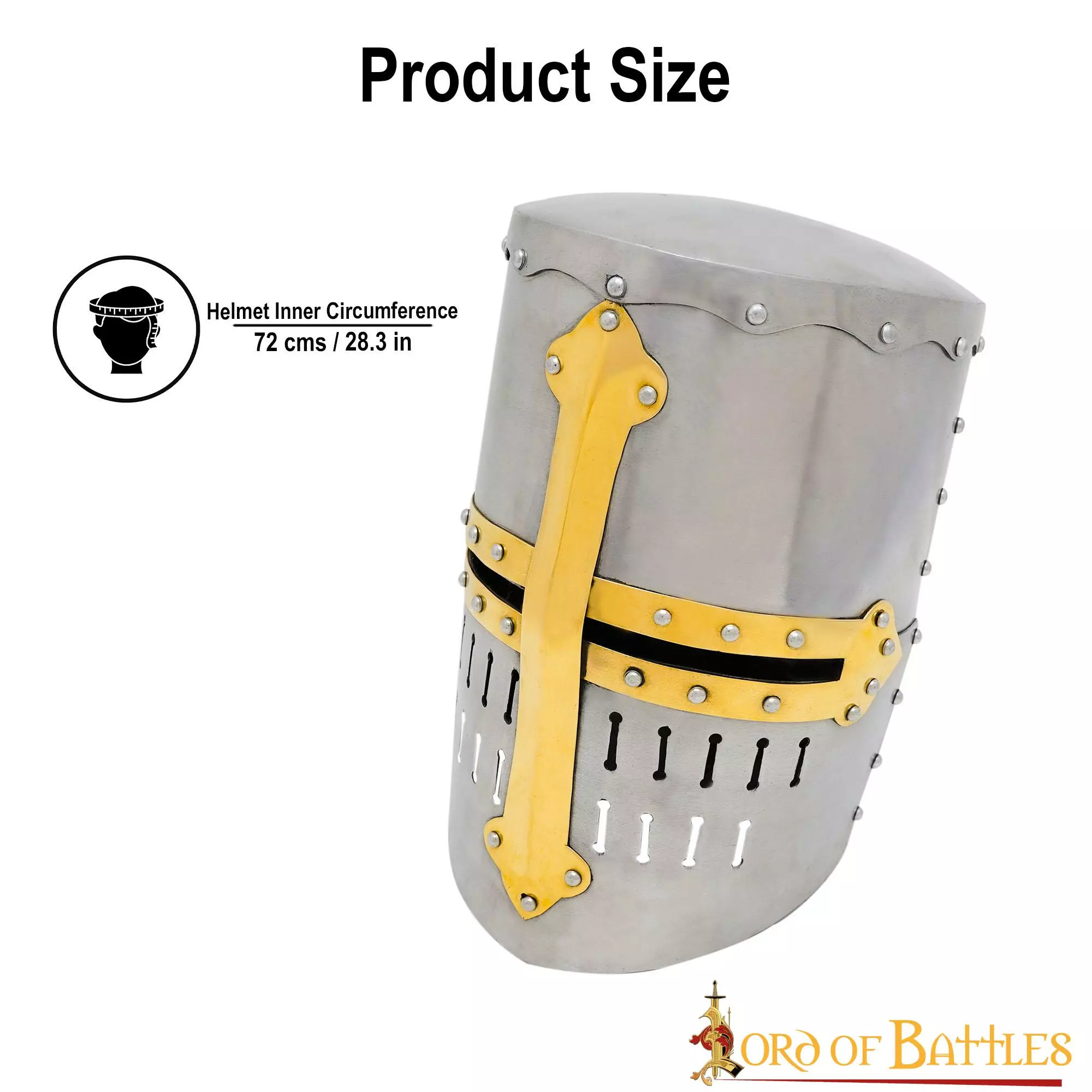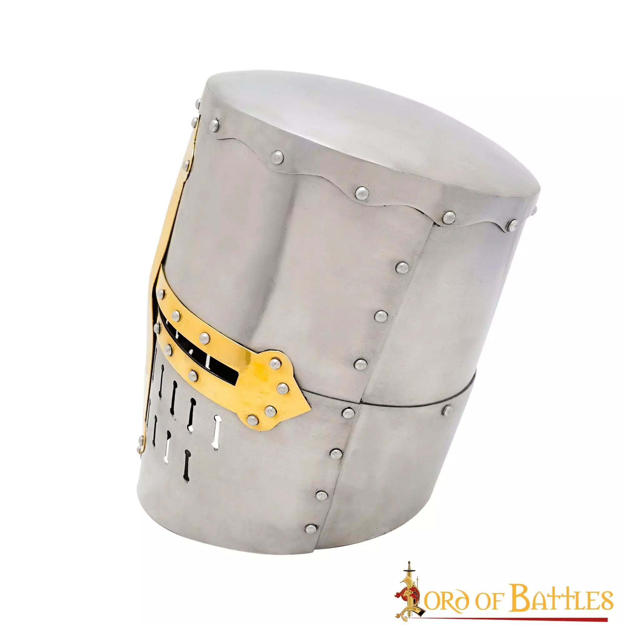 Este casco se inspira directamente en varias fuentes del siglo XIII y, por ejemplo, es muy similar a muchos de los cascos que aparecen en la biblia de Maciejowzki. La cruz de LATÓN PURO remachada en la parte frontal del casco hace que parezca directamente de la Edad Media. Su parte superior plana es típica de ese periodo que evolucionó hacia el yelmo más puntiagudo en forma de pan de azúcar. ¡Conviértete en un caballero o personaje de élite en tu próximo evento medieval con esta pieza de arte de inspiración histórica!