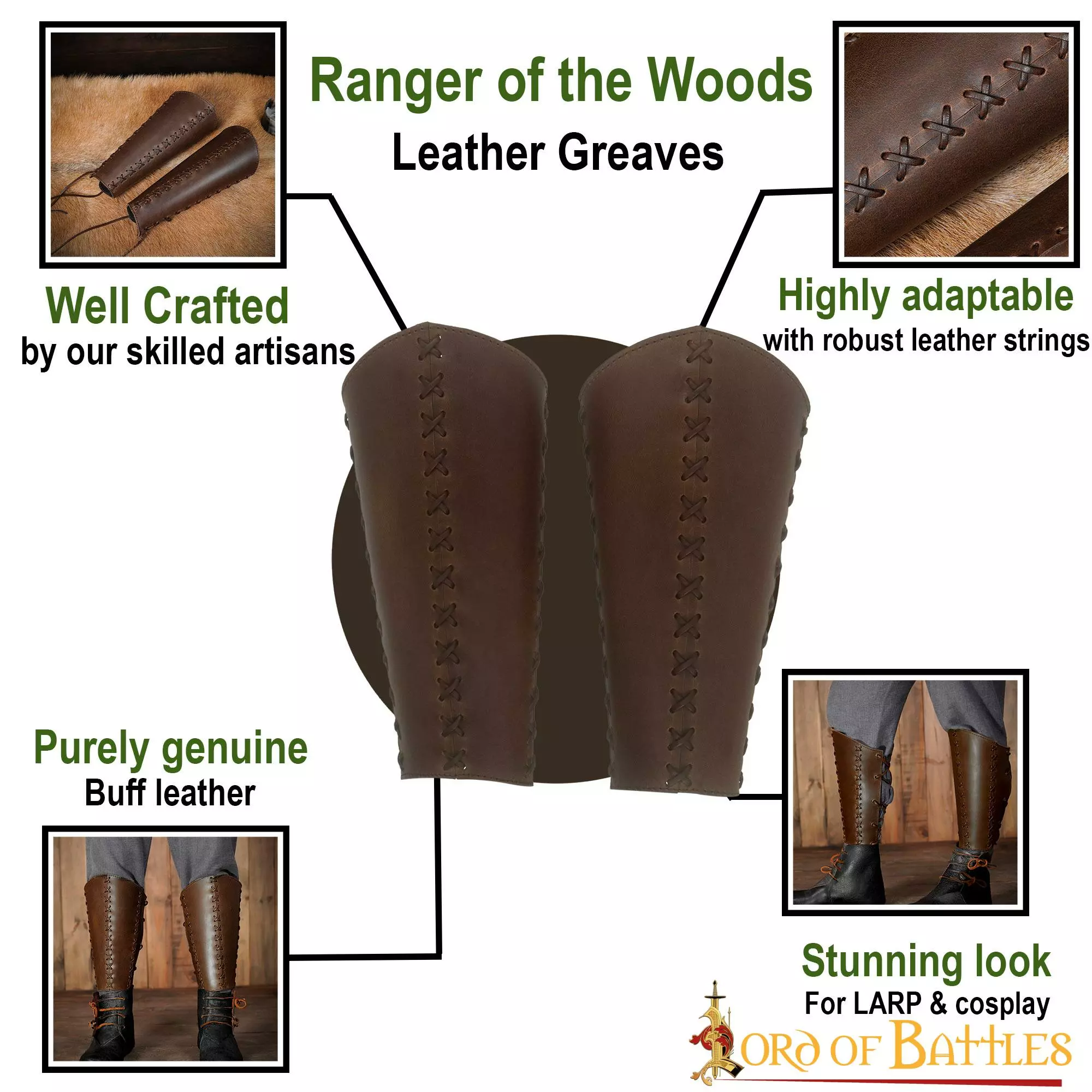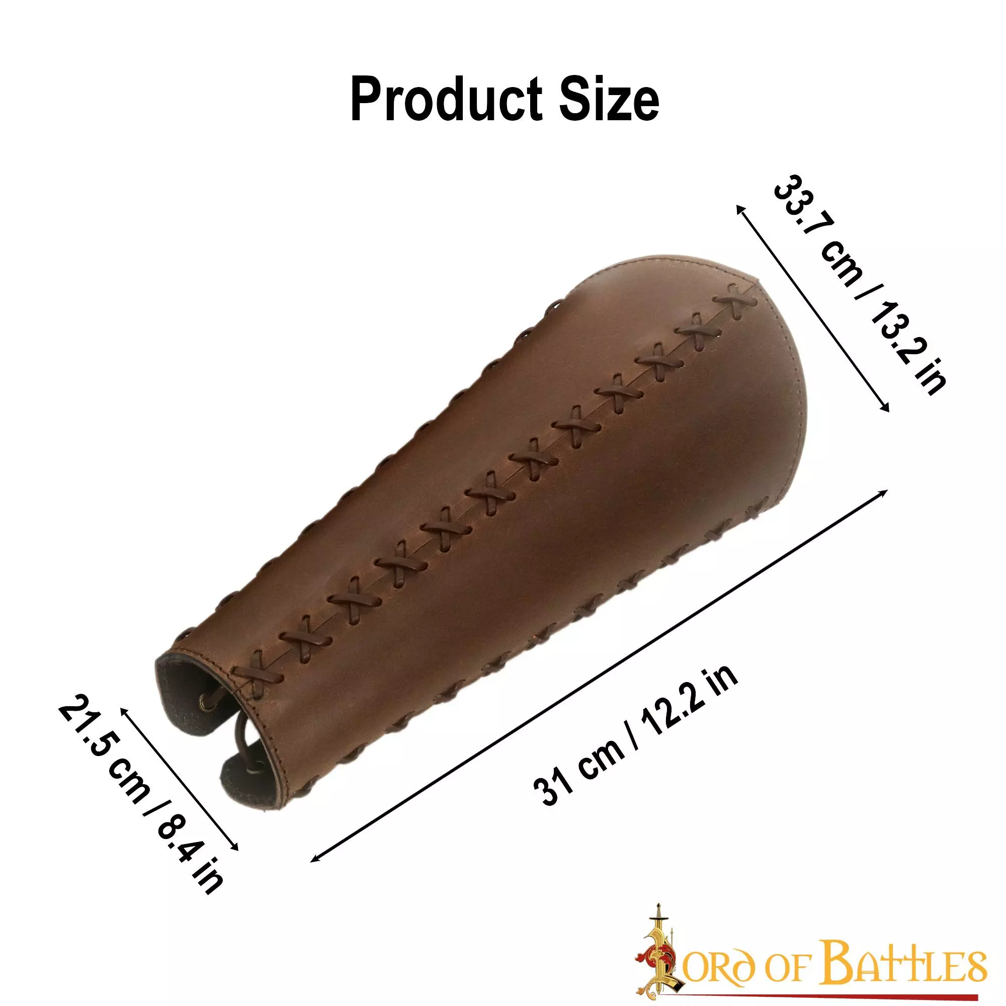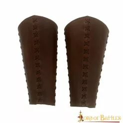 Estas grebas están HECHAS A MANO por nuestros expertos artesanos a partir de auténtica piel de ante. Para ajustarlas, llevan un juego de cordones de cuero auténtico. Cada greba tiene una longitud de unos 31 cm, una anchura superior de unos 33,7 cm y una anchura inferior de unos 21,5 cm.