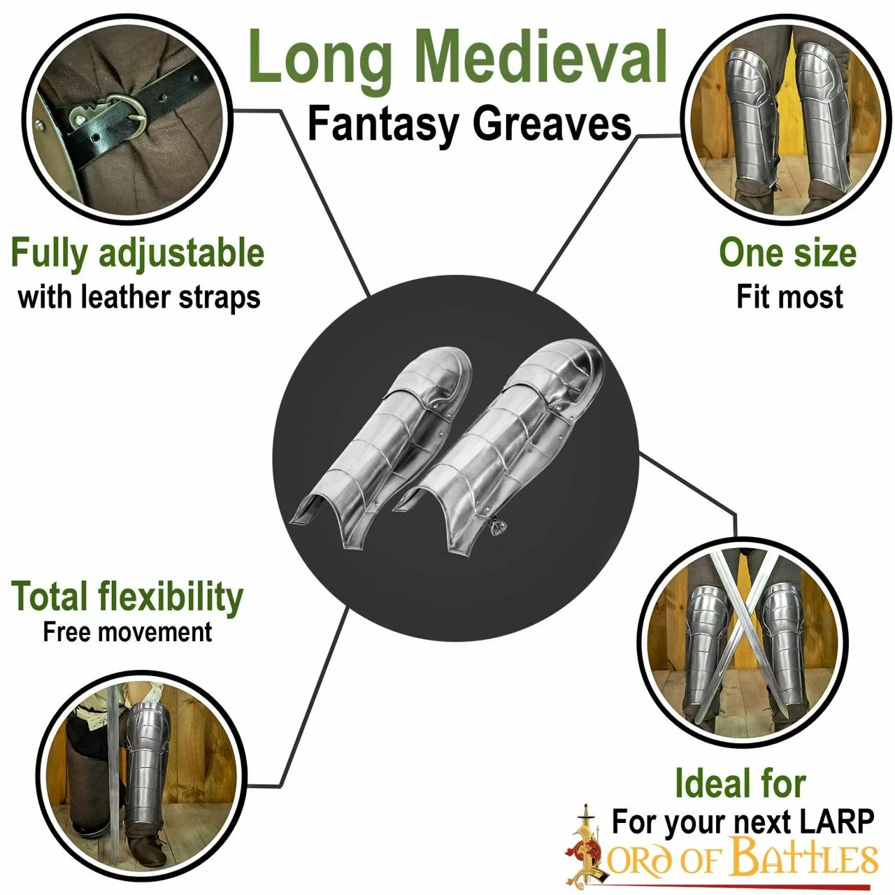 Estas grebas están hechas a mano con acero dulce de calibre 18 y son resistentes pero ligeras, ideales para fantásticos trajes LARP y Cosplay. Cuando se llevan puestas, se sujetan firmemente mediante dos robustas correas de cuero en la parte trasera. Este par viene en una talla que se adapta a la mayoría.