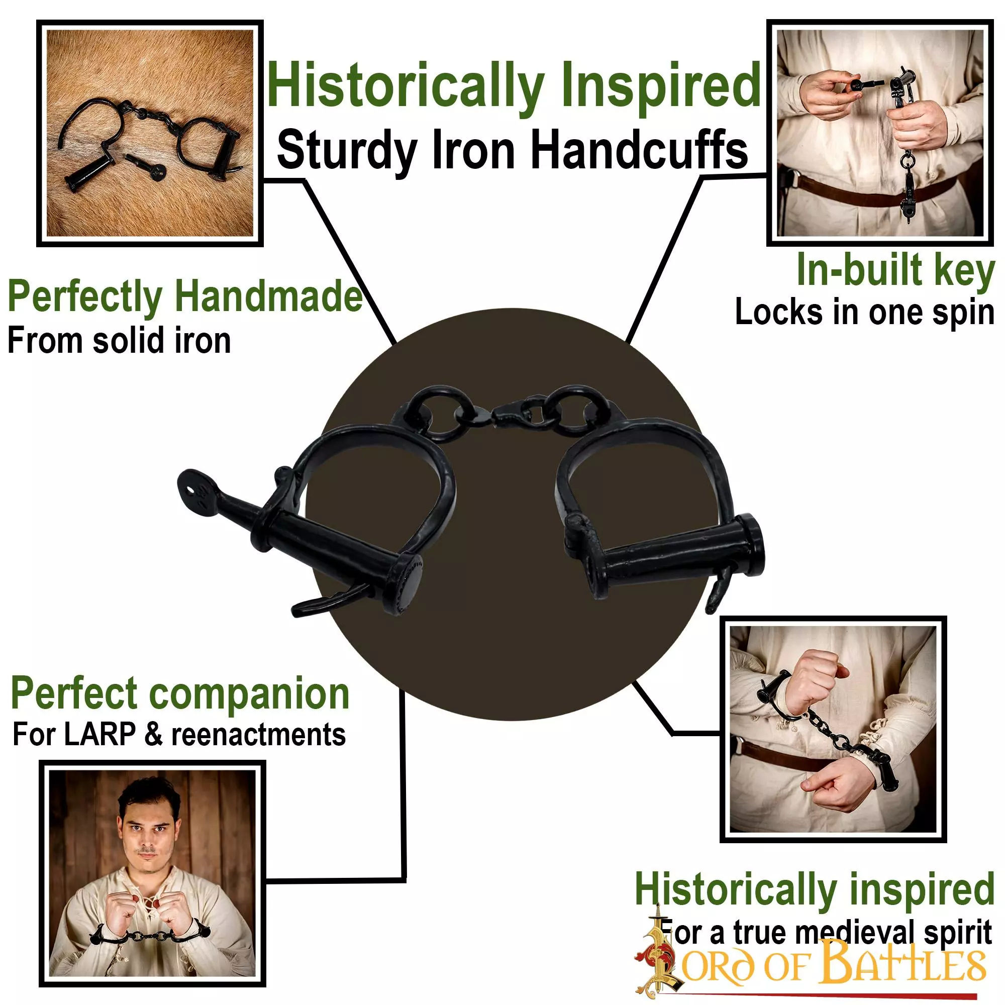 En cuanto atrapes a esos arrogantes maleantes, sujétalos con estas inmejorables esposas/grilletes FORJADAS en resistente HIERRO, ¡hechas justo para un carcelero como tú! Son ideales para un personaje bárbaro de tu reino favorito o incluso para una ambientación de fantasía medieval.