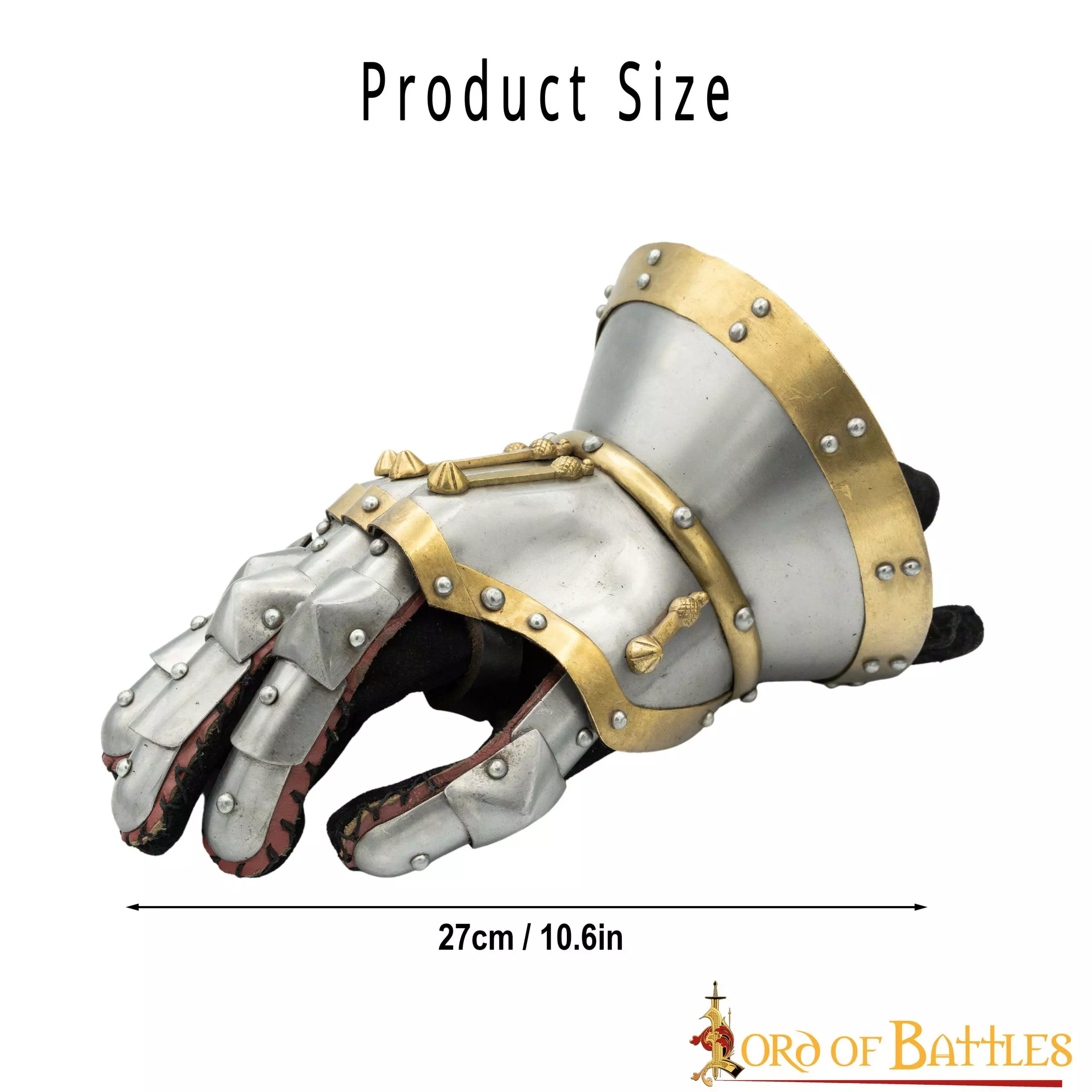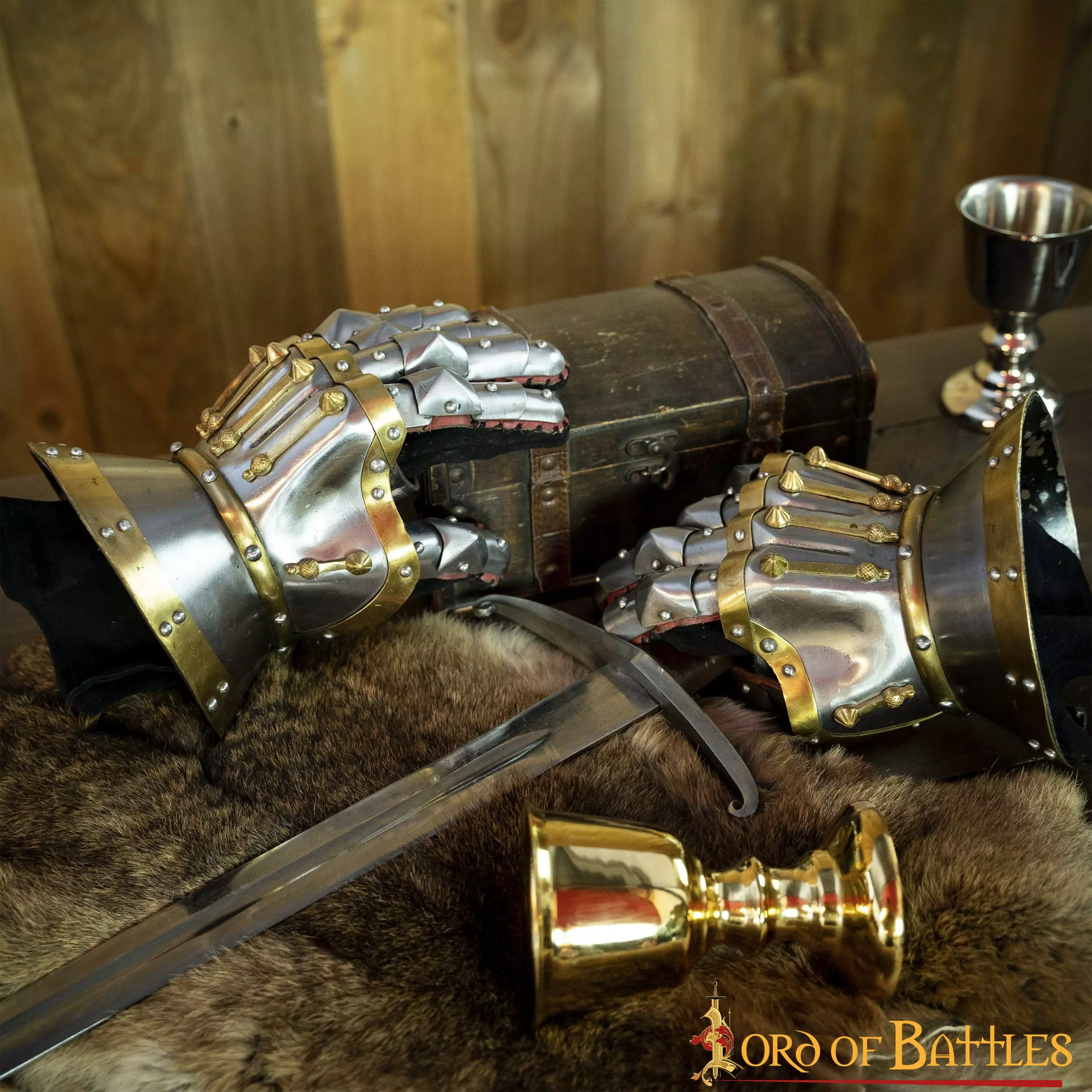 Meticulosamente fabricados a mano con resistente ACERO MILD de calibre 16, son robustos y durarán muchas batallas. Se abrochan con robustas correas de cuero y hebillas de latón macizo. Para una mayor comodidad y agarre, se suministran con guantes de cuero de ante. Su longitud total es de aproximadamente 27 cm (desde la punta del dedo corazón hasta el punto más bajo del guantelete). Se presenta en talla única.