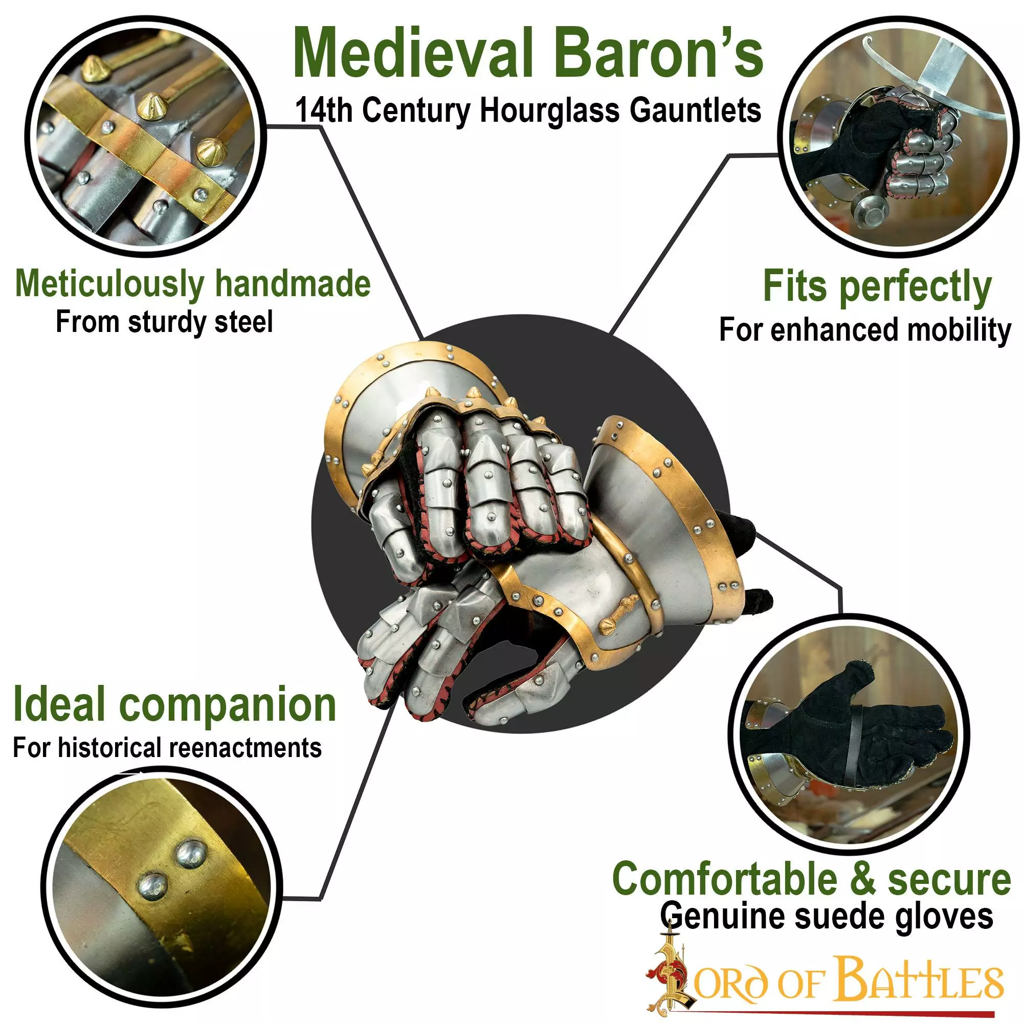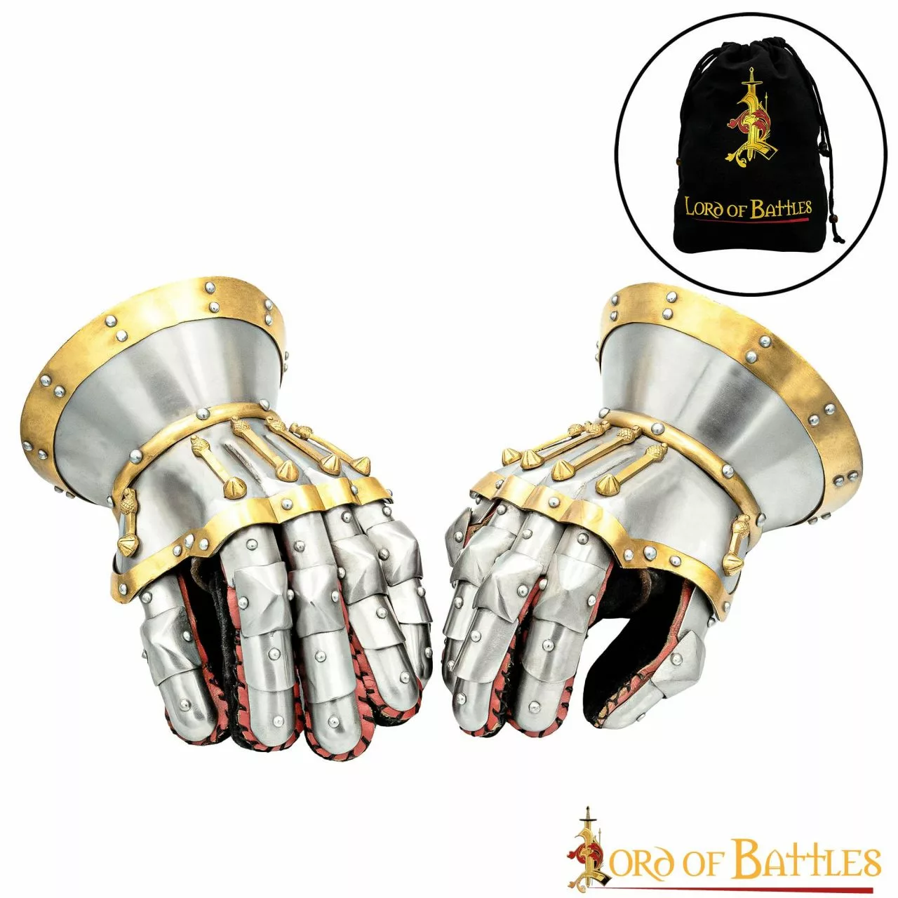 ¿Busca unos guanteletes de inspiración histórica que puedan realzar sus trajes de recreación del siglo XIV? Entonces, estos guanteletes de reloj de arena, con su elegante forma y sus motivos históricos, son sin duda la opción más adecuada para usted. Entre todos nuestros guanteletes, son una de esas piezas de armadura que ofrecen un amplio rango de movimiento y la máxima movilidad para su muñeca, gracias a sus amplios puños típicos de la época. No es de extrañar que se hayan inspirado directamente en un original de la segunda mitad del siglo XIV, actualmente expuesto en Florencia (Italia).