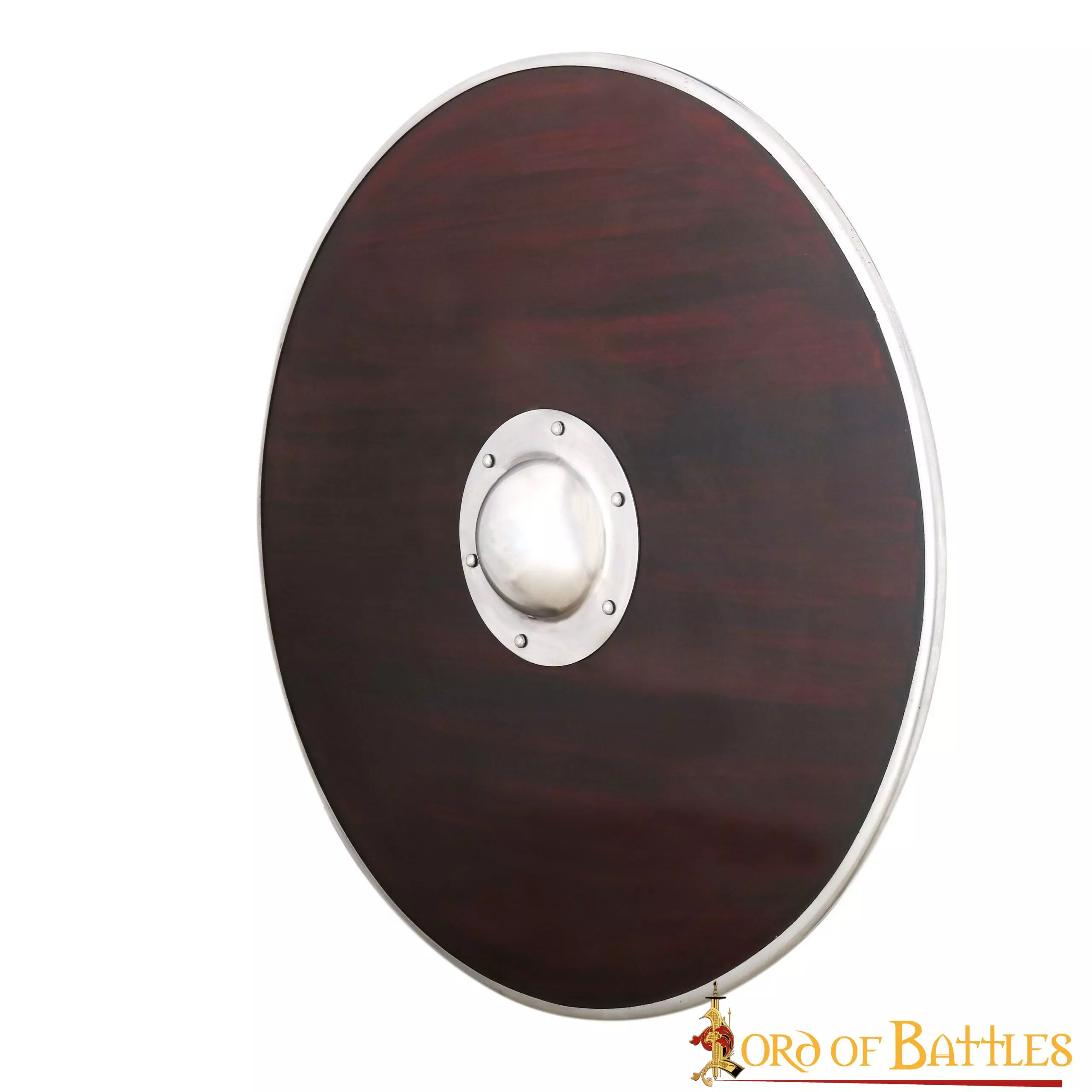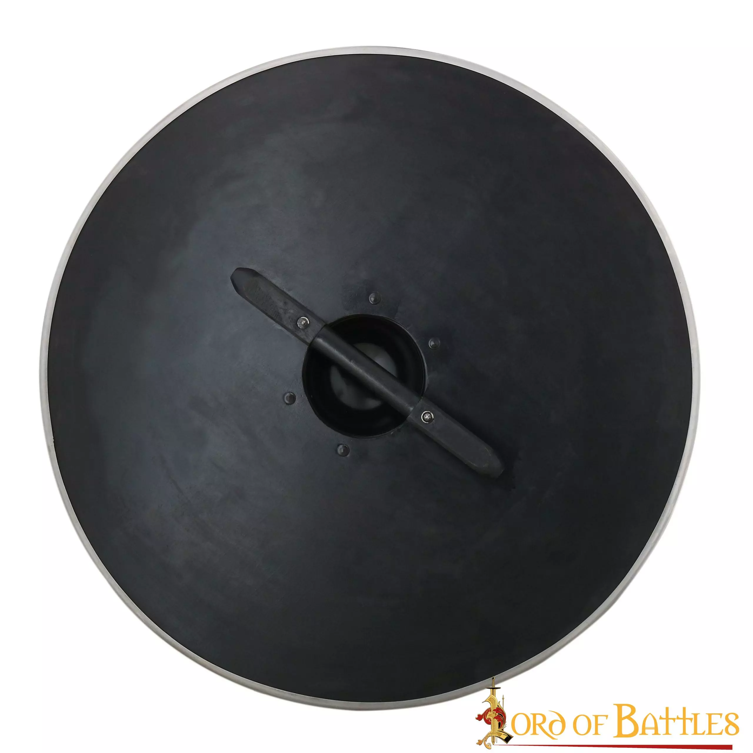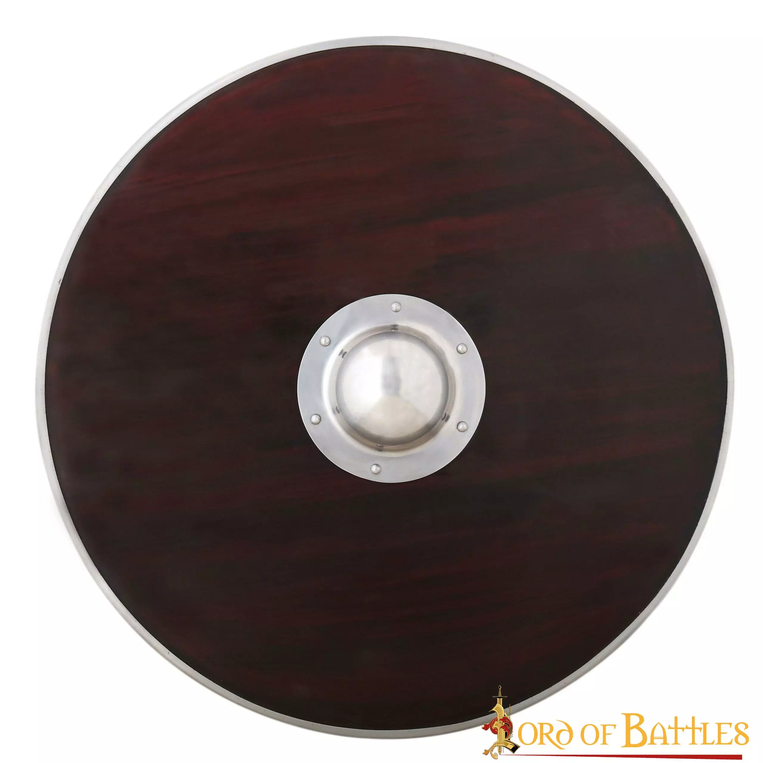 Este escudo, de unos 76,2 cm (30 pulgadas) de diámetro, está meticulosamente fabricado a mano con madera auténtica. Este escudo viene con un mango de metal reforzado con una cubierta de madera para un mejor agarre. Los detalles metálicos de este escudo son de acero dulce de calibre 18, mientras que el umbo es de acero dulce de calibre 16.