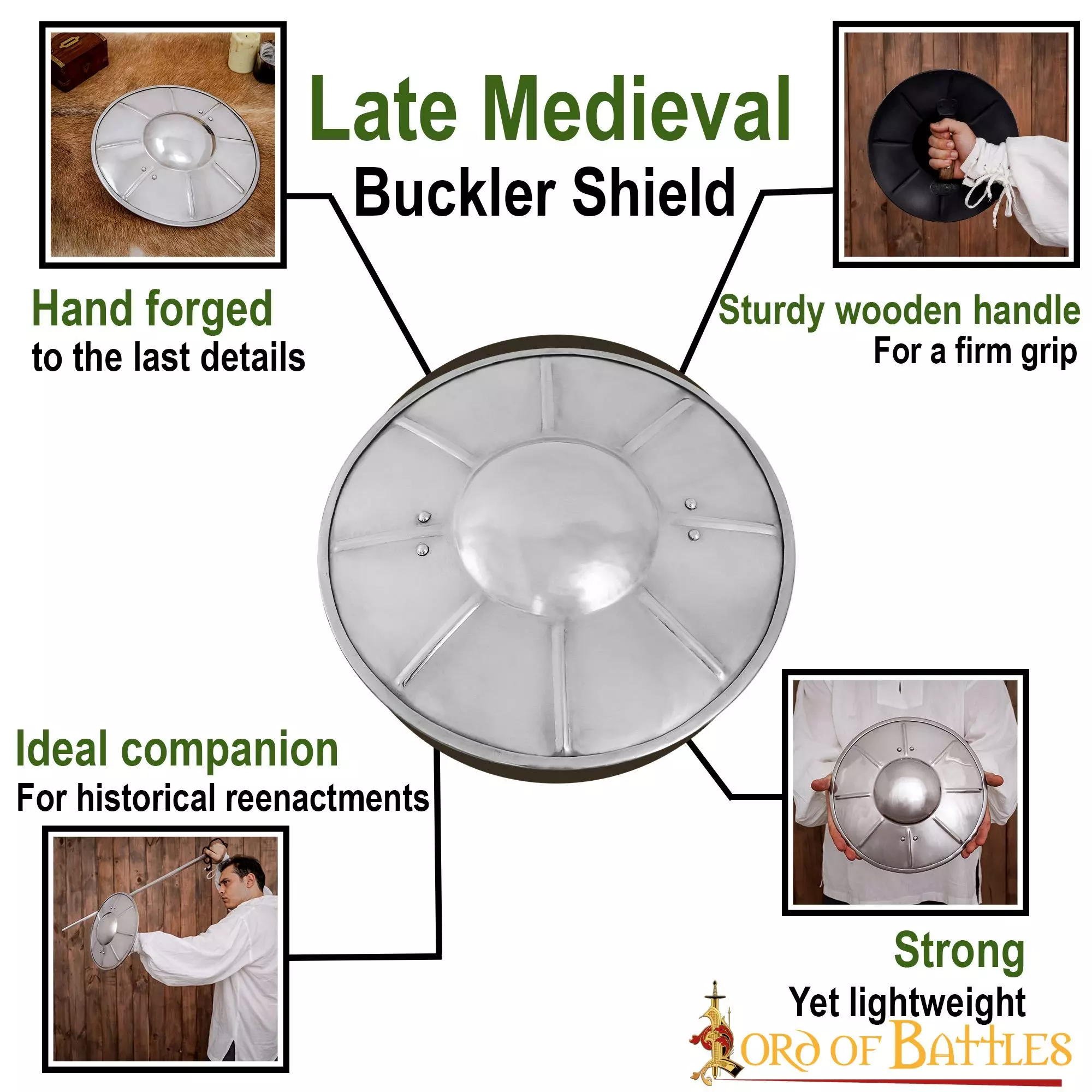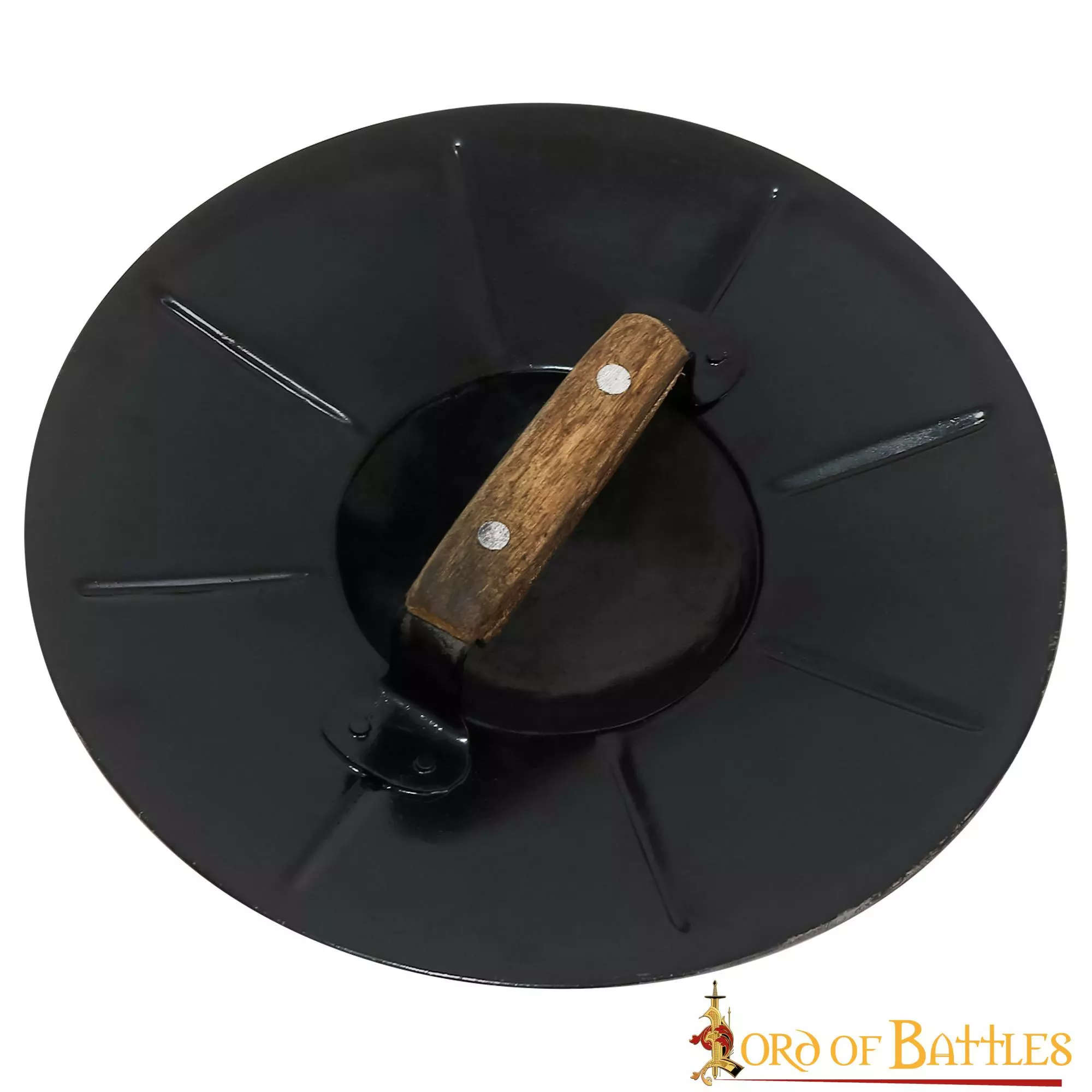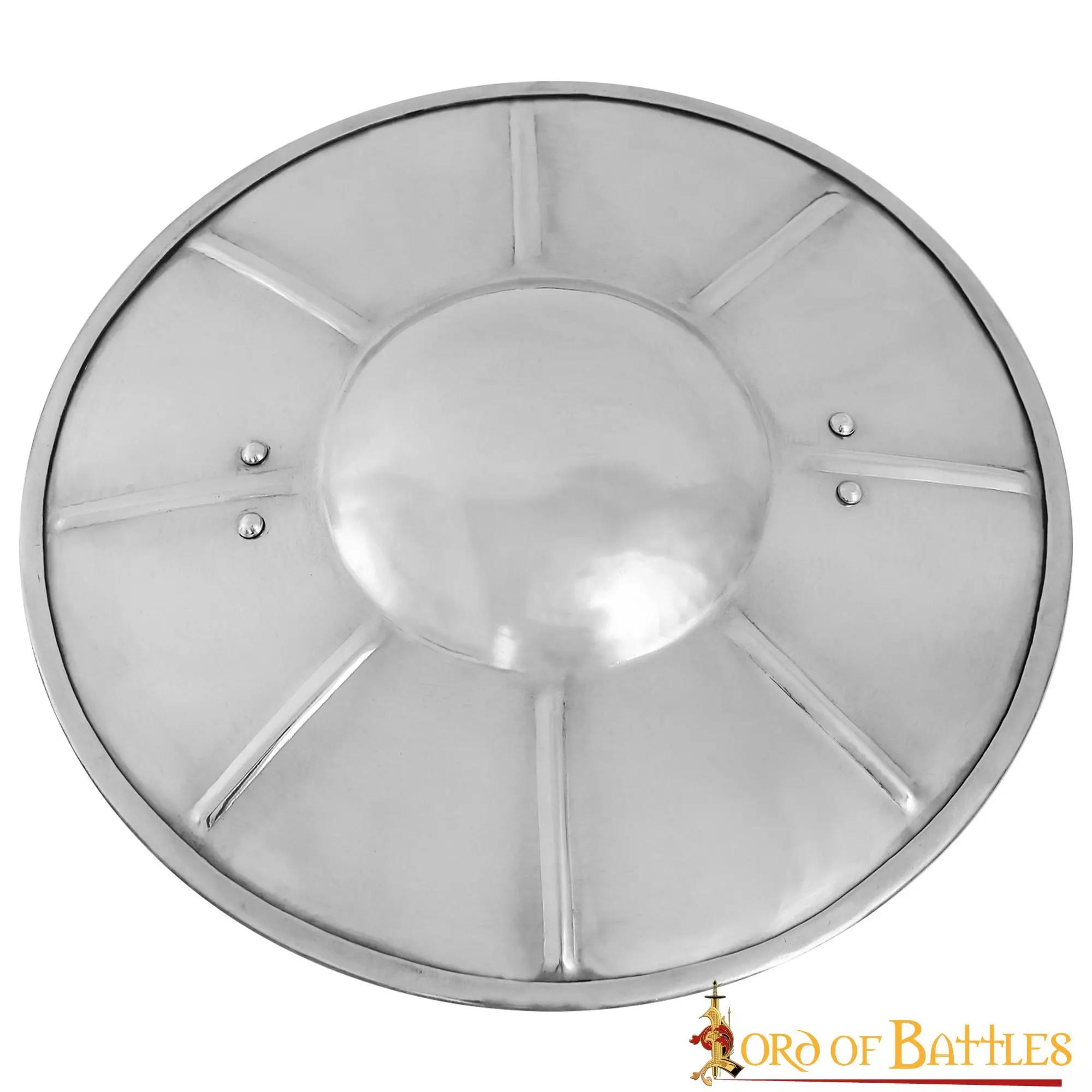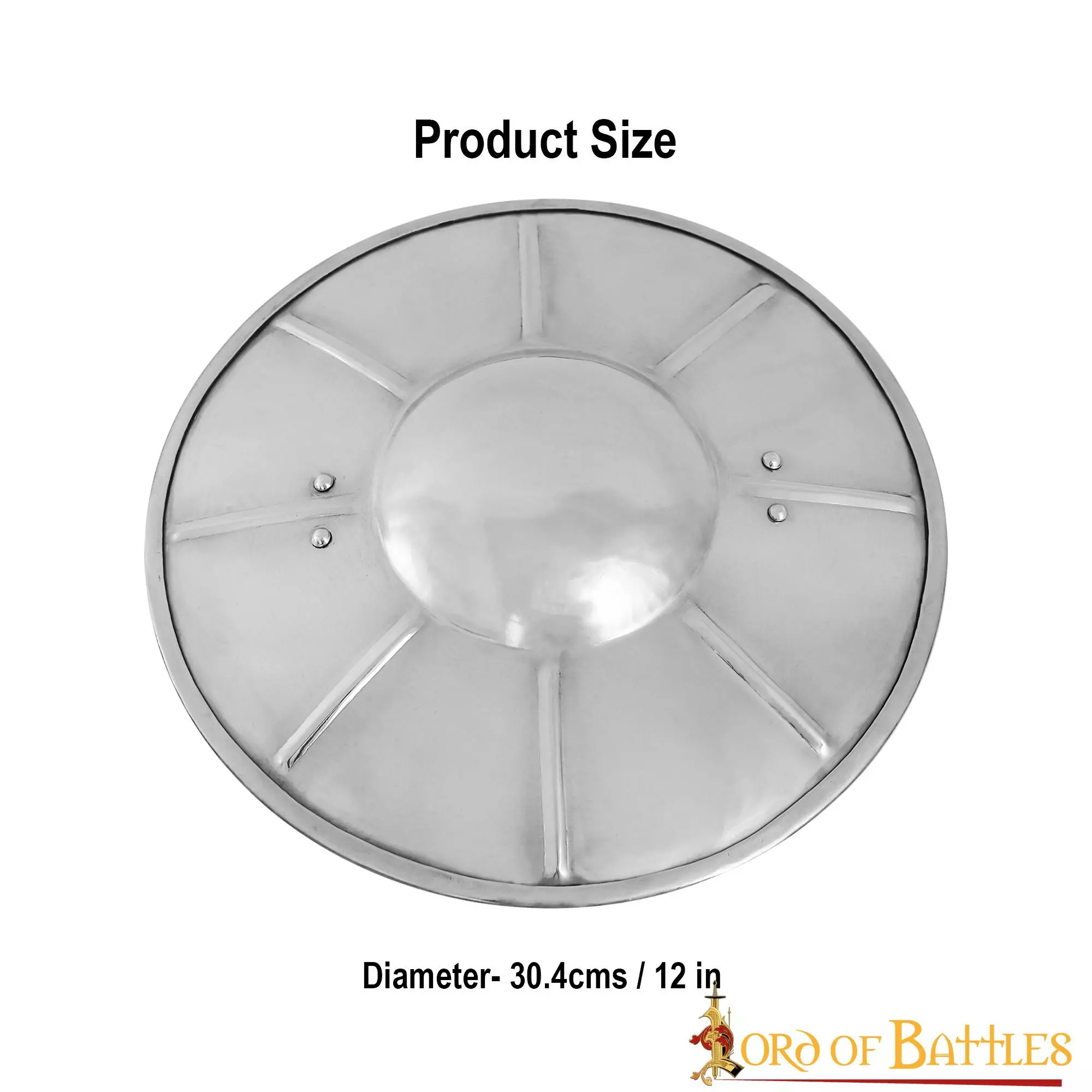Este escudo con broquel está fabricado a mano con acero de calibre 16, reforzado con elegantes estrías góticas, e incluye un mango de metal reforzado con madera genuina que absorbe los golpes. Su diámetro es de aproximadamente 12 pulgadas (30,4 cm). Se trata de un broquel estriado totalmente funcional que puede utilizarse para recreaciones históricas y también para decoración.