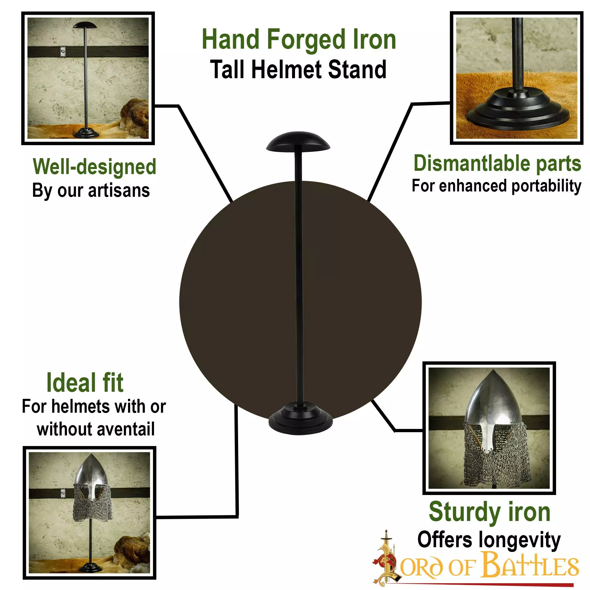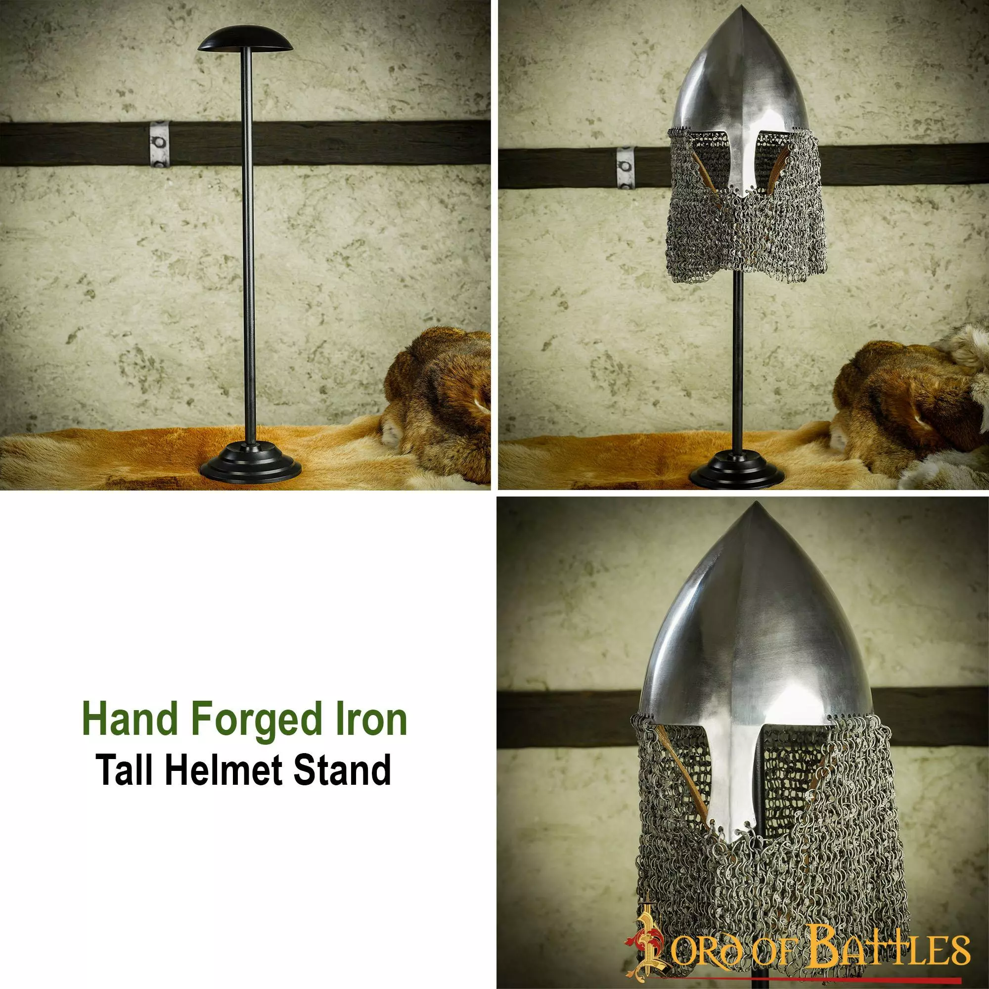 Si eres un caballero caballeroso o incluso un entusiasta coleccionista de poderosos cascos medievales, nuestro soporte para cascos de hierro será el mejor accesorio para mostrar tus gloriosos yelmos (con o sin aventail o camail).