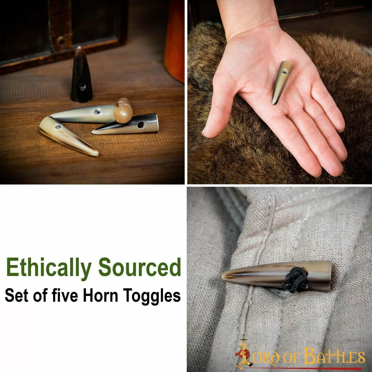 Cada toggle de cuerno se elabora minuciosamente a partir de un cuerno de buey obtenido éticamente, lo que le confiere robustez y durabilidad. Cada uno tiene una longitud de aproximadamente 2 pulgadas. Estos toggles se suministran en un utilitario juego de cinco. Tenga en cuenta que se trata de un producto natural y debe considerarse la variación de tamaño y color. Es un producto natural que se deteriora con el tiempo y, por lo tanto, pueden aparecer grietas.