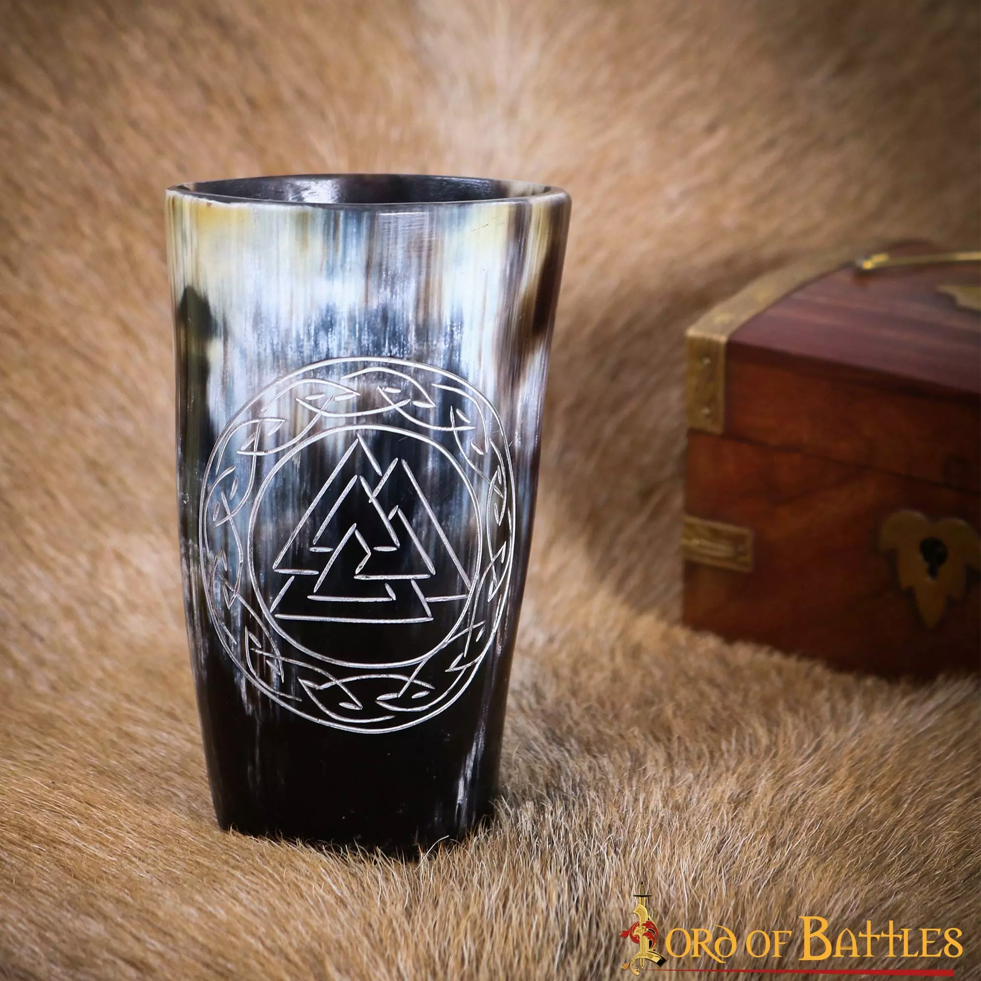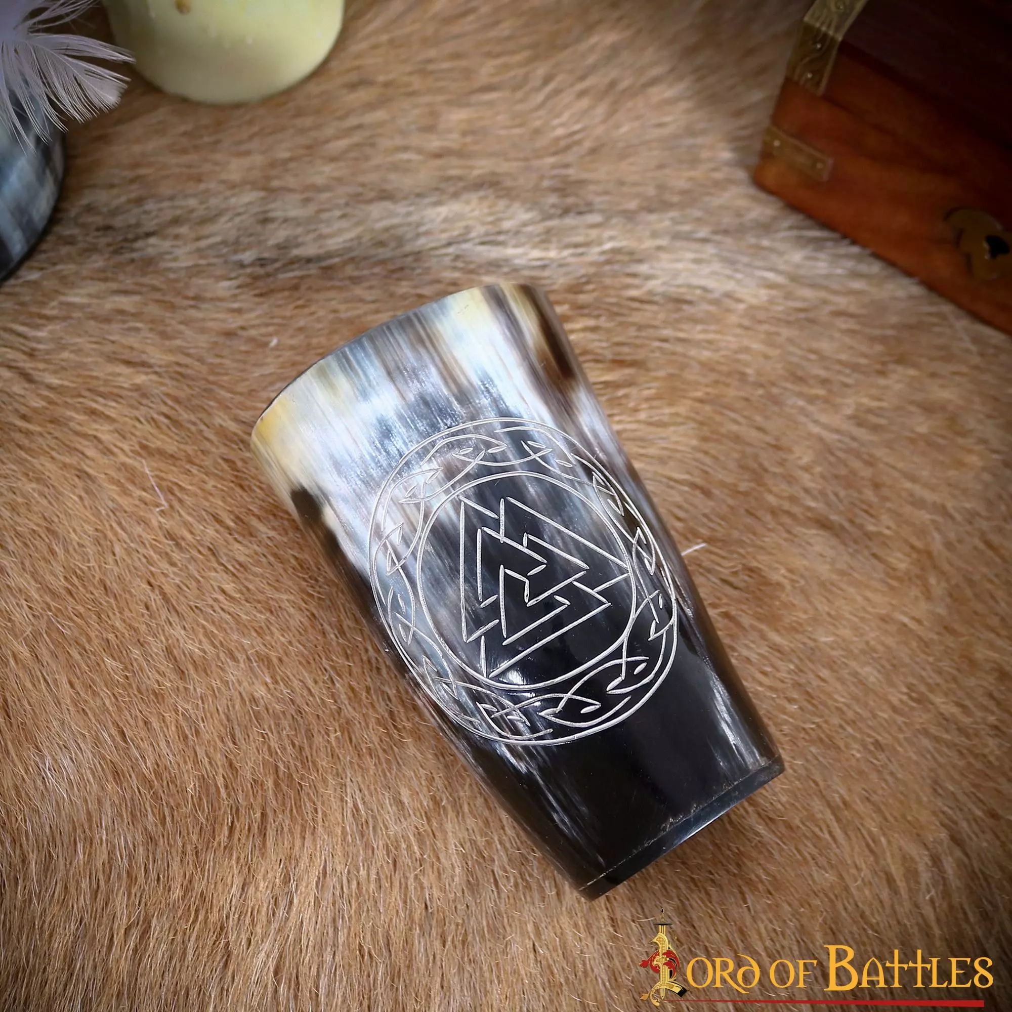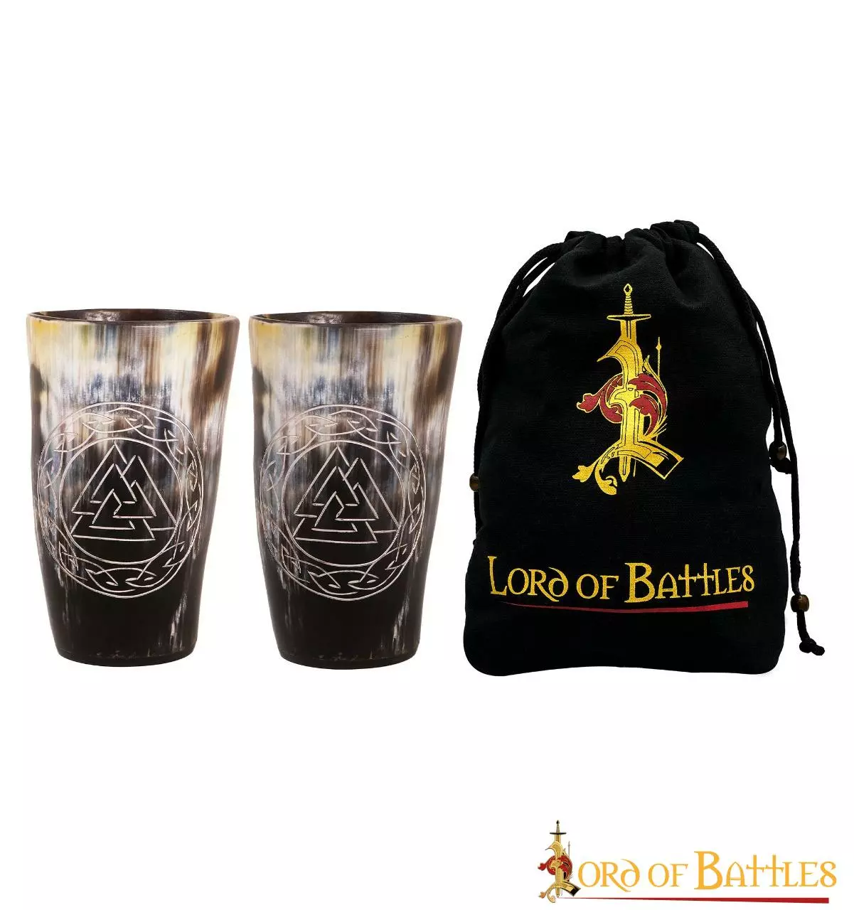 Este par de vasos de cuerno para beber con un diseño de valknut grabado complementará a la perfección tu liderazgo y lealtad hacia tu clan. Su meticuloso diseño contribuye a su auténtico aspecto vikingo y es algo que sin duda debe poseer. Te lo proporcionamos en pareja, para que tú y tu compañero favorito podáis brindar juntos por vuestro inseparable vínculo. Cuidamos tus productos de cuerno tanto como tú y, por eso mismo, se entregan en una robusta bolsa de lona de algodón.