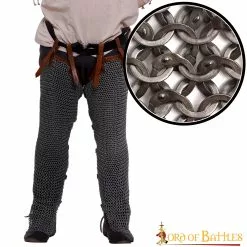 Esta cota de malla está fabricada de forma artesanal con anillos de acero dulce de calibre 17 de unos 9 mm de diámetro cada uno, remachados con RIVETS DE CUÑA. Para aumentar la resistencia, los anillos se alternan con ANILLOS PLANOS SÓLIDOS.