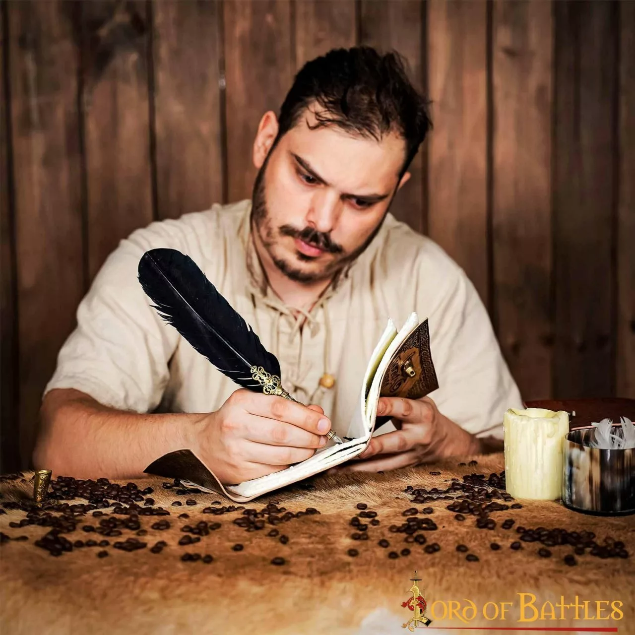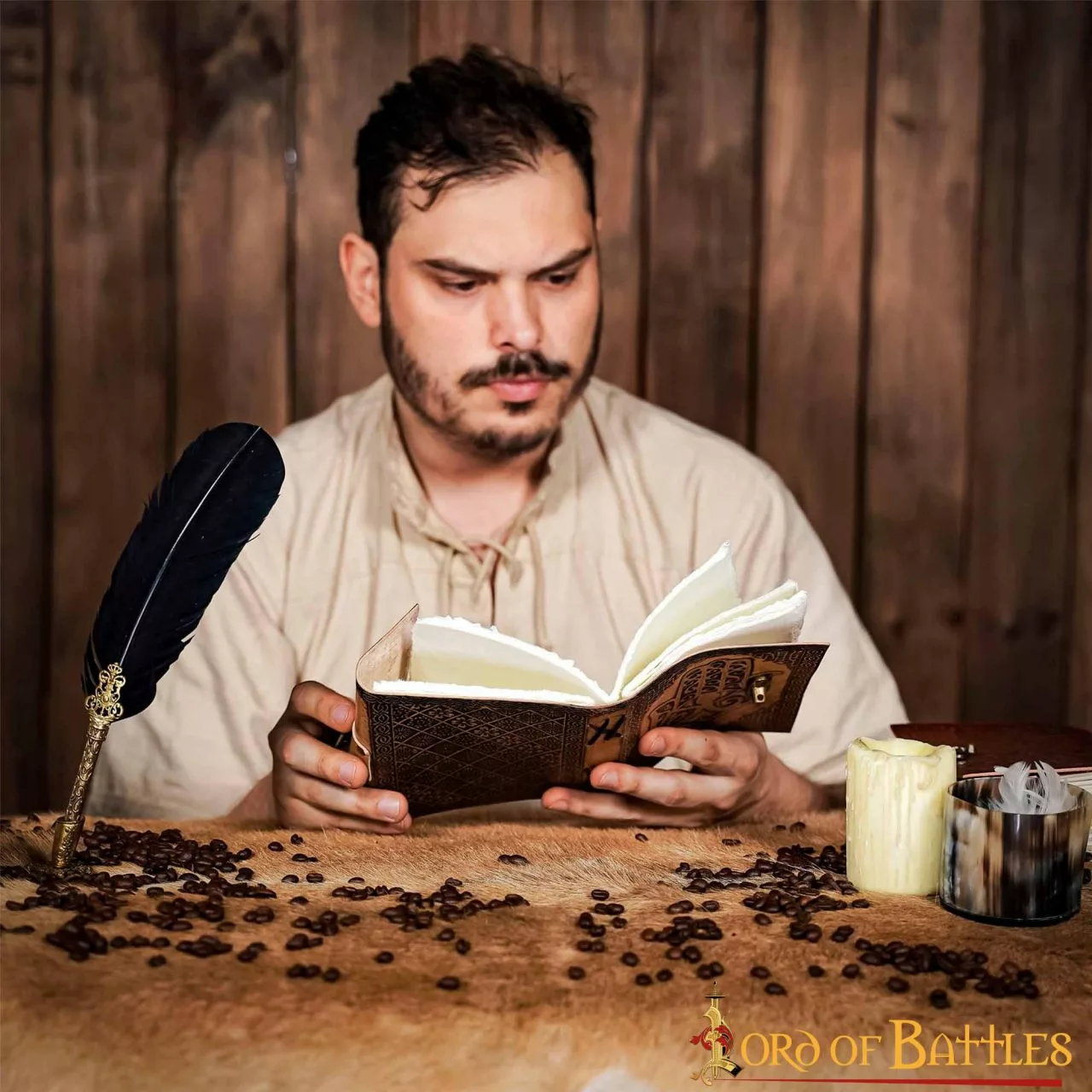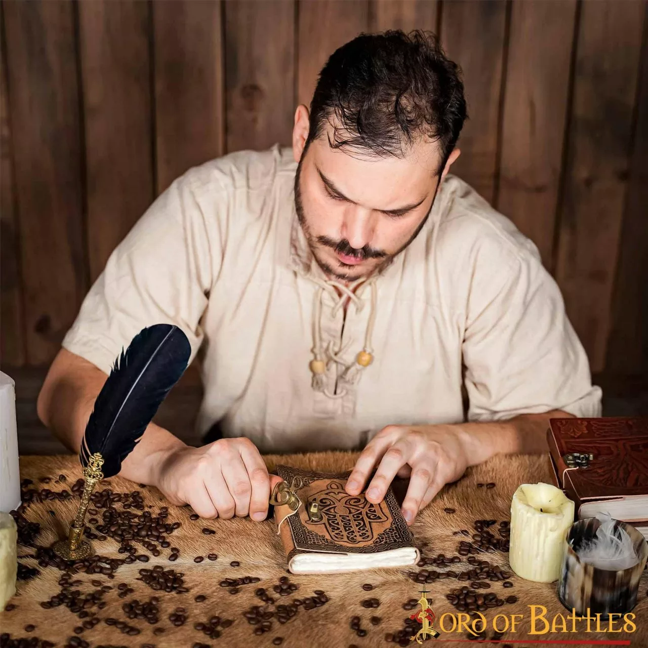 Nuestro diario de cuero de (7 X 5) pulgadas está confeccionado minuciosamente a mano con auténtica piel de ante y tiene 78 papeles naturales de la mejor calidad, con bordes de barbas, hechos a mano y encuadernados con un resistente cordel de algodón. El diario se cierra con un robusto candado de latón antiguo.