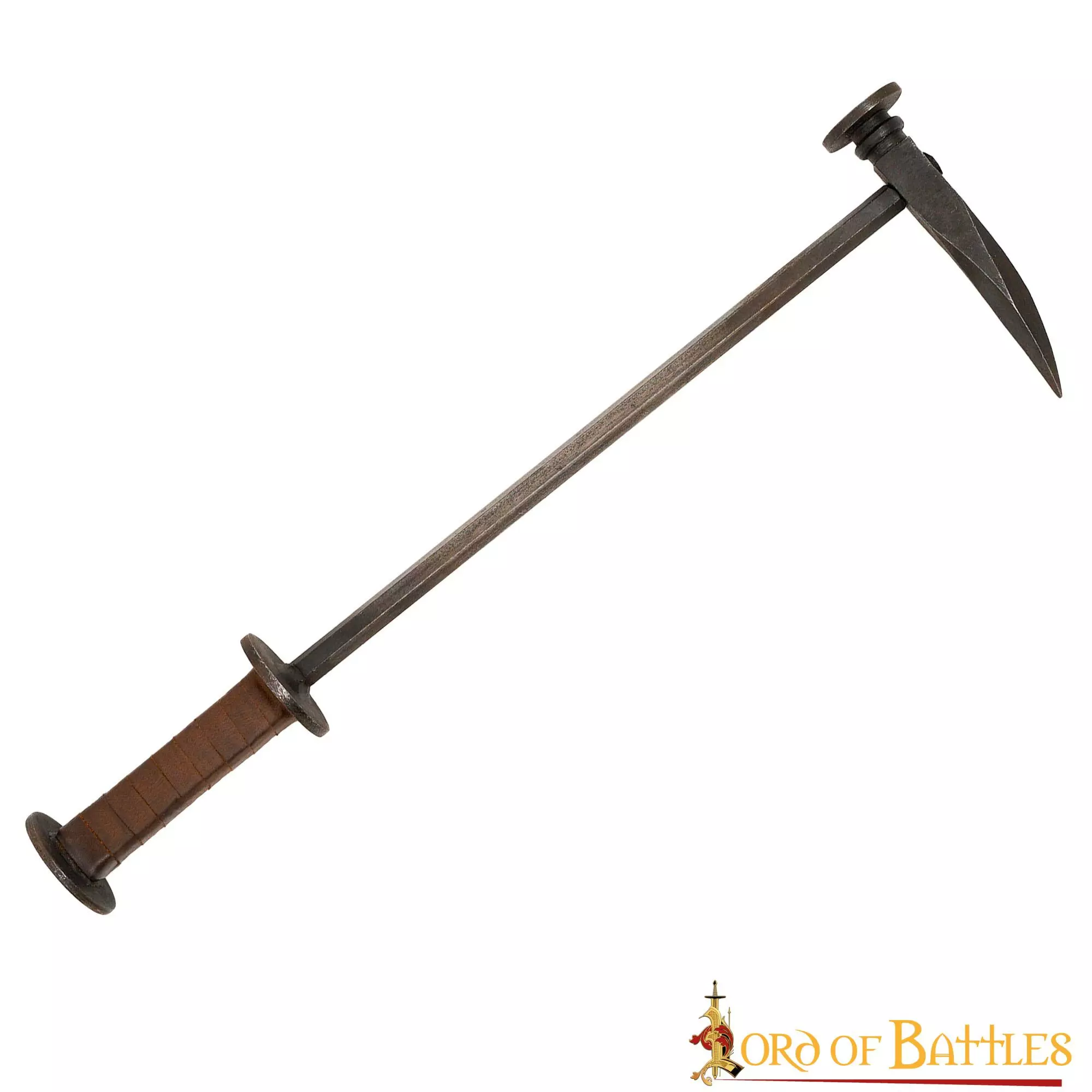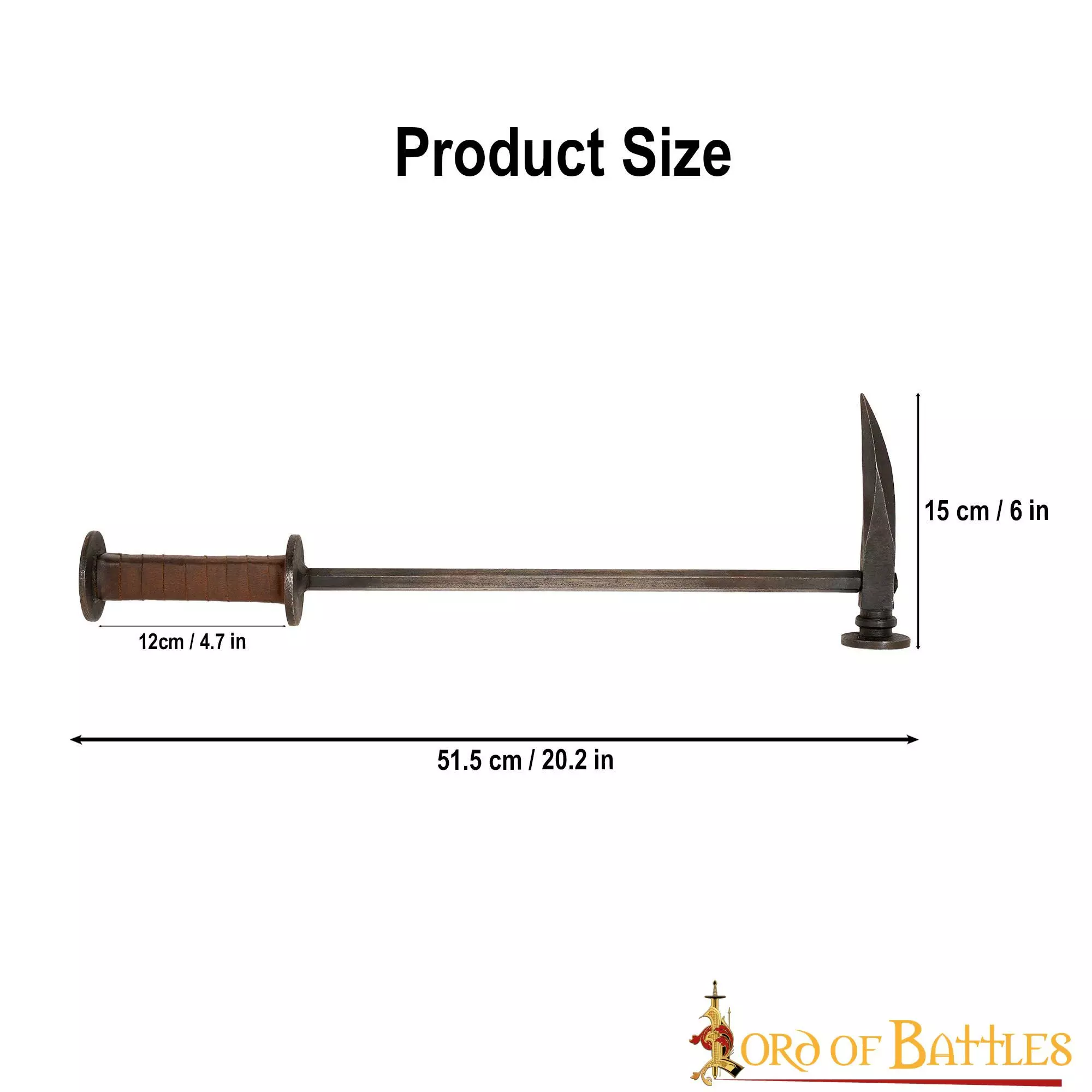 Fabricado a mano con ACERO AL CARBONO RESISTENTE, el martillo de espiga completa tiene un extremo con púas que produce un poderoso impacto, suficiente para derrotar a tus enemigos. El mango está forrado con CUERO GENUINO para un mejor agarre en el campo de batalla. Al ser un martillo funcional, es ideal para el combate real. Si vas a usarlo para recreaciones o cosplay, hazlo con extrema precaución, ya que es totalmente capaz de infligir daño. La longitud total de este martillo es de aproximadamente 20,2 pulgadas; la cabeza del martillo es de 6 pulgadas de largo y el mango es de aproximadamente 4,7 pulgadas.