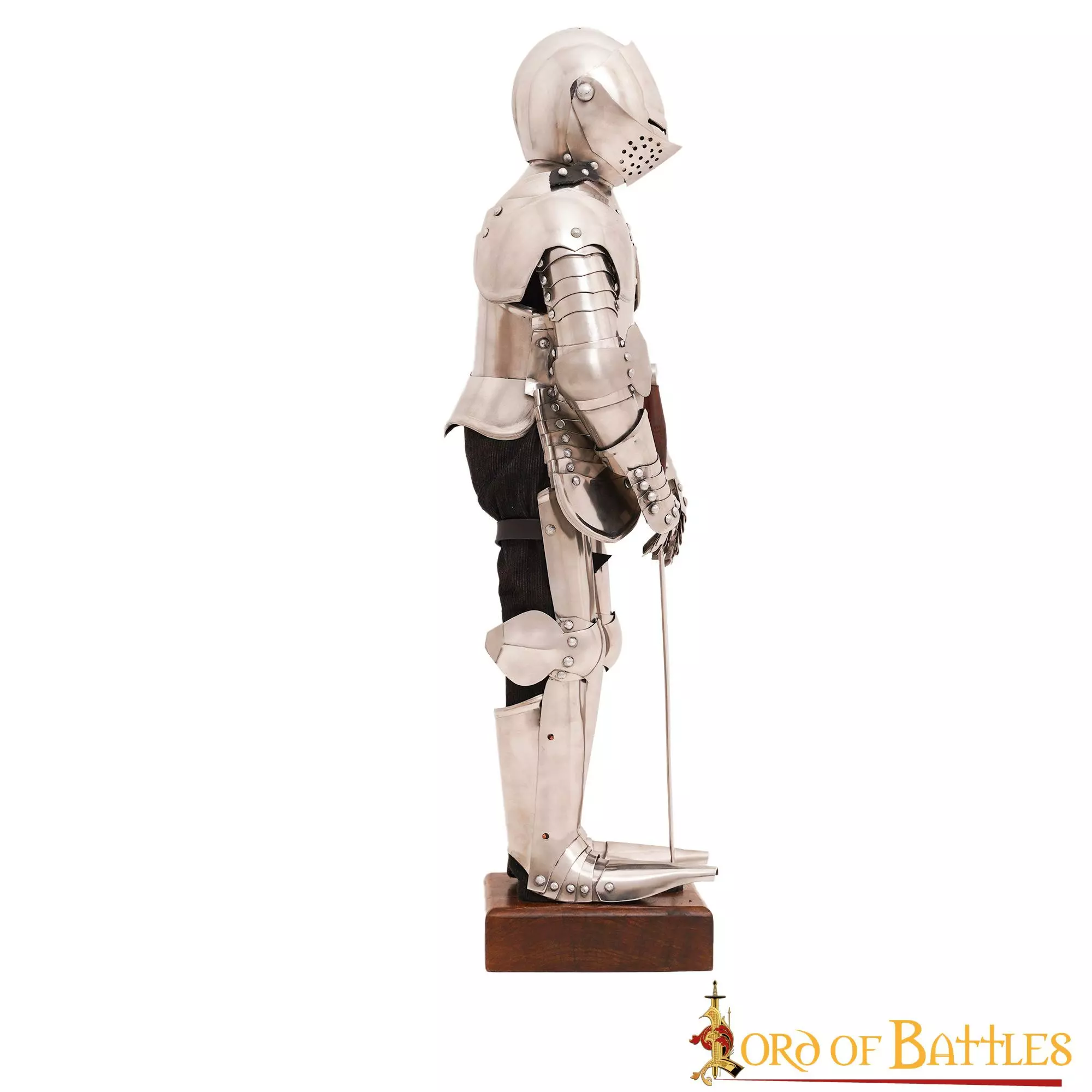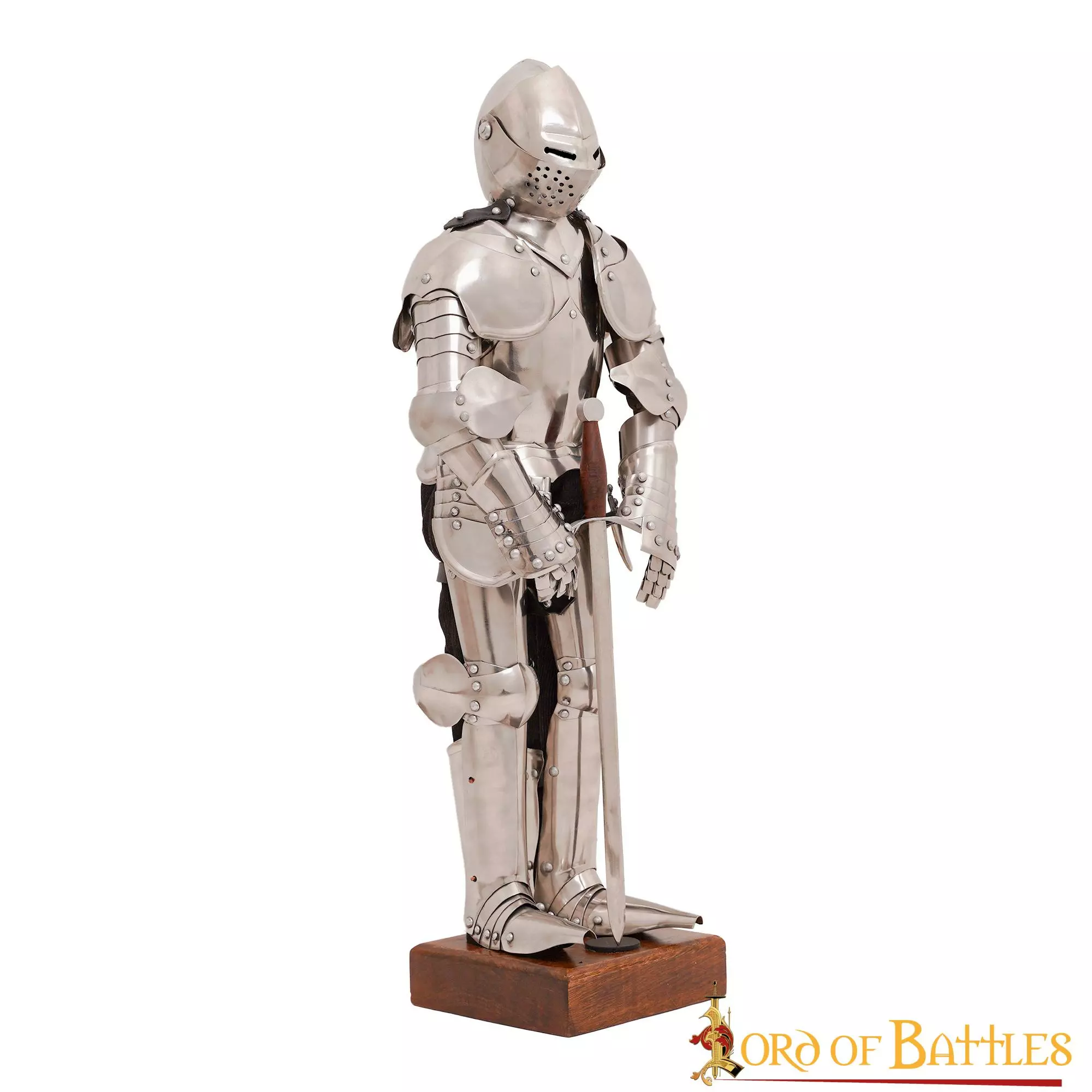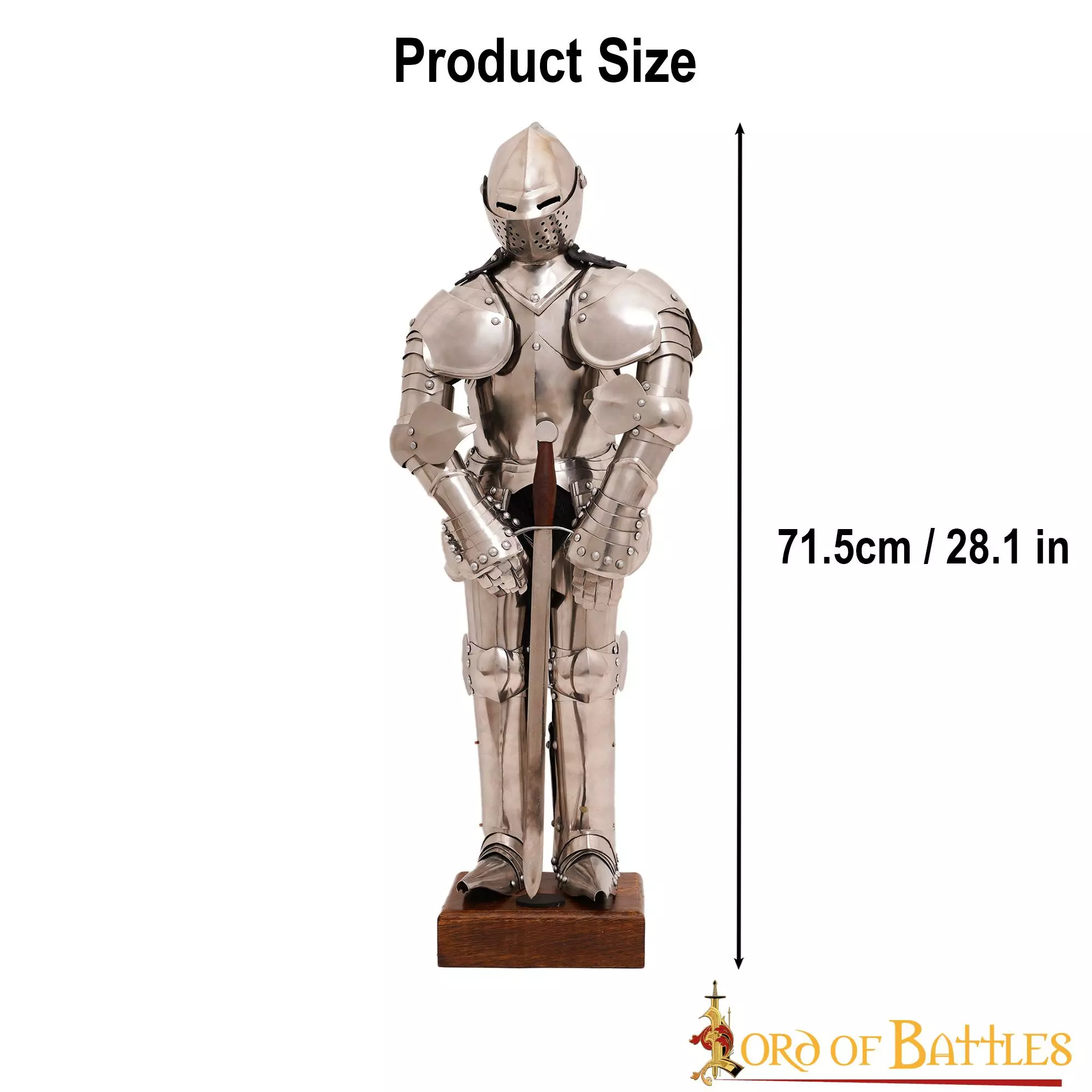 Todos los componentes de esta armadura son de acero inoxidable, por lo que son resistentes y duraderos. Su altura total (incluido el soporte de madera) es de aproximadamente 28,1 pulgadas.