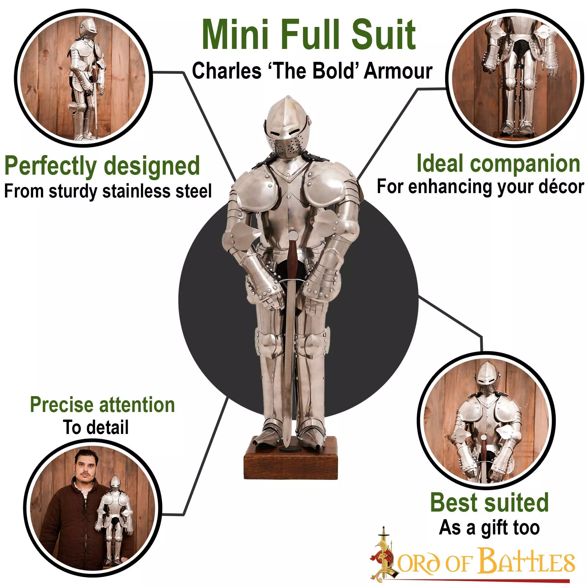 Nuestro mini traje completo está inspirado en la armadura de Carlos el Temerario, duque de Borgoña, y es perfecto para su decoración medieval o quizá para regalar a su amigo, ¡cuyo amor por la artesanía medieval nunca le aburre! Los intrincados detalles de inspiración histórica lo convierten en una extraordinaria pieza de arte para su oficina, espacio de trabajo, accesorio de regalo, decoración del hogar, etc.
