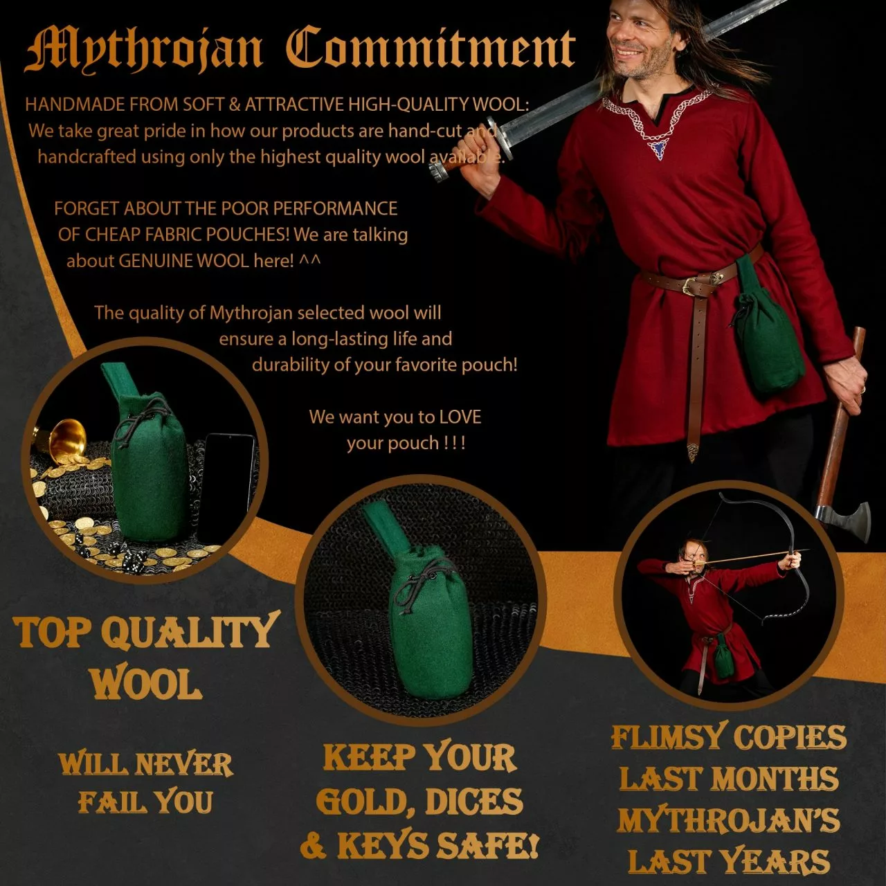 - ¡OLVÍDESE DE LAS POBRES PRESTACIONES DE LAS BOLSAS DE TELA BARATAS! Estamos hablando de LANA GENUINA. La calidad de los materiales seleccionados por Mythrojan garantizará una larga vida y durabilidad de su bolsa favorita.