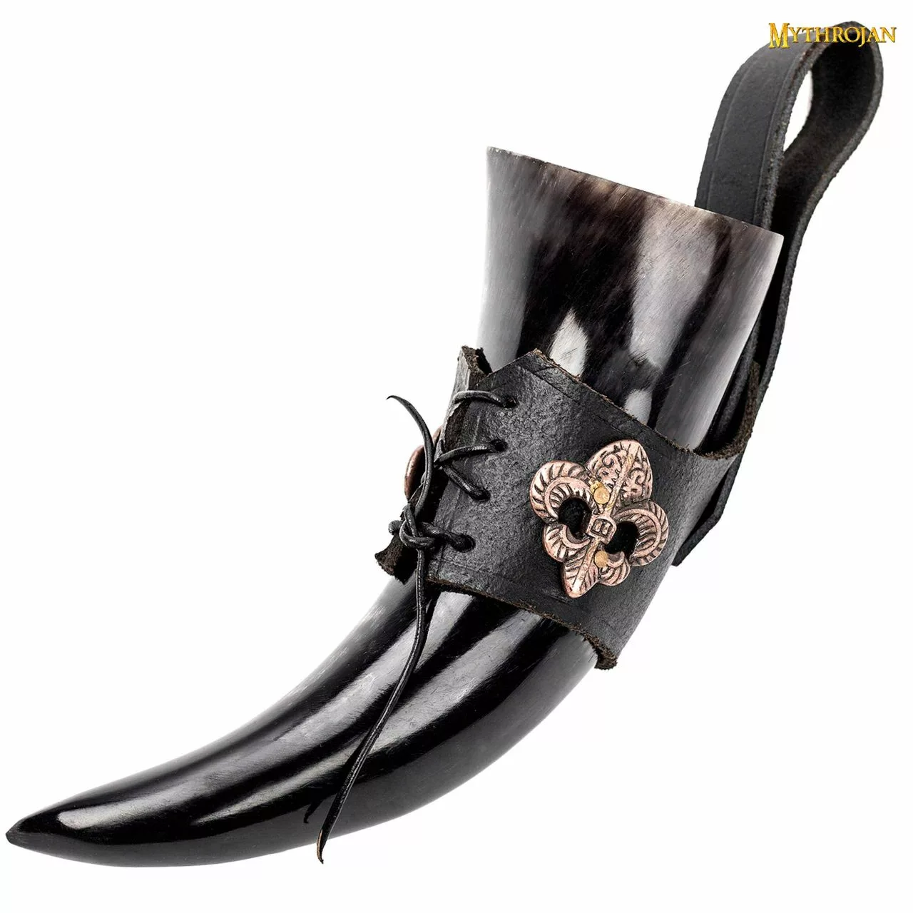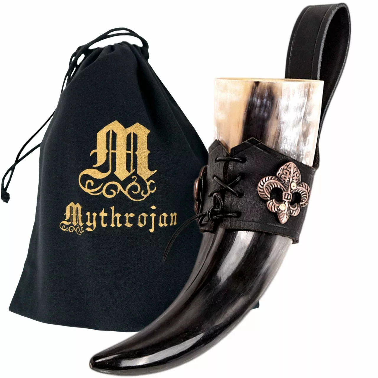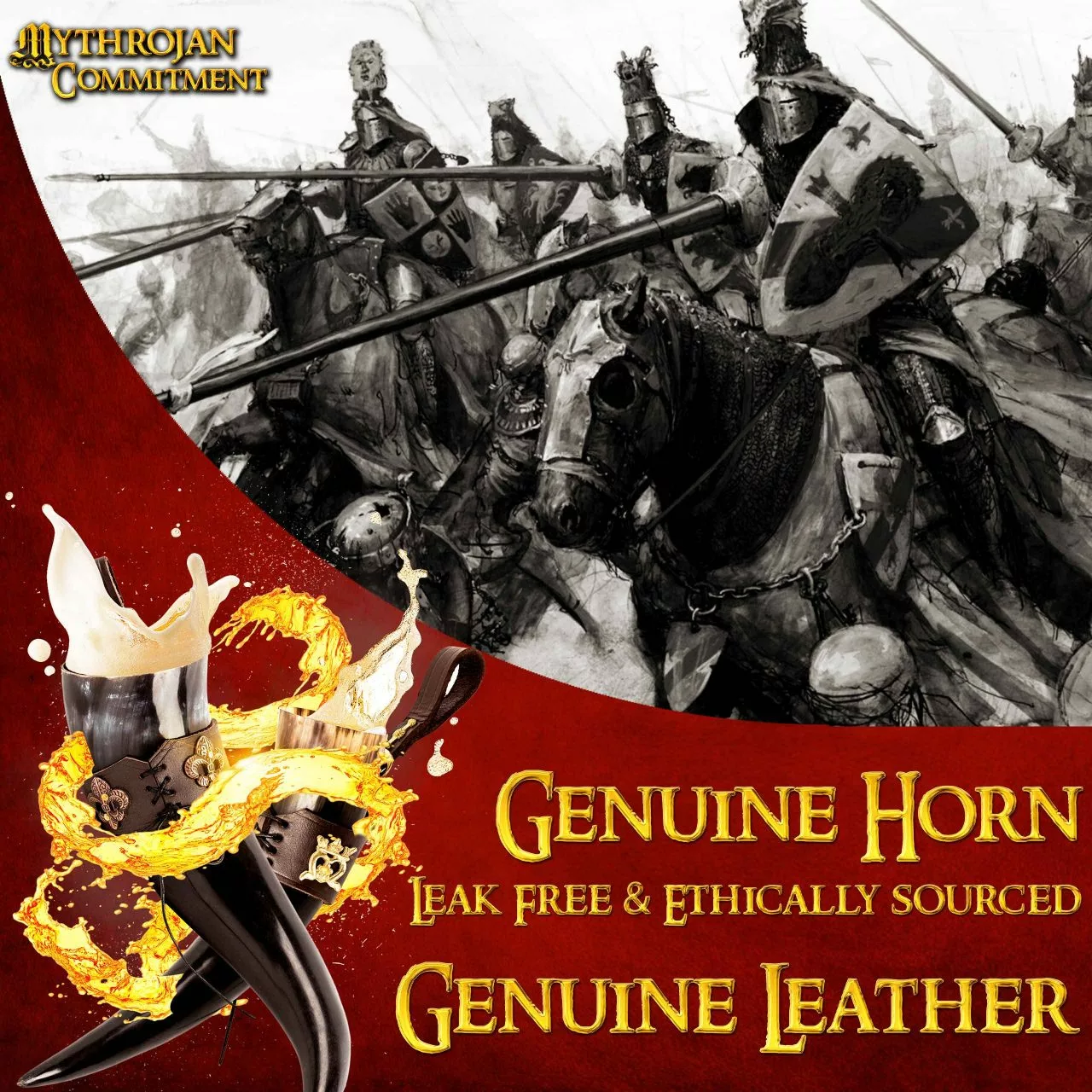 Mythrojan THE KNIGHT OF REALM Cuerno Para Beber Vikingo Con Soporte De Cuero Negro Auténtica Taza Vikinga Inspirada En La Edad Media – Acabado Pulido