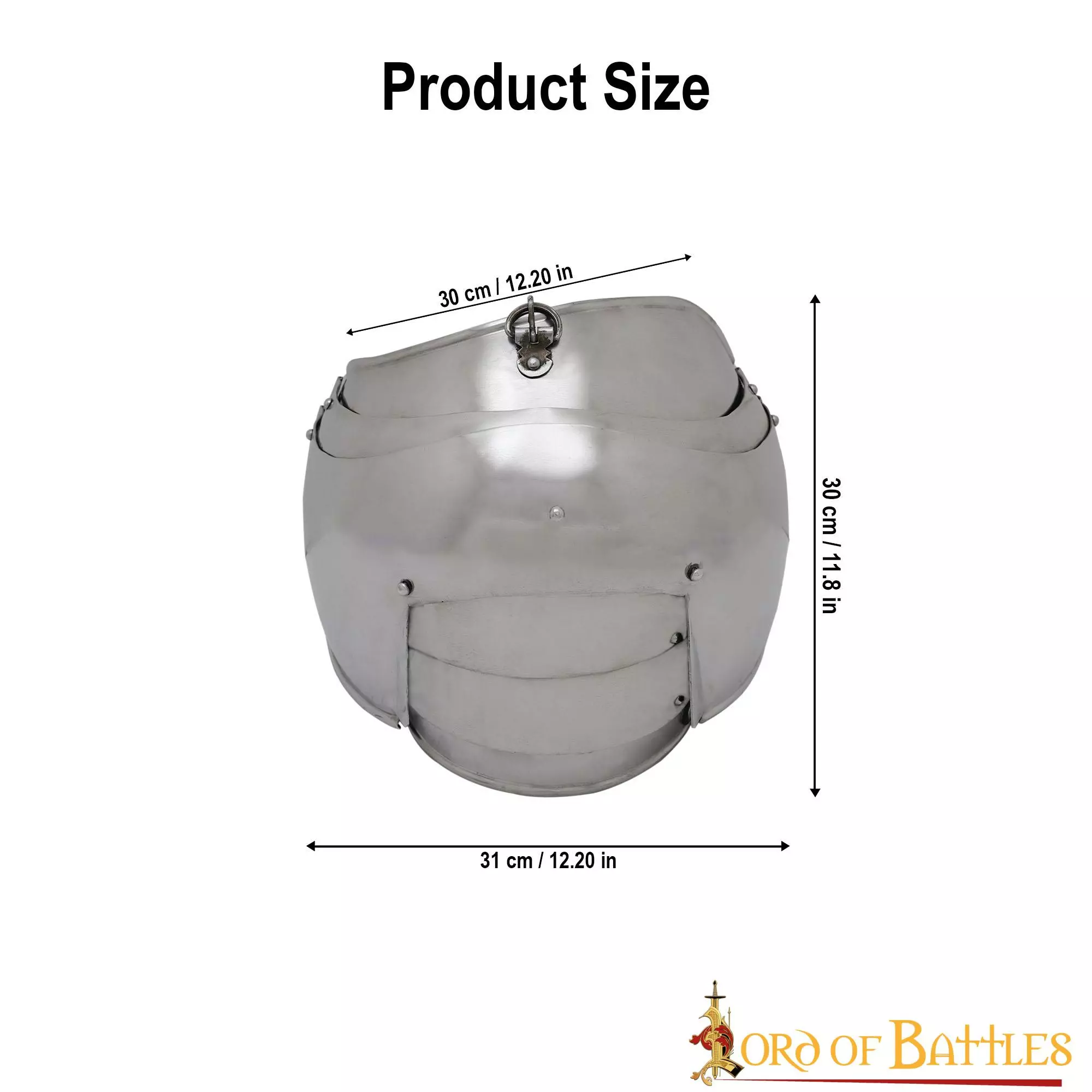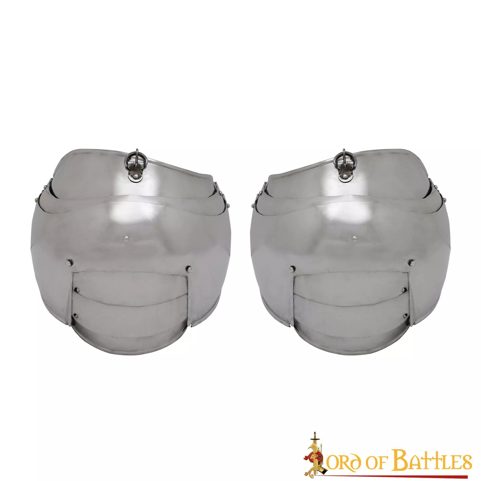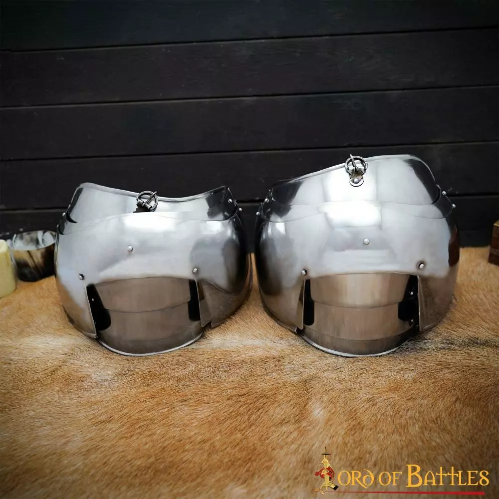 Nuestro juego de pañolones renacentistas está bien articulado para aumentar la flexibilidad y la amplitud de movimiento. Ambos tienen hebillas centrales de acero resistente que pueden anclarse fácilmente a las correas de cuero de una gorguera o pechera.